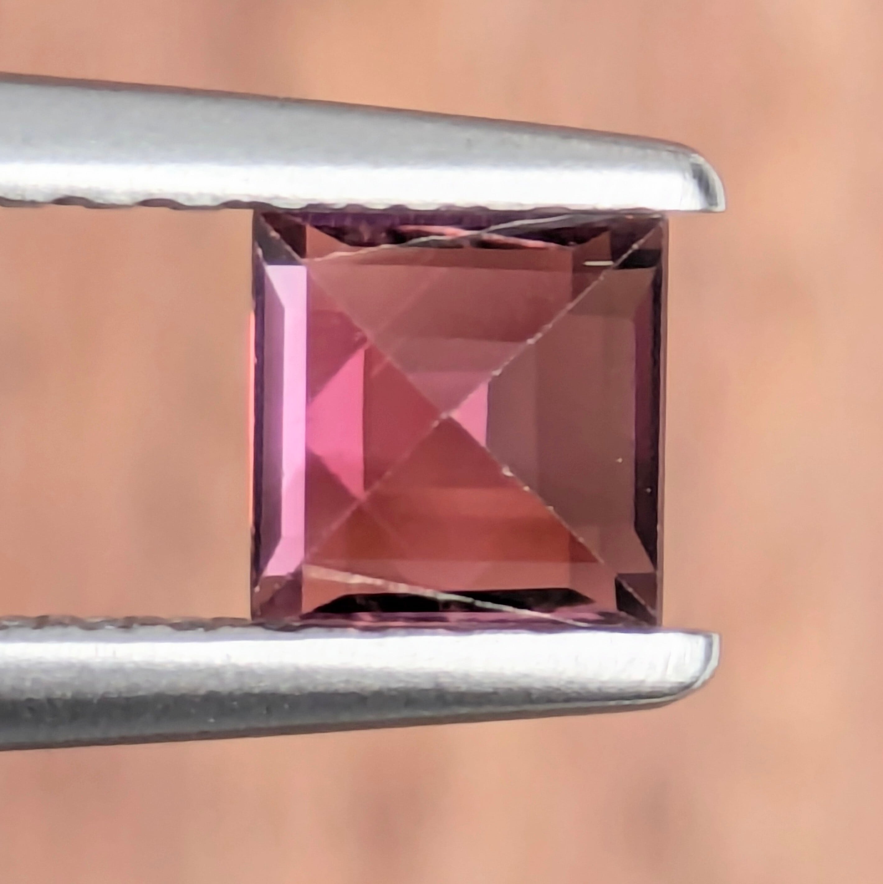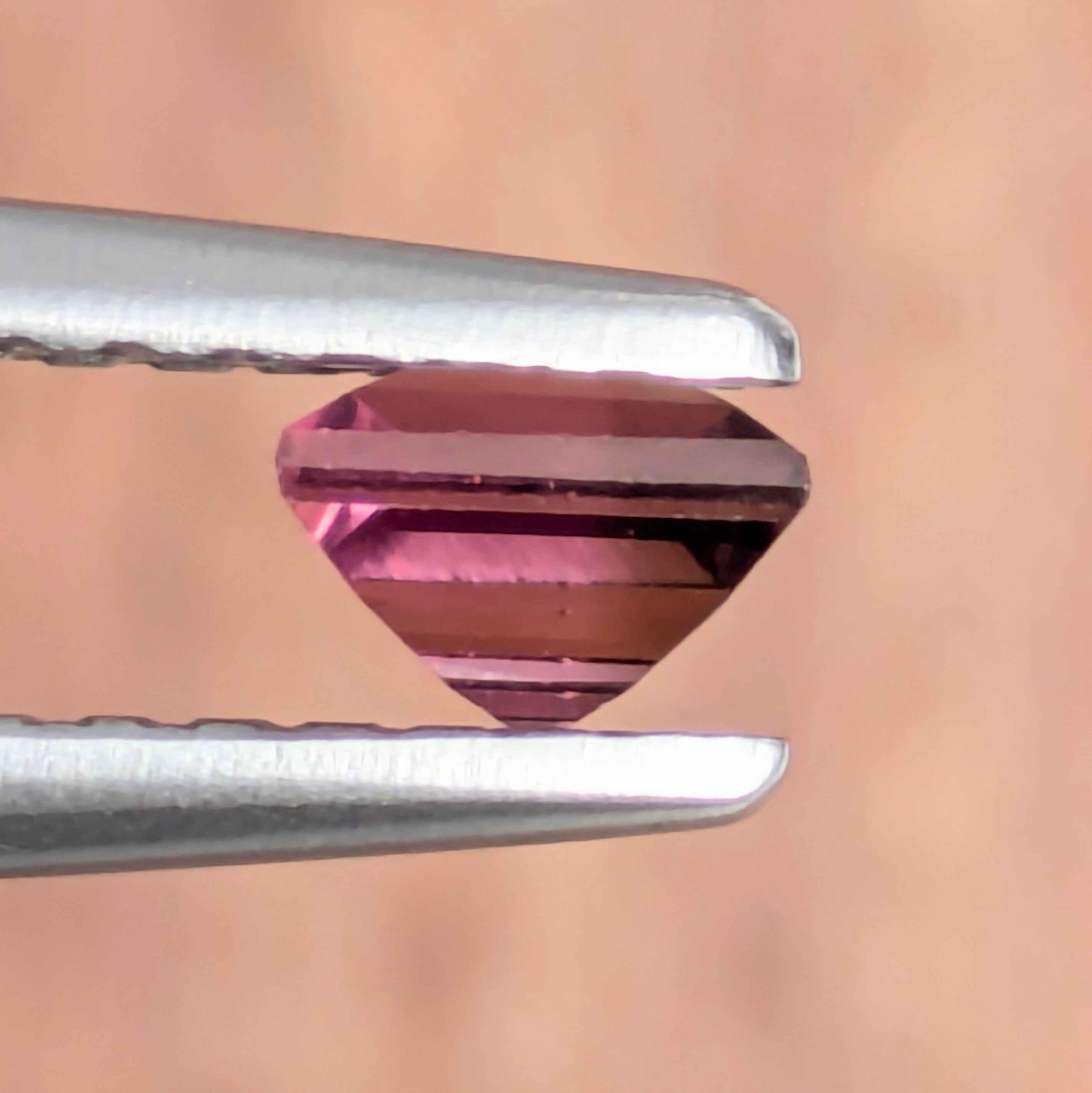 仕事が一息つき、ふと外に目を向けると窓いっぱいの夕焼け・・・というには、ちょっと青みを感じるでしょうか?空を切り取る額縁のように、いさぎの良いスクエアカット。正面から覗き込むと、何段にも層になって連なる濃淡の色合いとテリ、煌めきがとても美しい1ピース。トルマリンは一つの結晶の中で異なる色合いが存在するものも面白いですが、やはり一つは、この様な優し気でホッとする夕暮れ色の結晶もコレクションしたいものです。