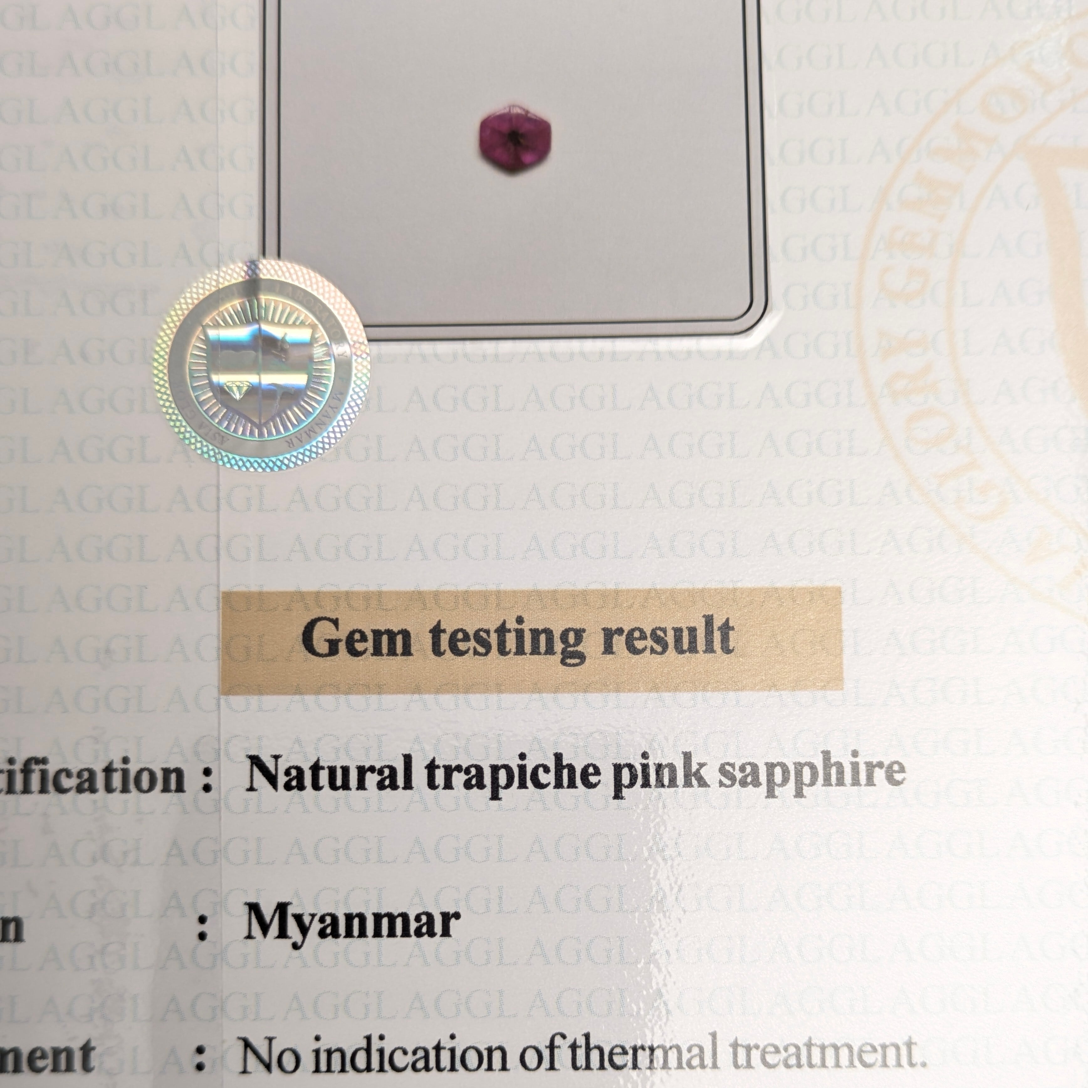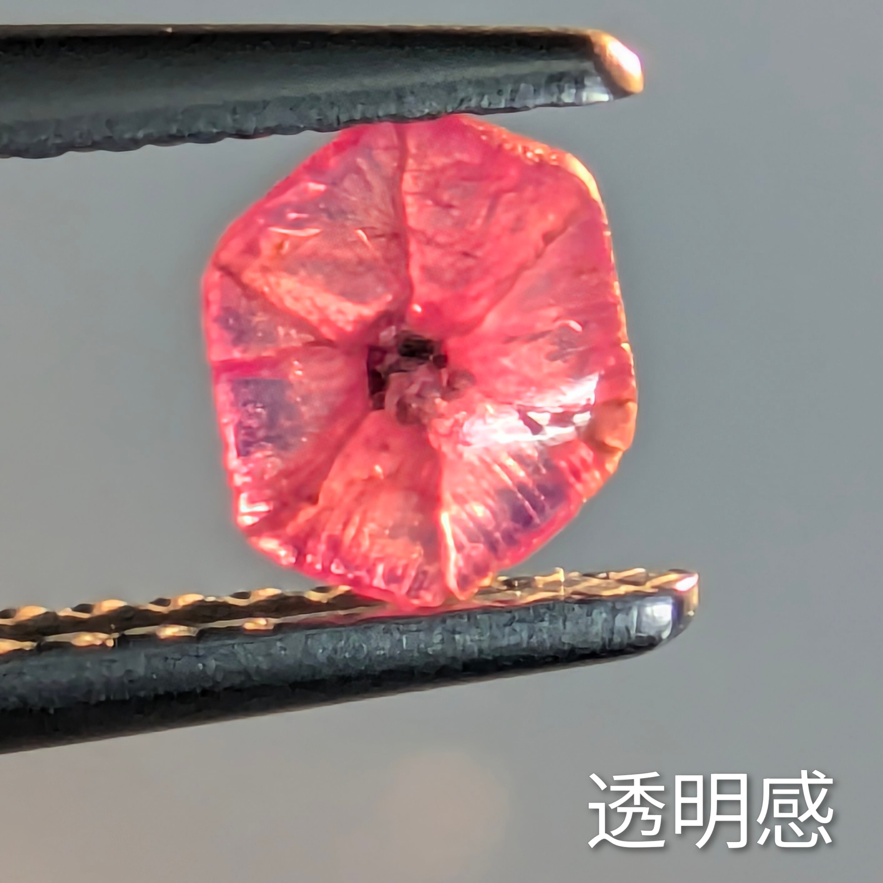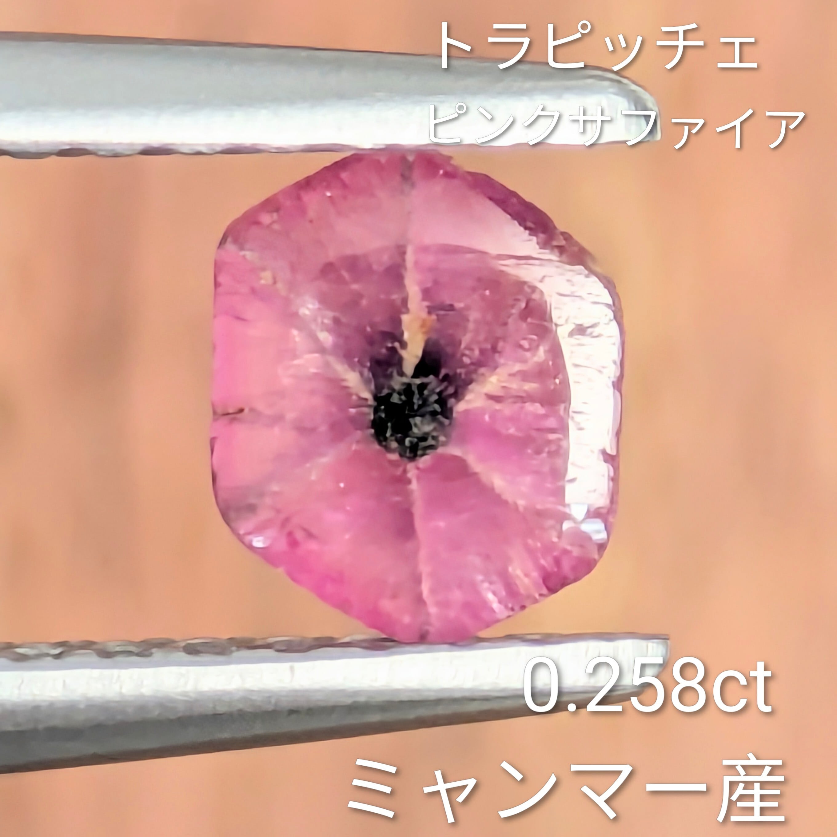 当店でお取り扱いしているトラピッチェ・シリーズは、色はもちろん透明感も比較的感じられる厳選したものを取り揃えておりますが、今回の1ピースは特に一目で「透き通っているなあ」と感動するトラピッチェ・ピンクサファイア。通常はこの“車輪模様”を示す6条の線部分は黒色のことが多いのですが、今回のものはなんとゴールド・カラー!もちろん、本物の金ではないですが、ちょっと個性的な美しさを持った子です。