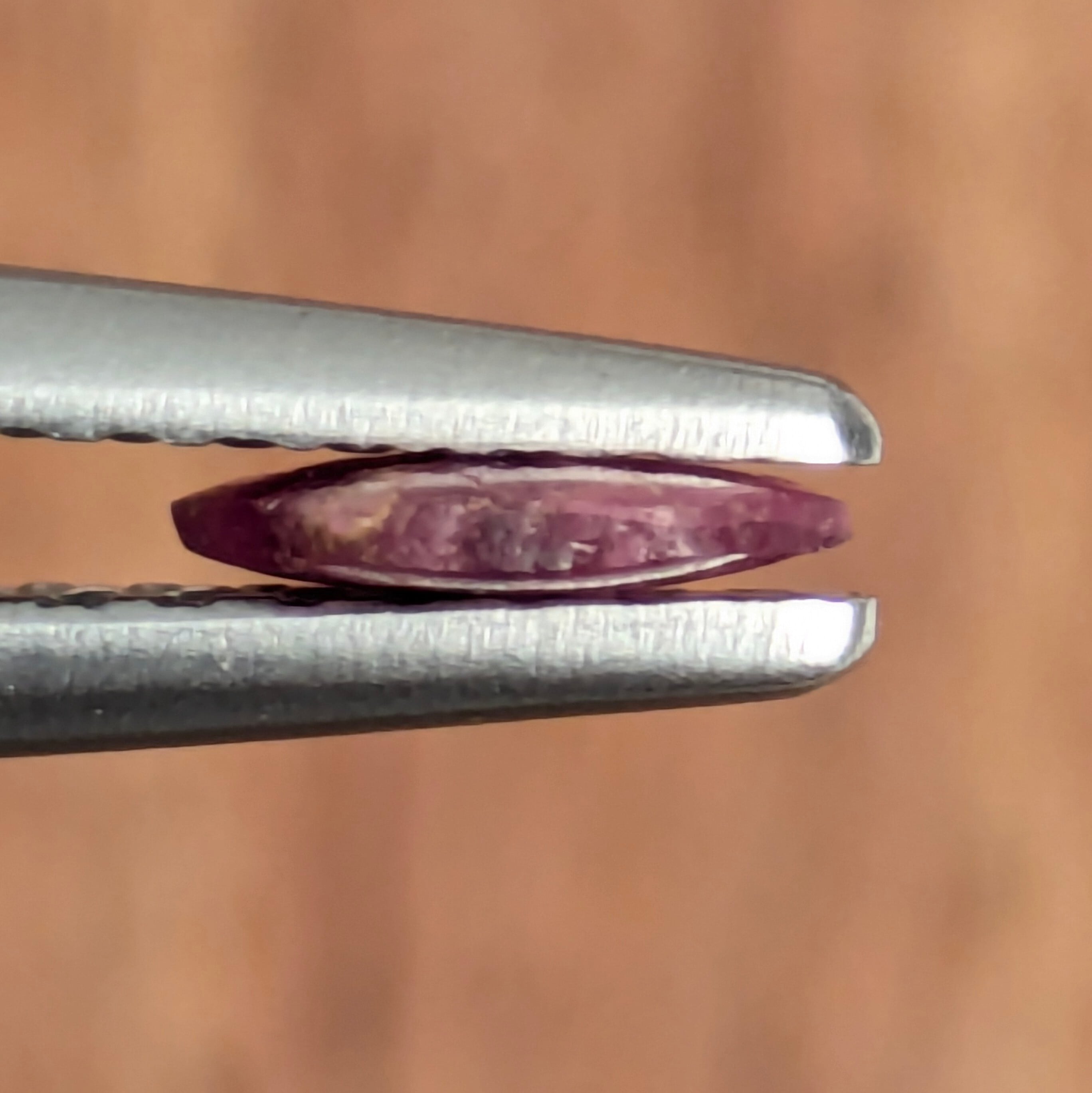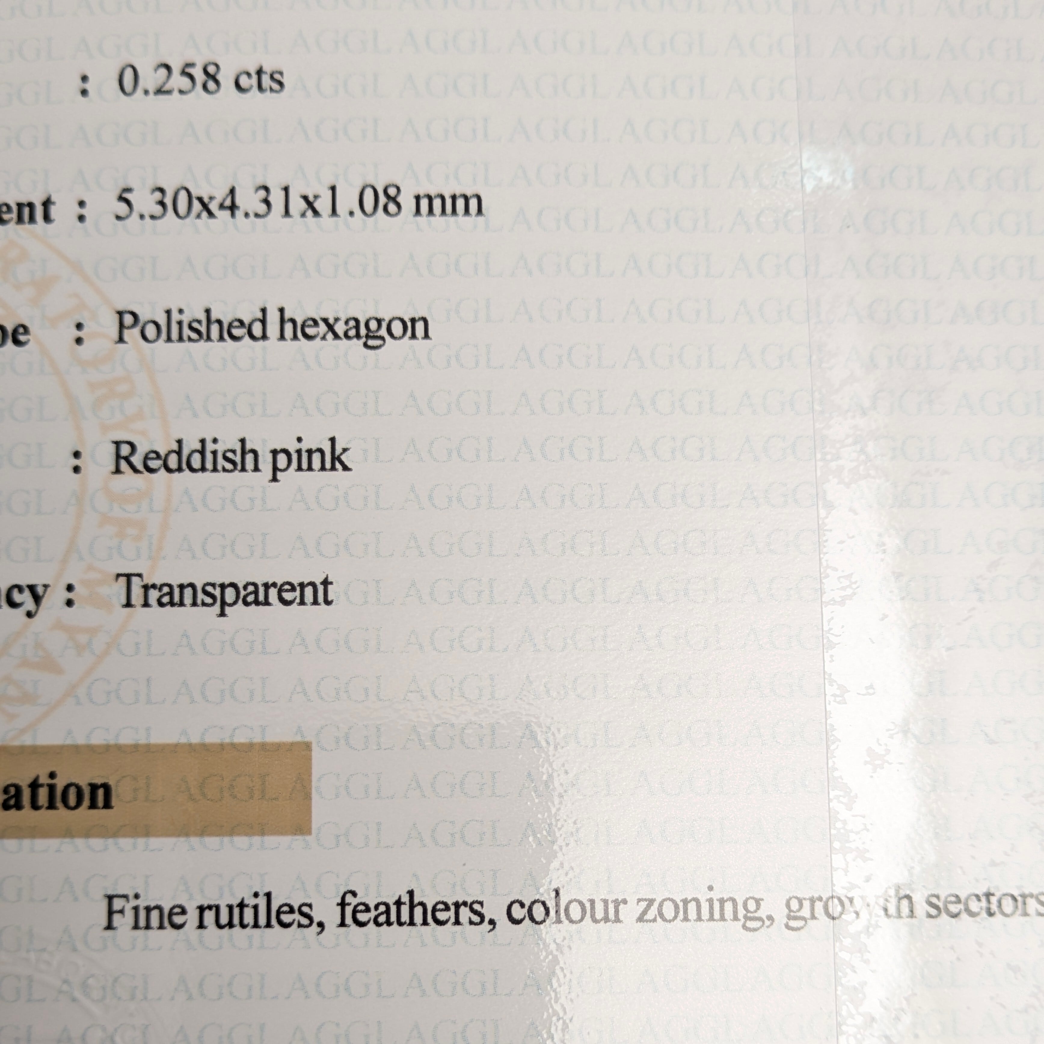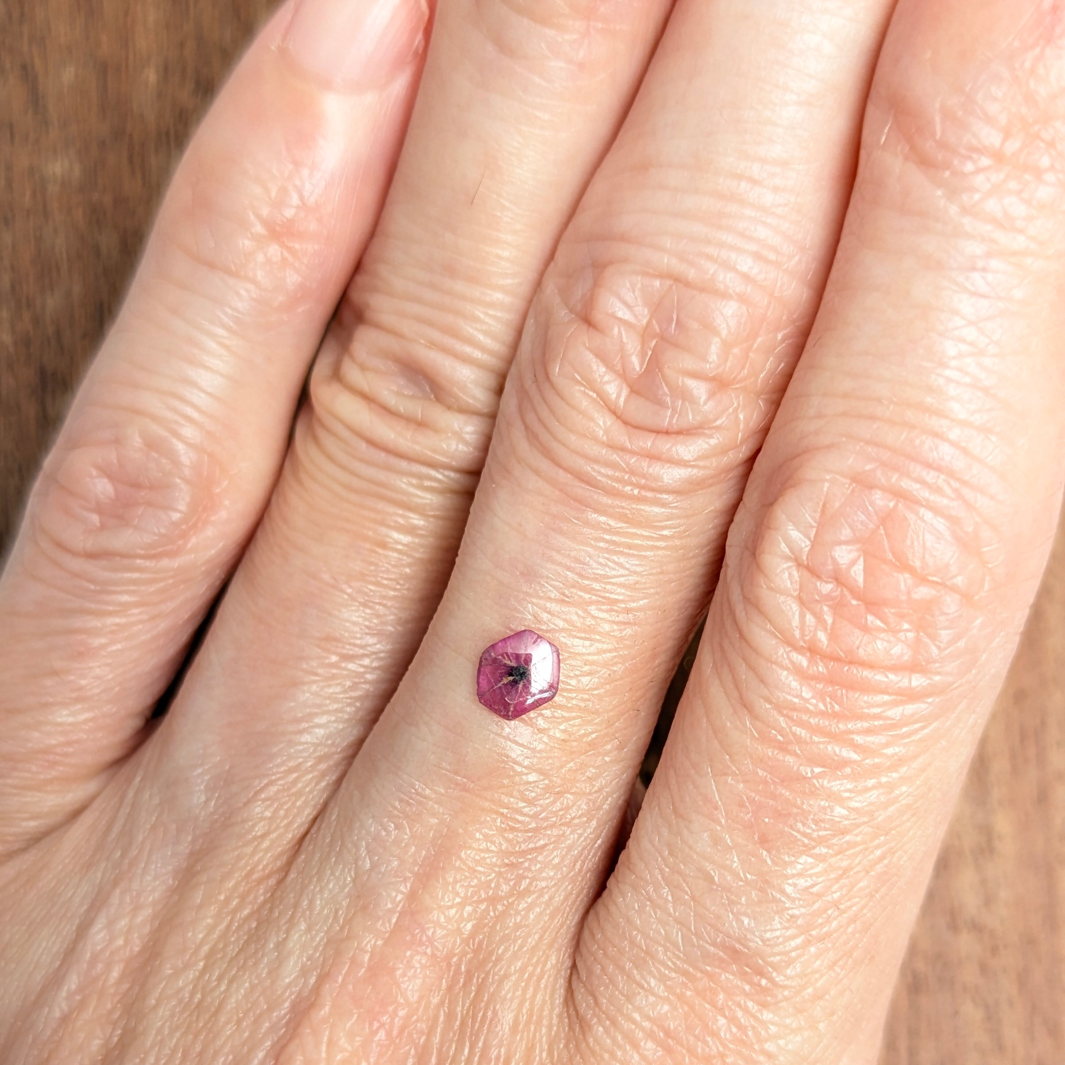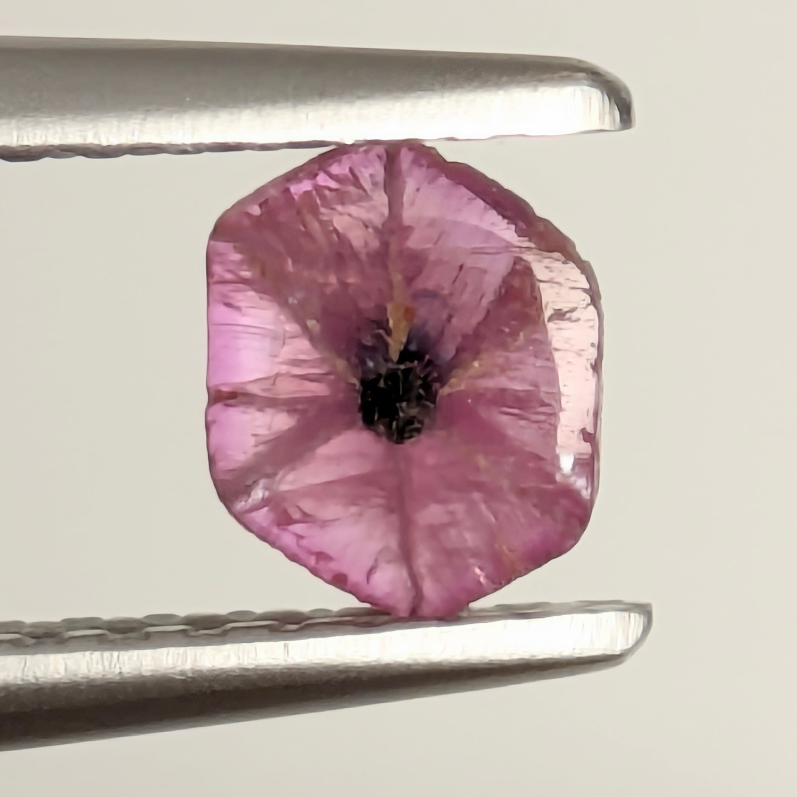 当店でお取り扱いしているトラピッチェ・シリーズは、色はもちろん透明感も比較的感じられる厳選したものを取り揃えておりますが、今回の1ピースは特に一目で「透き通っているなあ」と感動するトラピッチェ・ピンクサファイア。通常はこの“車輪模様”を示す6条の線部分は黒色のことが多いのですが、今回のものはなんとゴールド・カラー!もちろん、本物の金ではないですが、ちょっと個性的な美しさを持った子です。