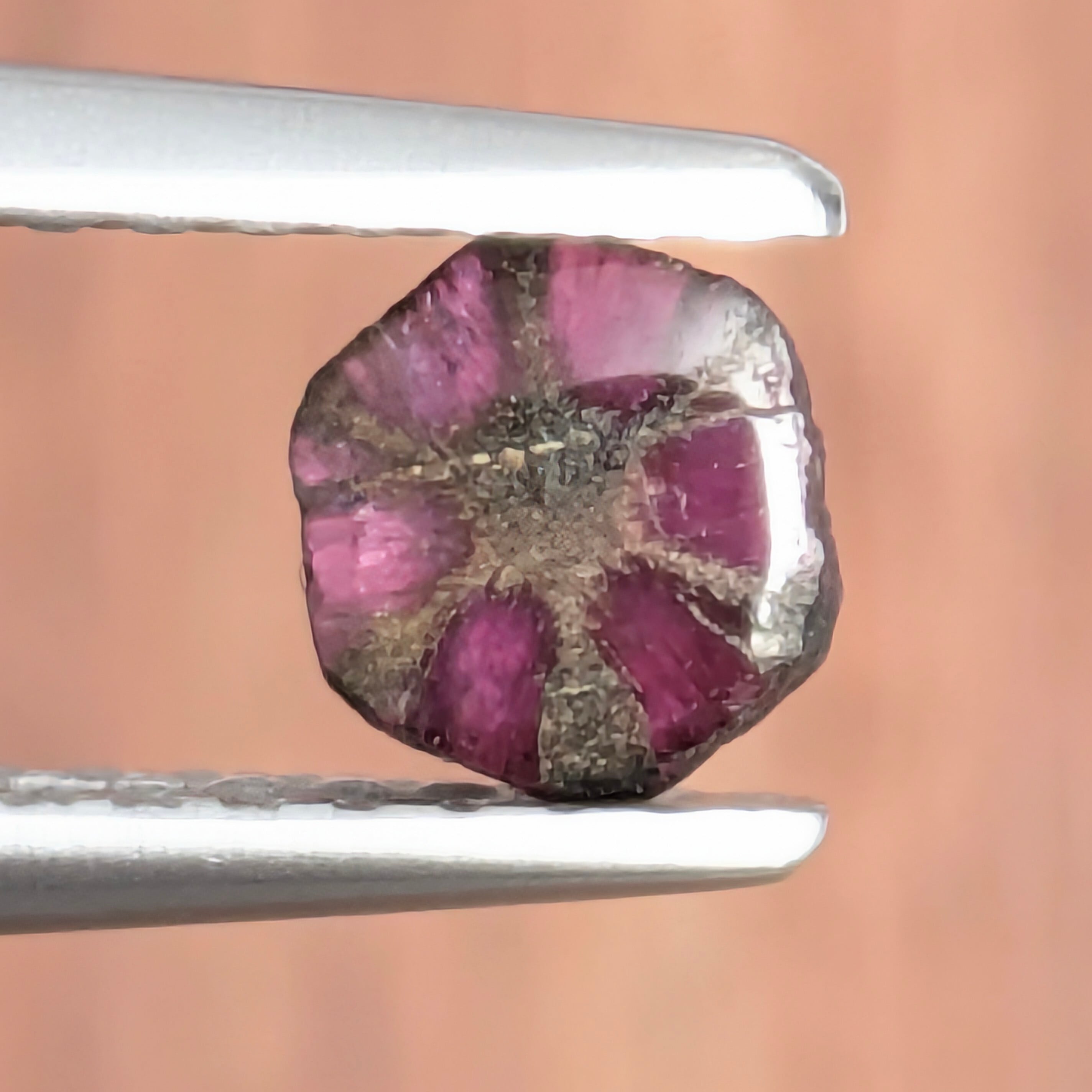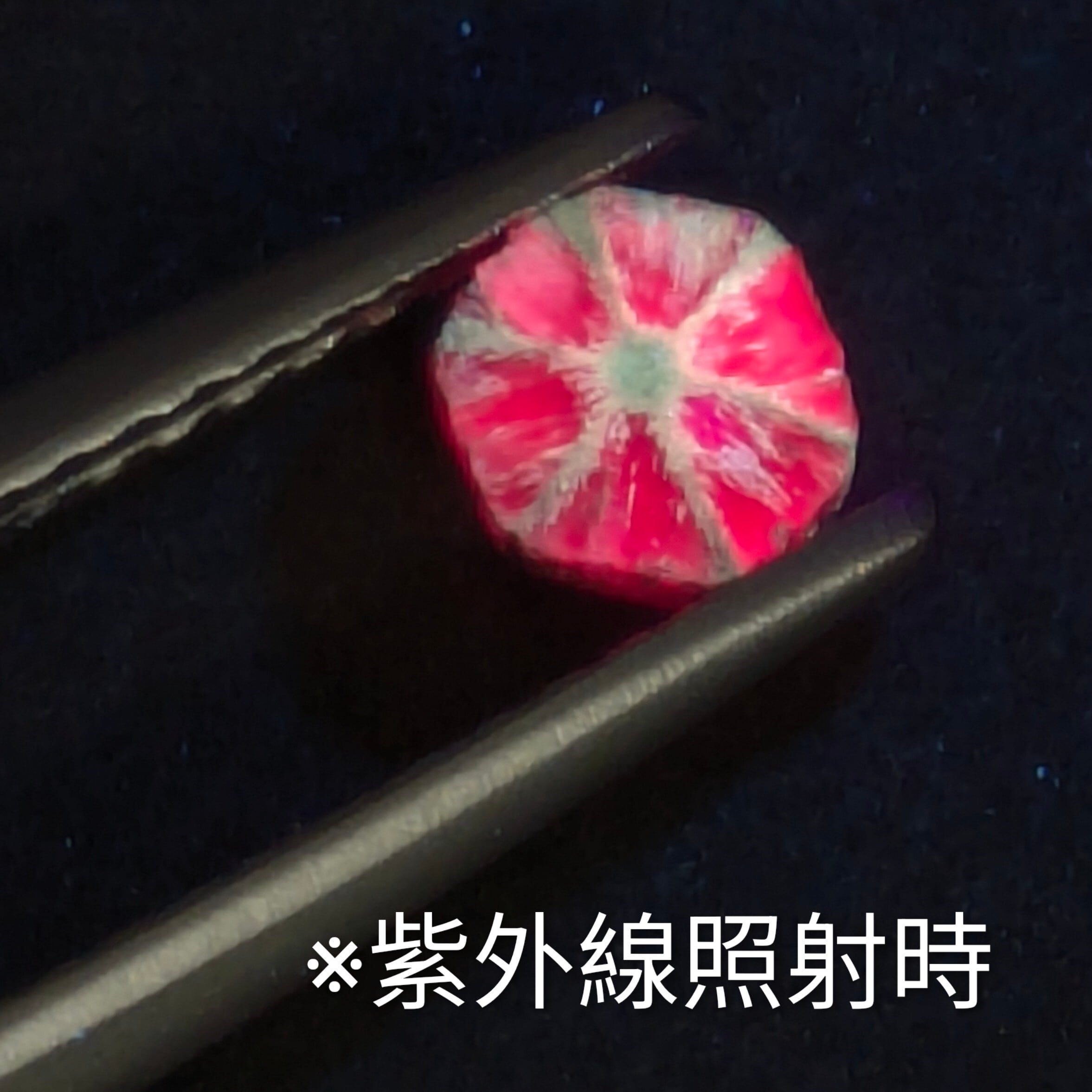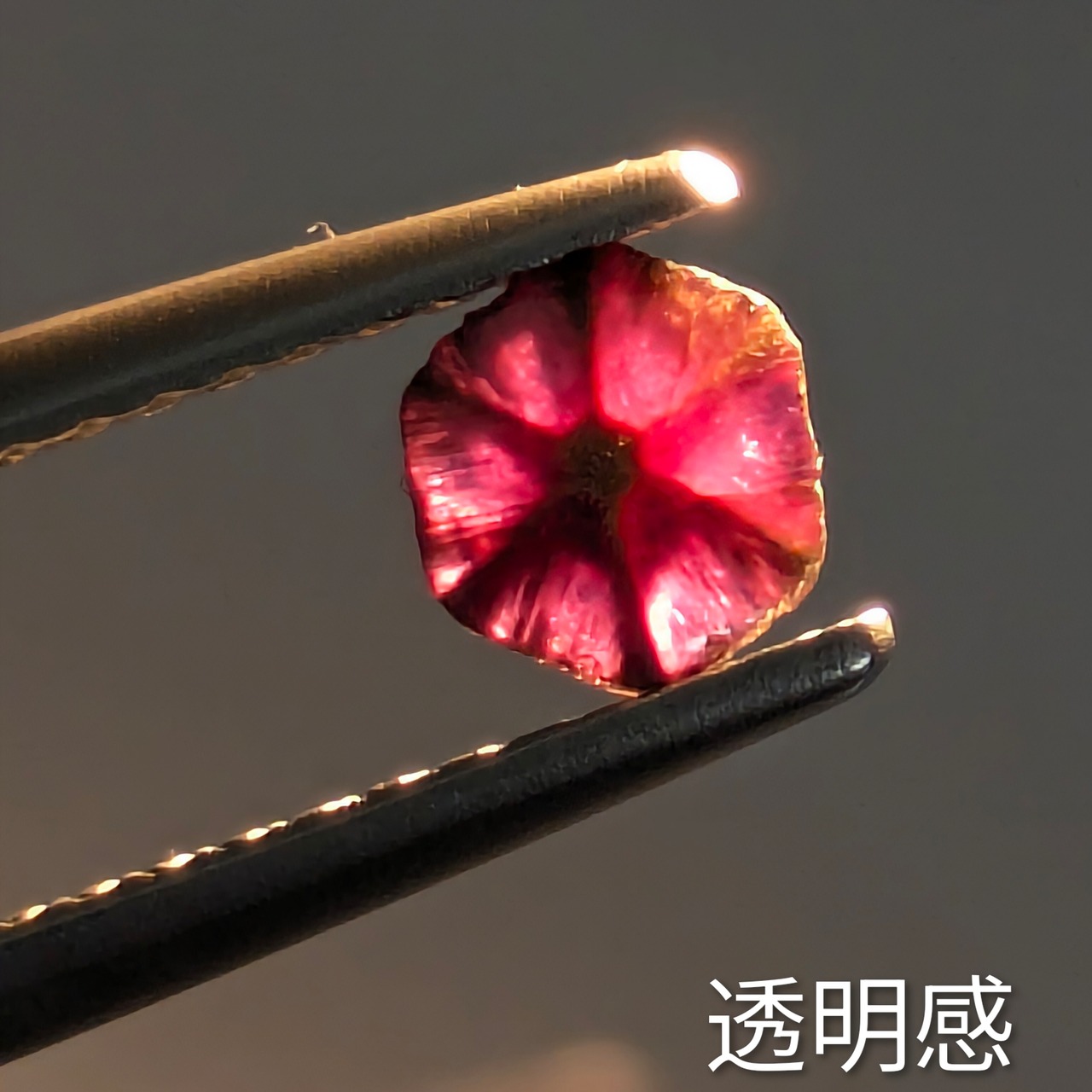 ノエルの季節が近づいてきているからなのか・・・深いパ―プリッシュ・レッドのルビーに刻まれた6条の線が、まるで雪の結晶のようにも感じられる1粒。焚火越しに舞い落ちる雪たちの、ほんの一瞬をとらえて宝石にしたような「トラピッチェ・ルビー」です。ブラックライトにあてると燃え上がるように赤く輝き、一瞬で溶けるそのわずかな瞬間の姿を垣間見たかのような、そんな幻想的な気分になります。