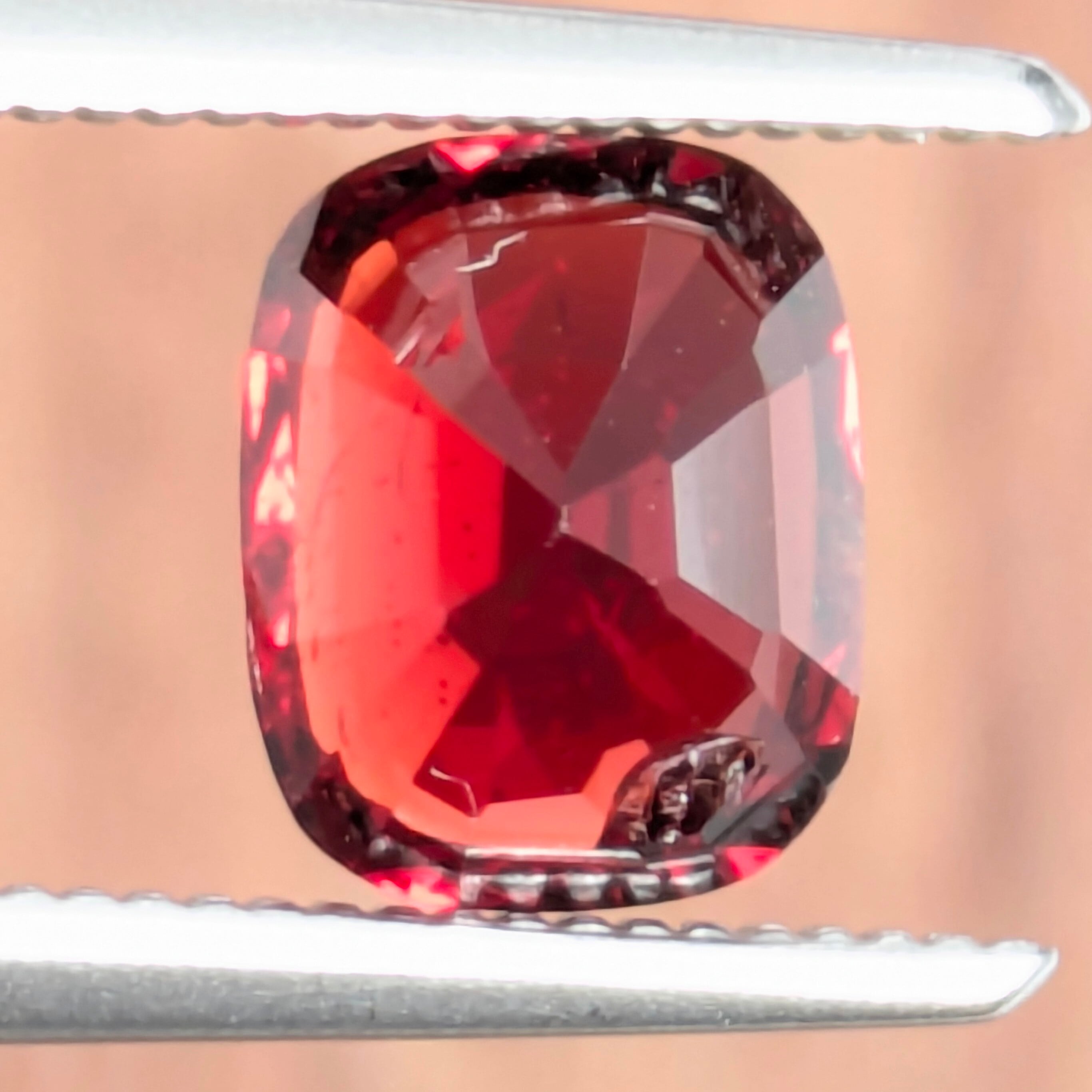 女神の爪を彩る、真っ赤なマニキュアだろうか・・・?宝石にしか出せない、煌めきと輝き、テリと美しい赤色に心を奪われる1ピースです。幾重にも重なり、様々なトーンで輝く多彩なレッドは、いくら見ていても見飽きたりない魅力を放っています。パビリオン面に見られる凹みは、欠けではなく“生地足らず”。原石のころの名残を残したまま、現代の美しさの基準に挑む、そんな力強い1ピースです。