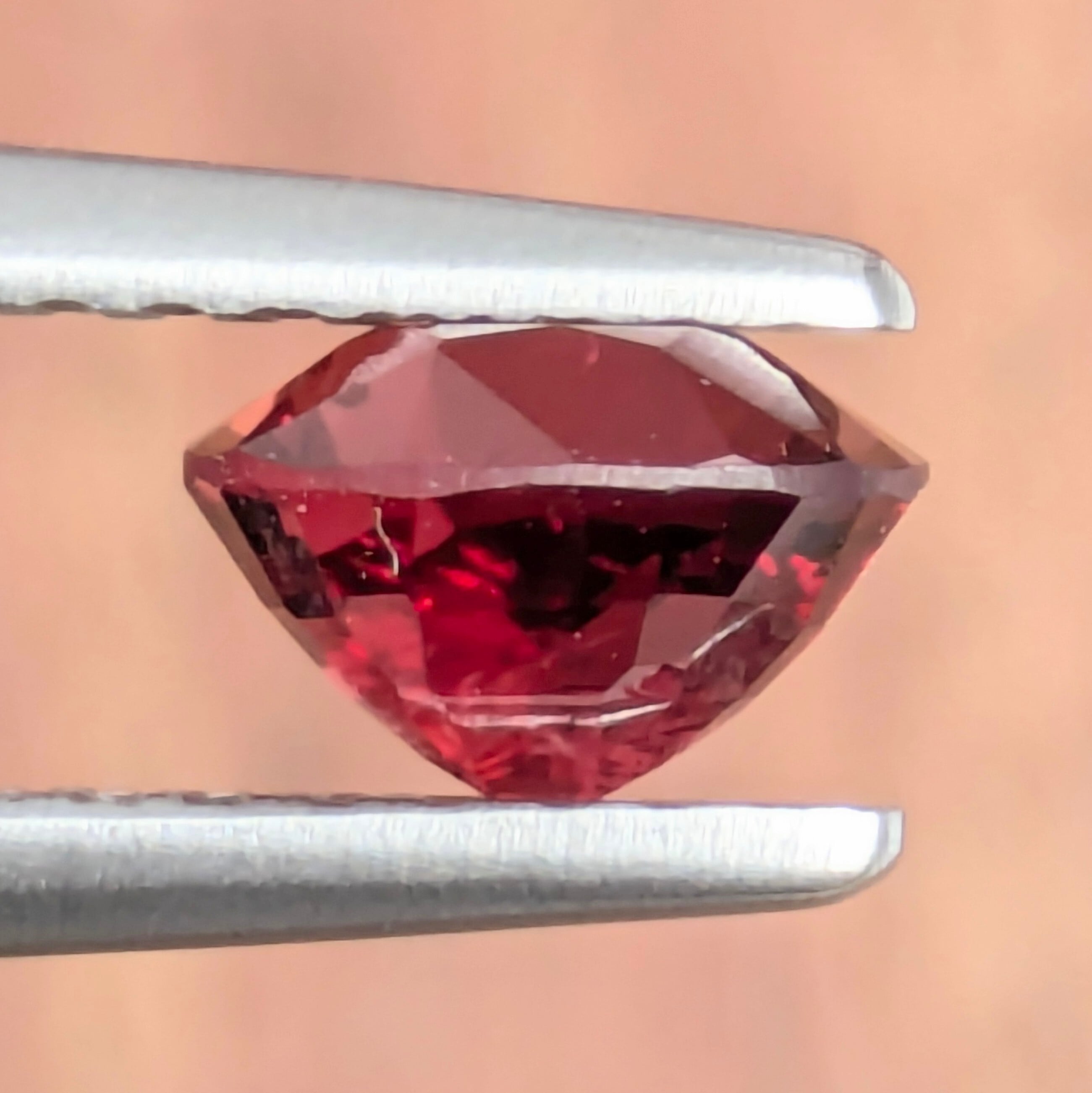 ほんと~にごくわずか、オレンジ味をかんでるかな?・・・といった風情の、限りなく鮮やかな赤色のスピネル。インクルージョンはありますが視認性の低い透明系のフェザーで、石の耐久性にも肉眼での美しさにも影響はありません。“赤の要塞”とも言えるような、あらゆる色相の赤色がギュッと詰まった1粒。角度を変えるたびに、「こんな私もいるのよ」と、また違った輝きの表情を見せてくれるのが面白い1ピースです。