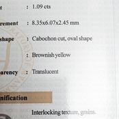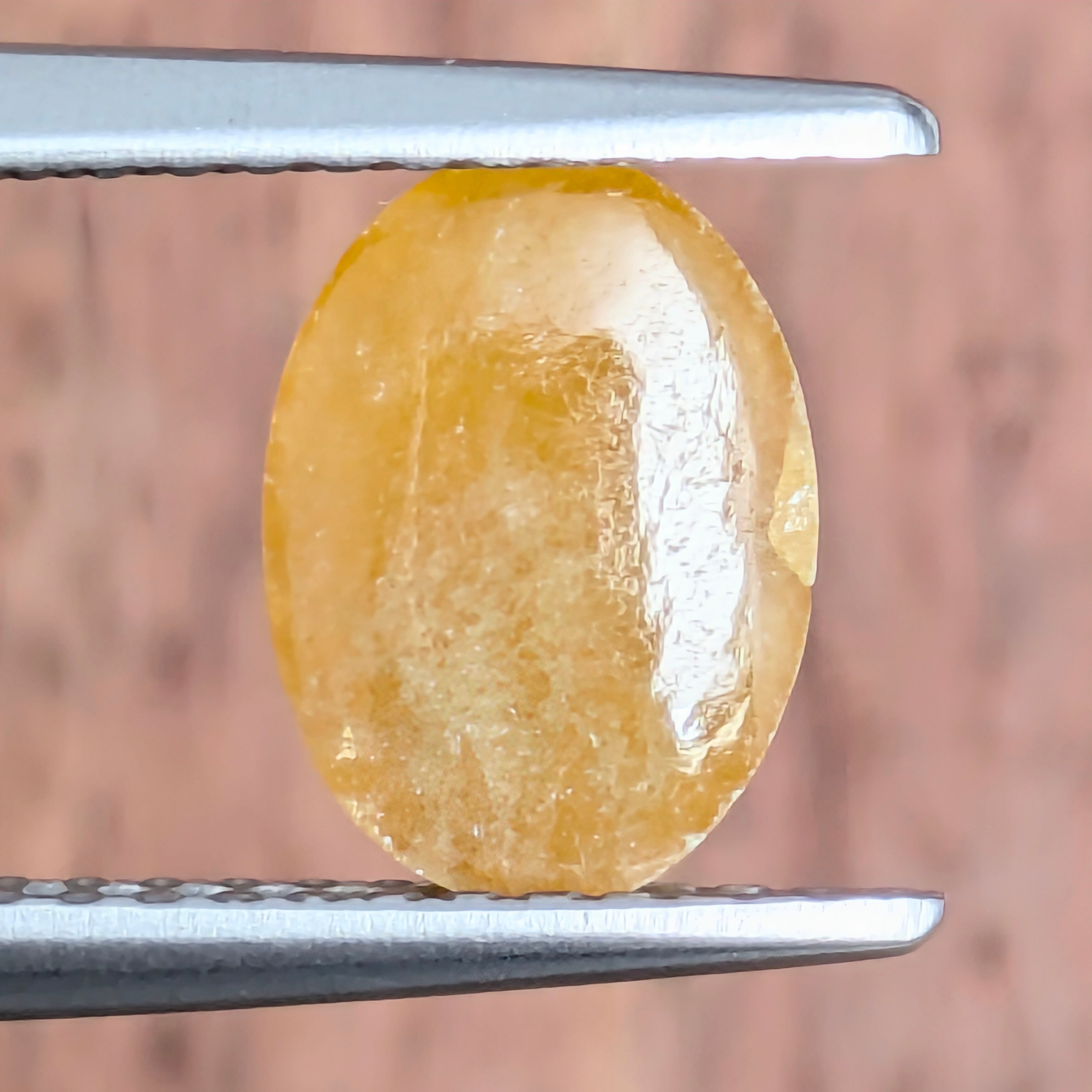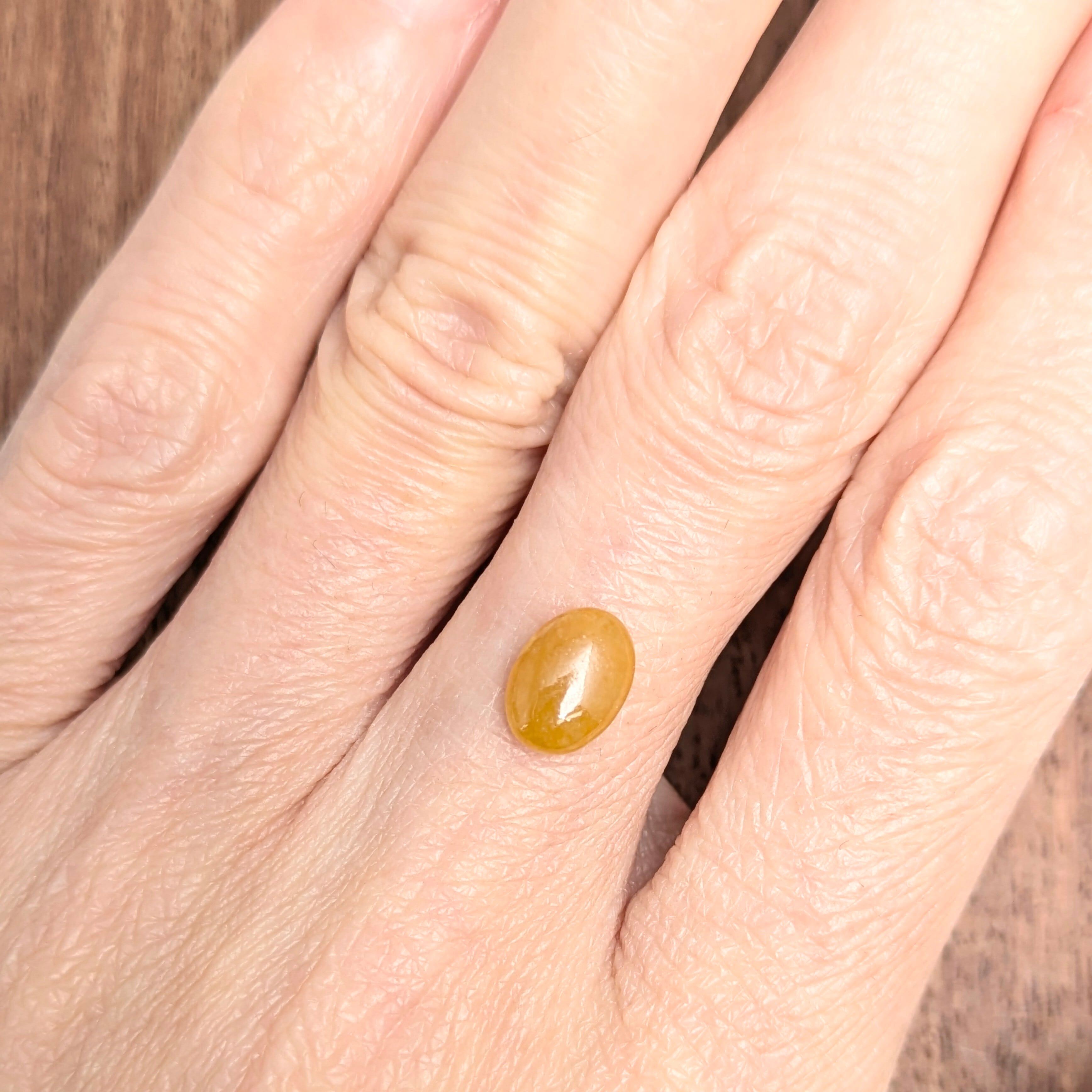 カラーグレードは「ブラウニッシュ・イエロー」、肉眼での印象はオレンジ味を感じるとても可愛らしいジェイダイト(翡翠)です。鑑別書に記載があるように、このジェイダイトに関しては色の原因が特定できていません(色は天然のカラーです)。ギュッと果肉が詰まった100パーセントのミカンジュースのような、とってもジューシィな雰囲気。ツヤツヤの艶めきと、うっすらとした透明感にも心がときめきます。