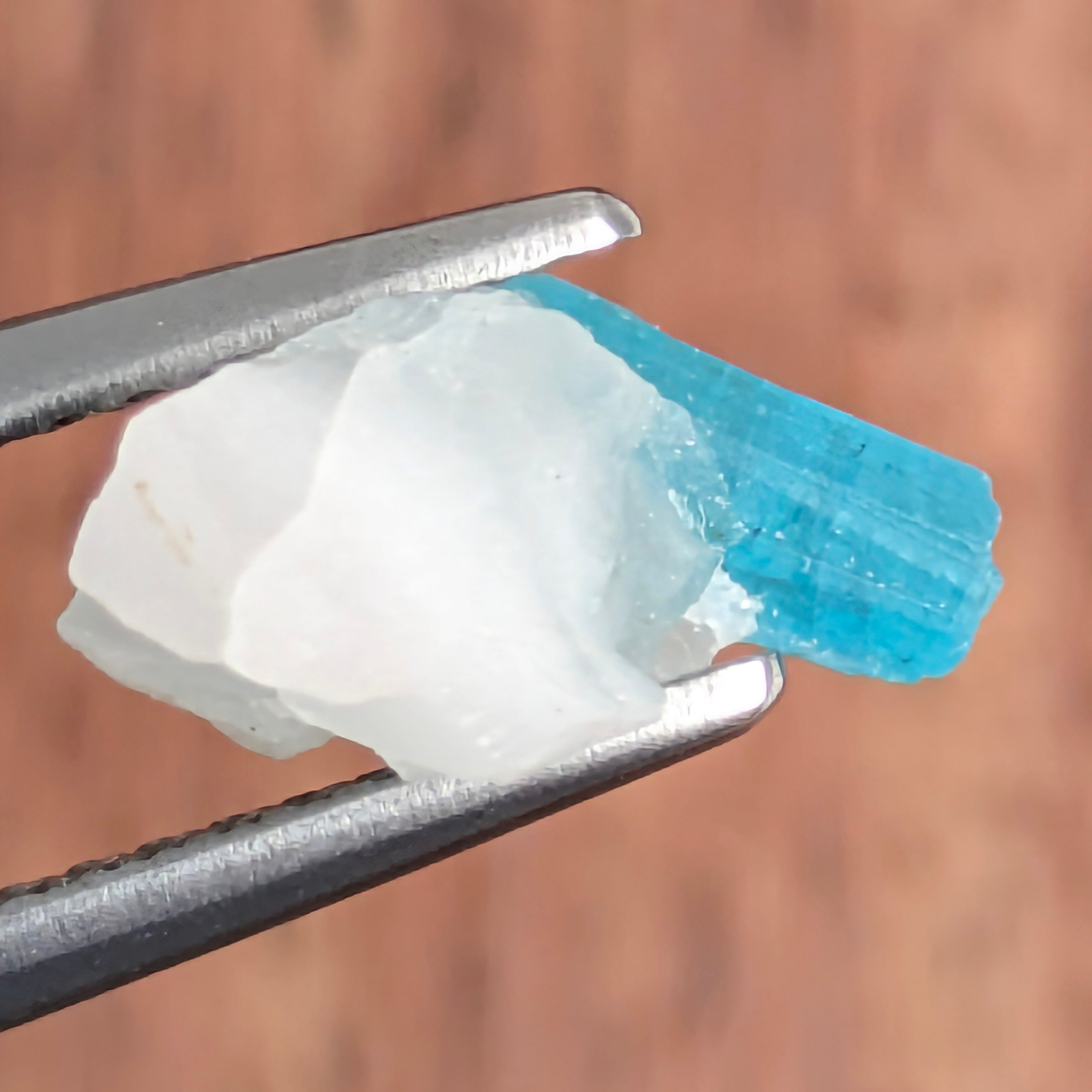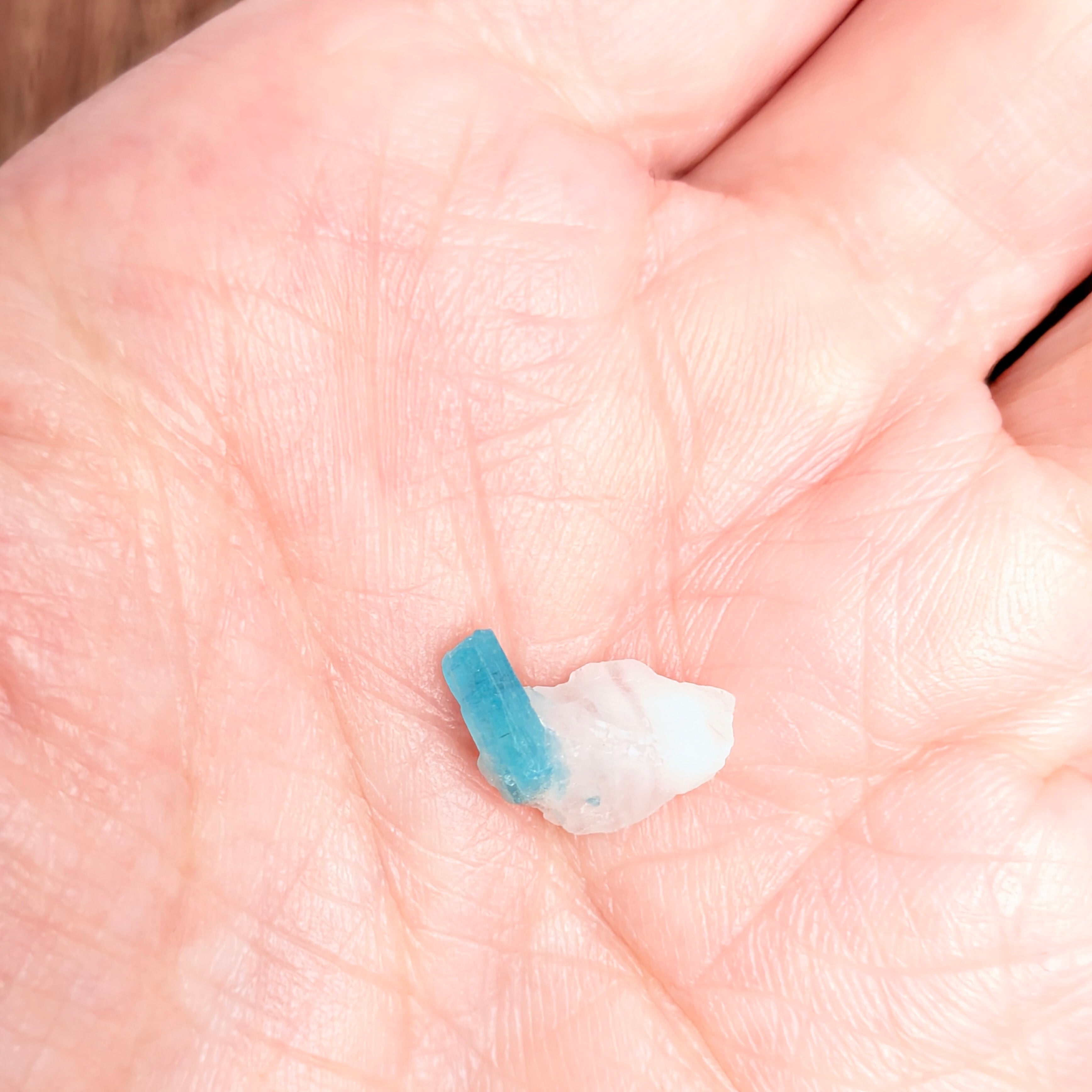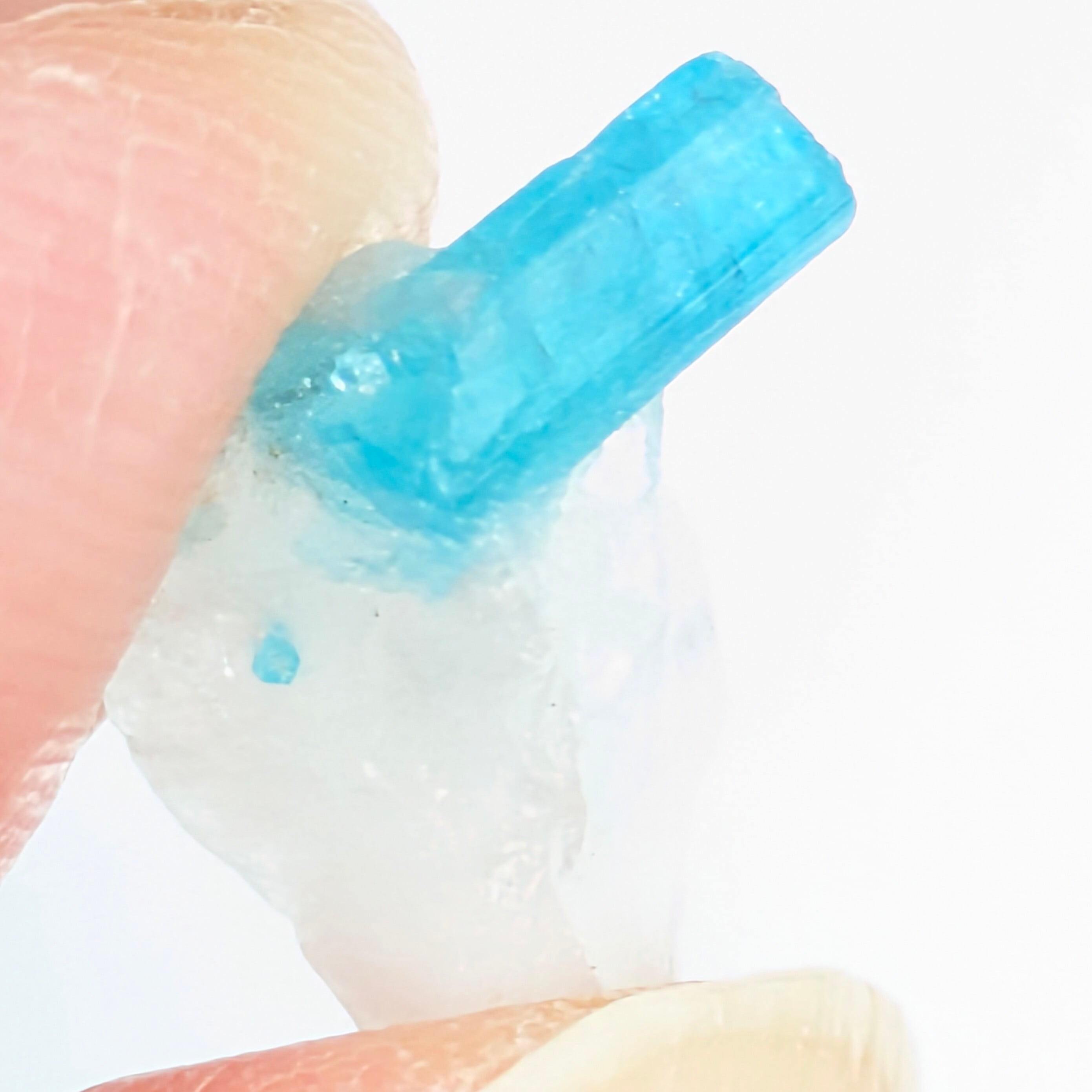 ご覧ください・・・!この色!形!艶めき・・・!名乗らずともご存じの通り、「パライバトルマリン原石」です。乳白色のお空の雲のような石英に鎮座する、目を疑うほどのネオン・ブルー。角度を変えるたびにその結晶面は煌めきます。結晶の長手方向に何本もの条線が走っていますが、これこそが「トルマリン」の原石の特徴。引っ張ったらポコッと取れそうなほどにきれいにはまっているその姿は、美しく可愛らしく、ウットリといつまでも見惚れてしまいます。