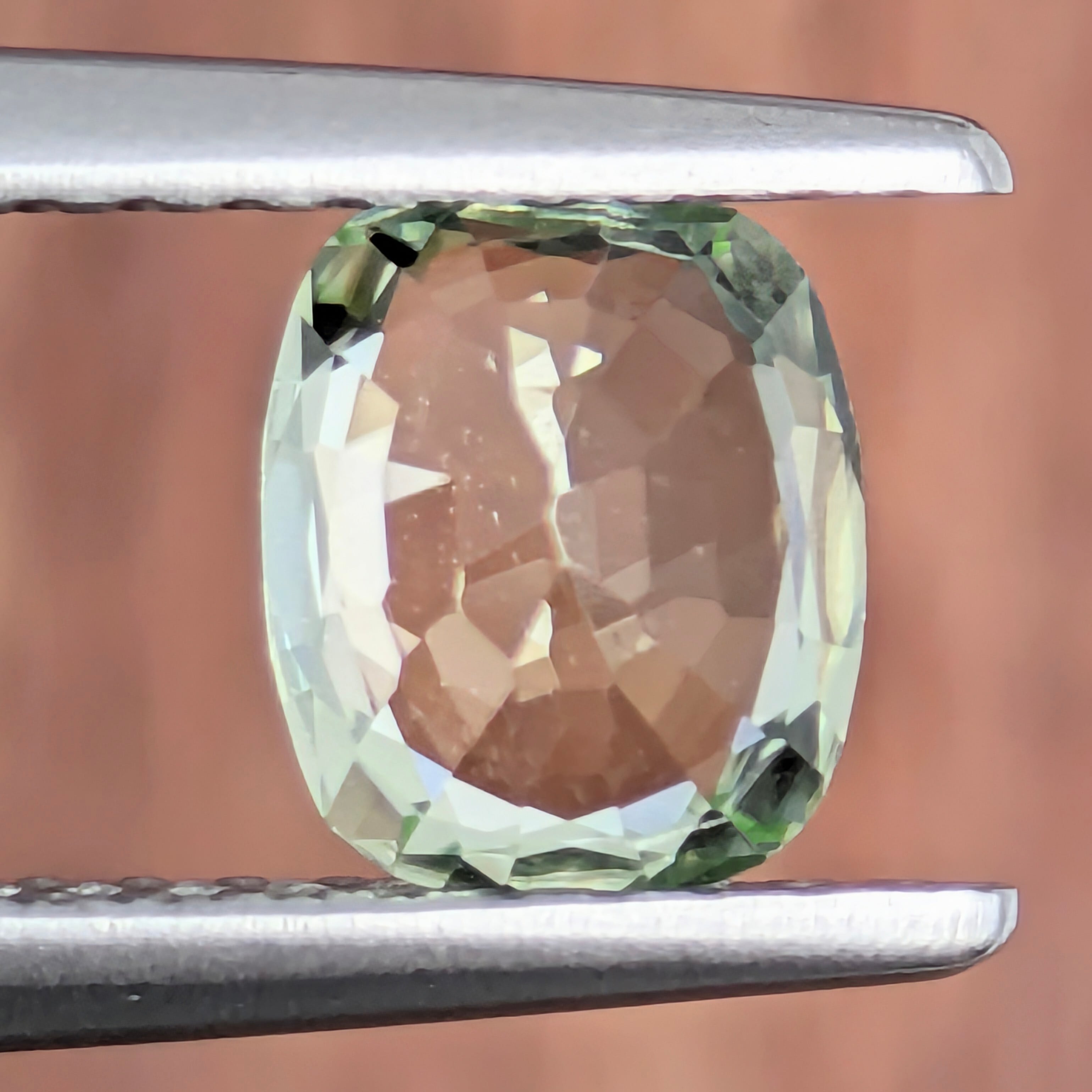 現地に直接買い付けに行って、あまり見かけないレアストーンと出会うのも海外買い付けの醍醐味です。今回ご紹介の美しいミントグリーンの宝石は、なんと「ダイオプサイド」。通常はとても深いグリーンの色合いを呈する宝石ですが、本当にごく稀にこのような「ミントカラー」のものと出会います。草原の香しい緑の空気をそのまま宝石に結晶させたような、爽やかな色と輝き・・・!揺らめく煌めきからは、風渡る草花のサラサラとした音すらも感じられそうです。