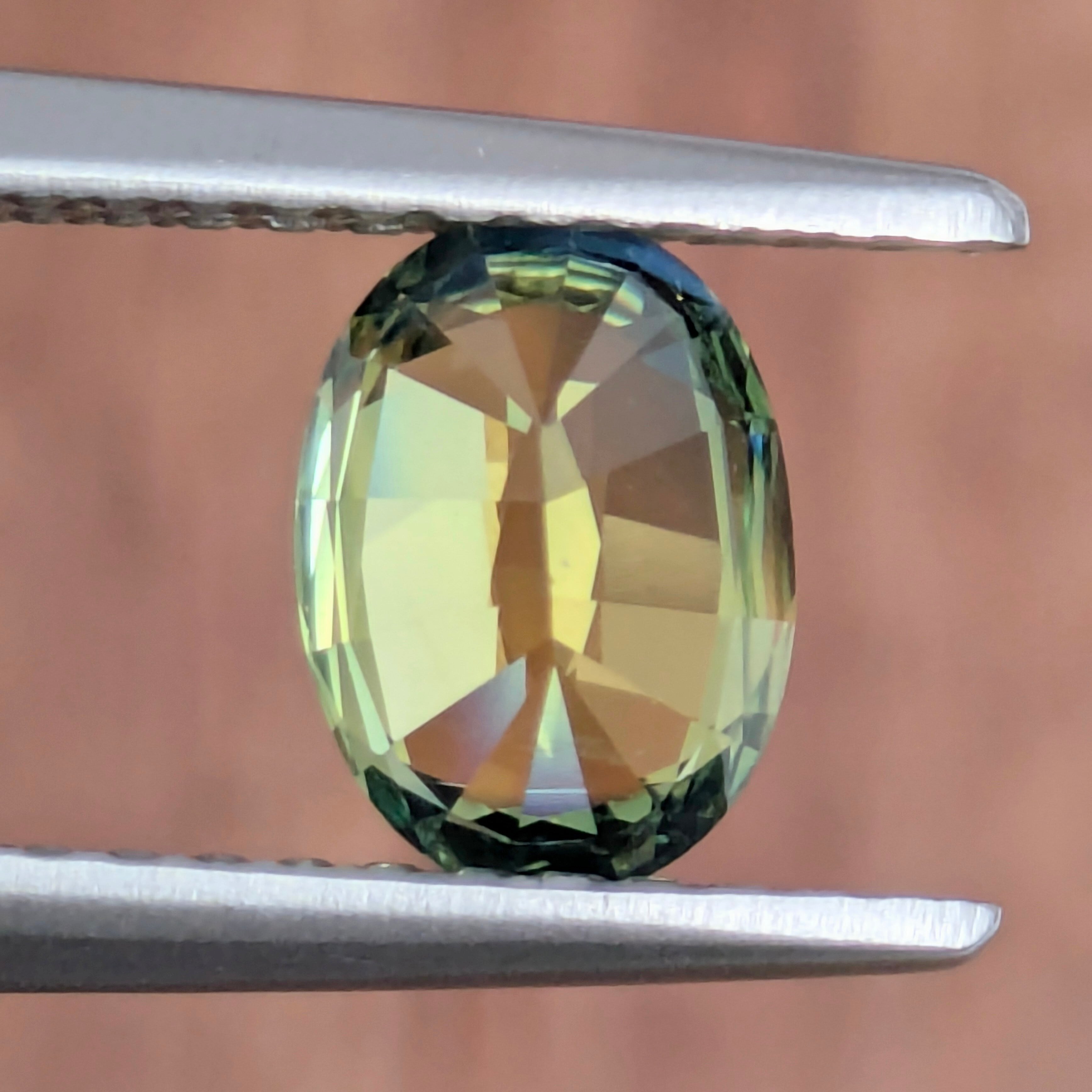 ソーティング上は、「ブルーグリーン」と「イエロー」の「バイカラーサファイア」となっているのですが、実物はその狭間にわずかに夕暮れのようなオレンジ色味も感じられる美しいサファイア。これは宝石が見せる幻なのか気のせいなのか・・・。通常のオーバルカットよりも一つ一つのカット面を大きく取っていることで、輝きで色が飛んでしまうこともなく、とても美しい色合いを見せてくれます。とはいえ、煌めきも十分です☆