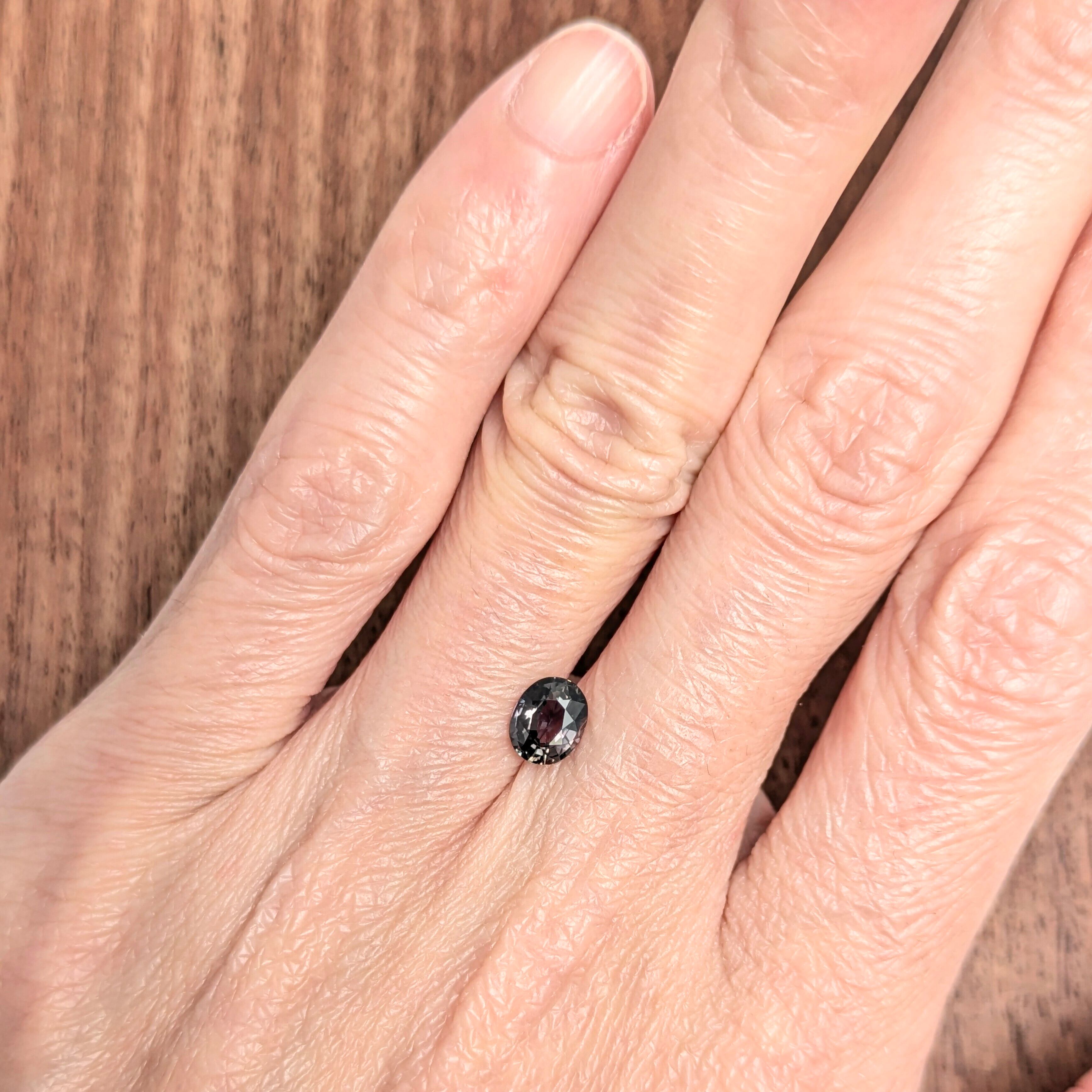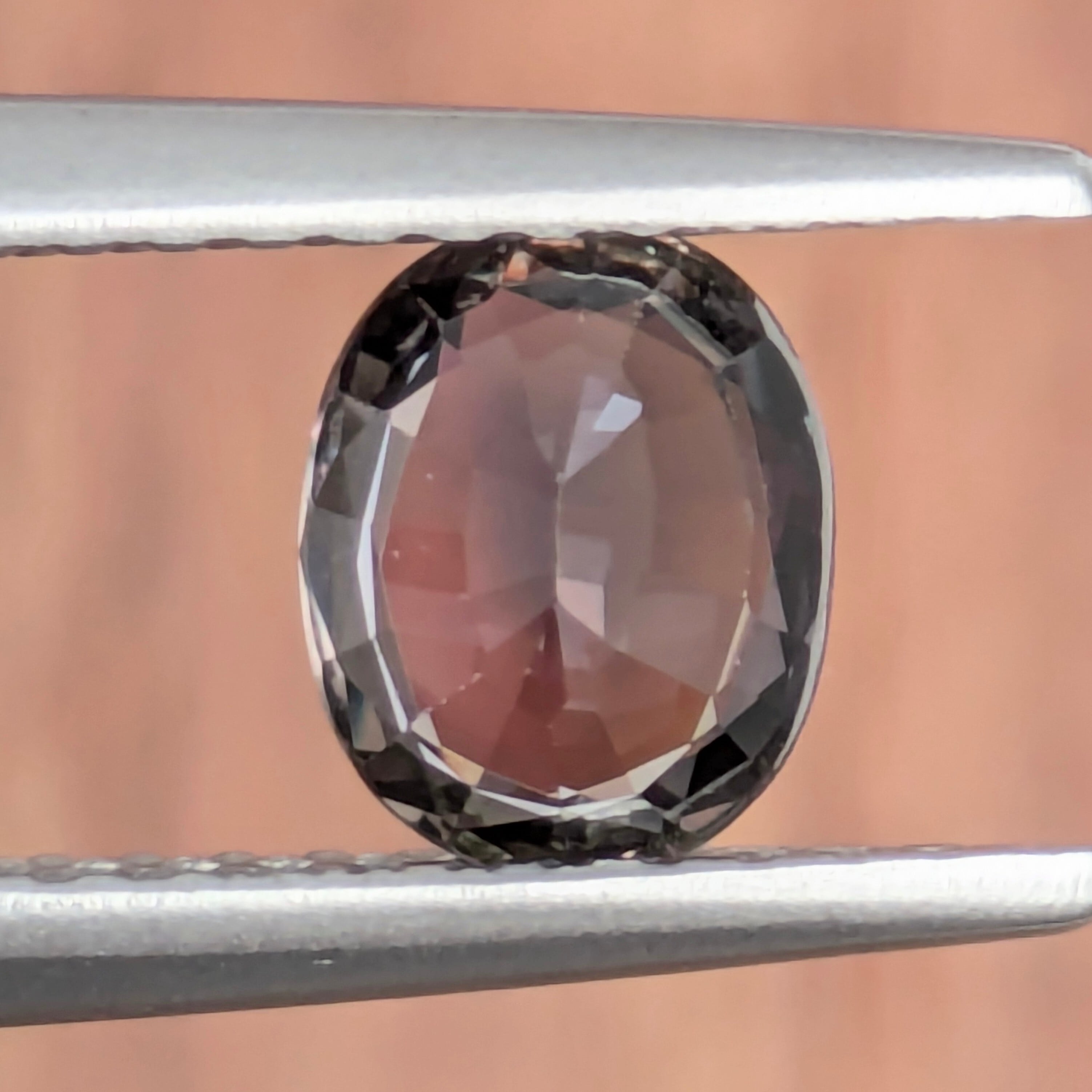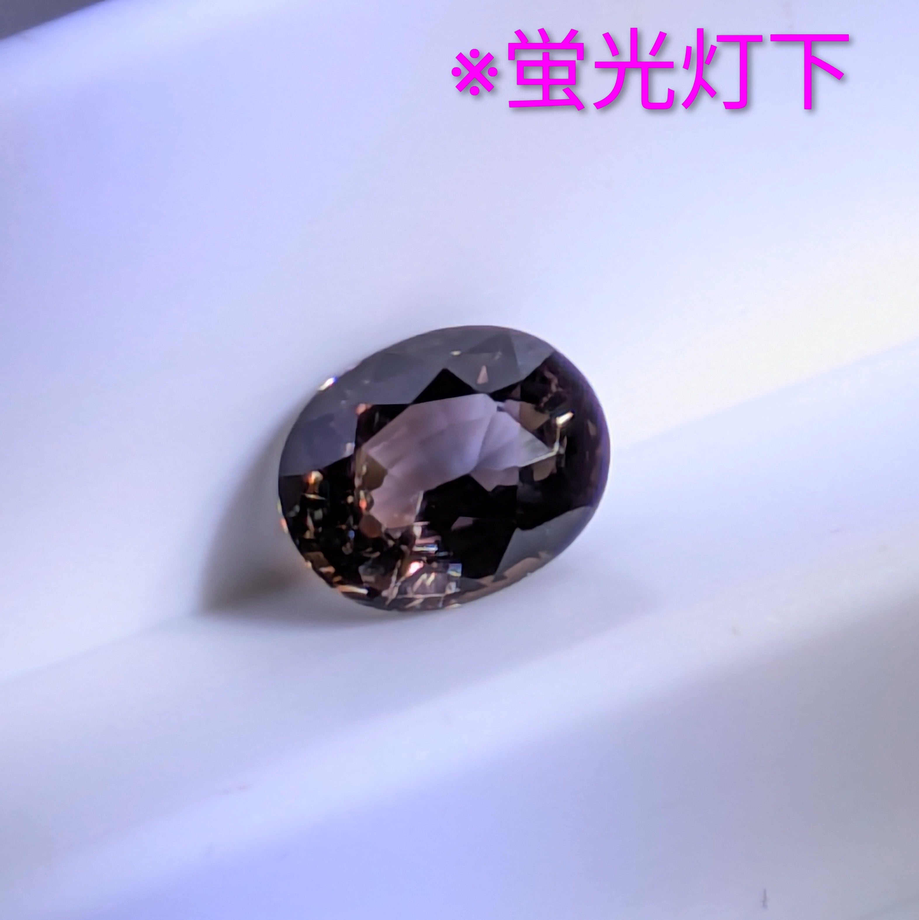そもそもカラーチェンジ系の宝石は、光を限定せず普通の状態で『互いに混ざり合った複雑な色合い』の状態でも魅力的だと思います。もちろん、〈蛍光灯下〉と〈白熱灯下〉の色合いが劇的に変化する方が面白いですが、まるでその一方の色合いに一枚カーテンを引いてさりげなく翳りを与えたような、大人っぽい美しさを纏うサファイアもなかなか乙な魅力を感じます。このレアな石、いかがでしょうか・・・。