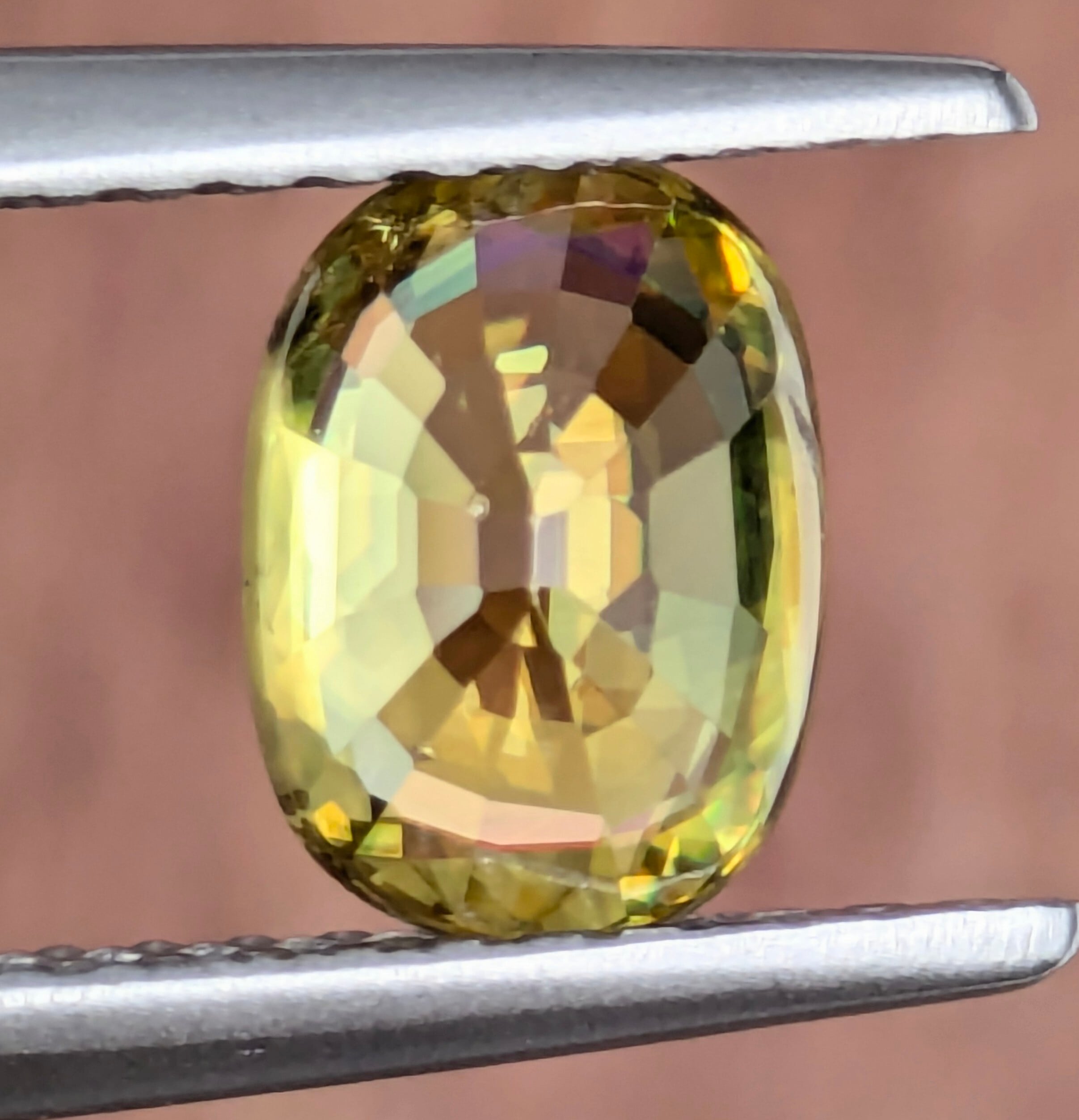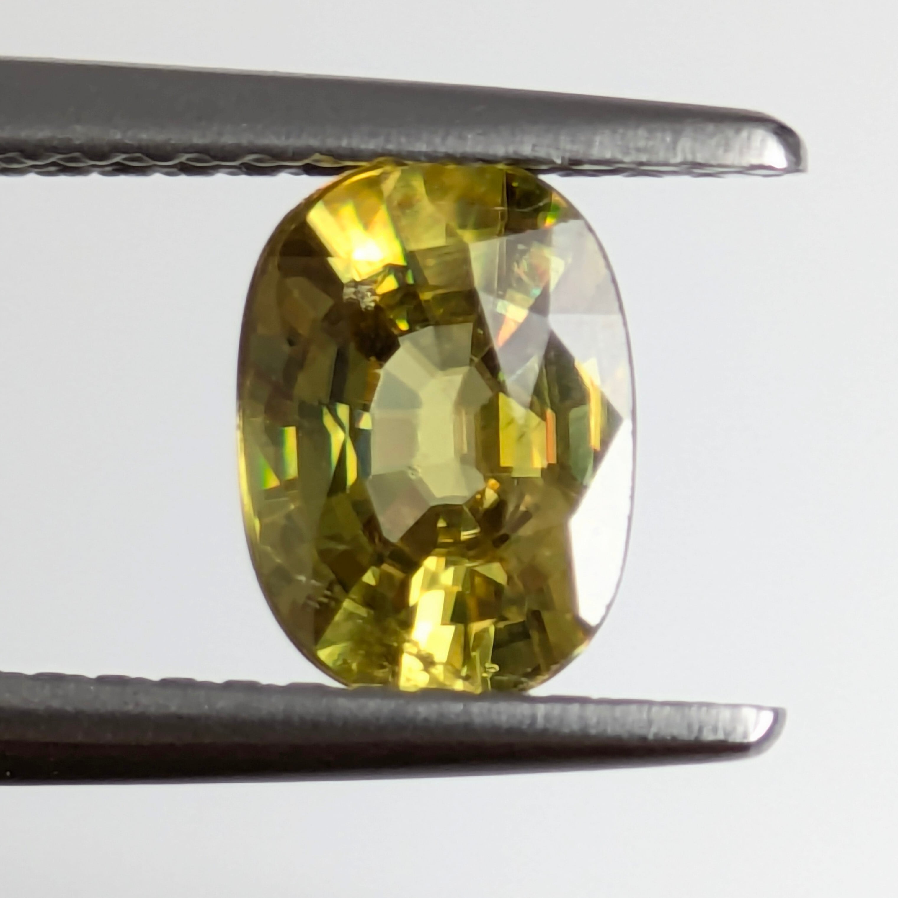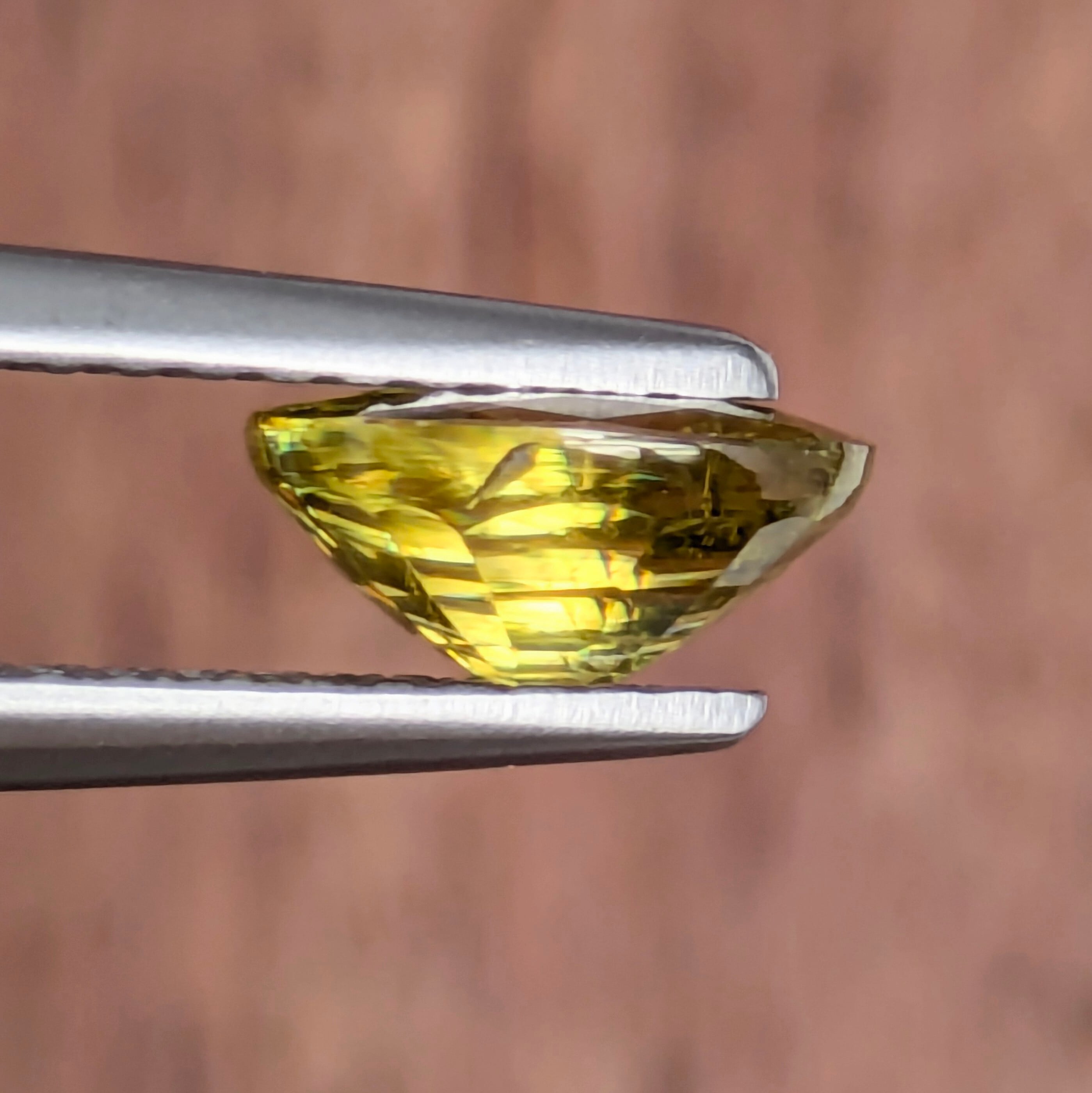 季節的に、陽の光はちょっと引っ込み思案になり、人々の衣は暗い色になりがちな冬のこの時期。なんとなく気分も塞がりがちなこんな季節こそ、『太陽の宿る宝石』であるスフェーンはいかがでしょうか?今回ご紹介の1ピースは、ベースこそイエロー系ですがその内部にはすべての色が詰まっています。角度を変えるごとに楽し気にその姿を見せる虹色のファイアたち・・・。【色彩】を忘れそうなこの季節、そっとあなたのファッションに忍ばせてみてください☆