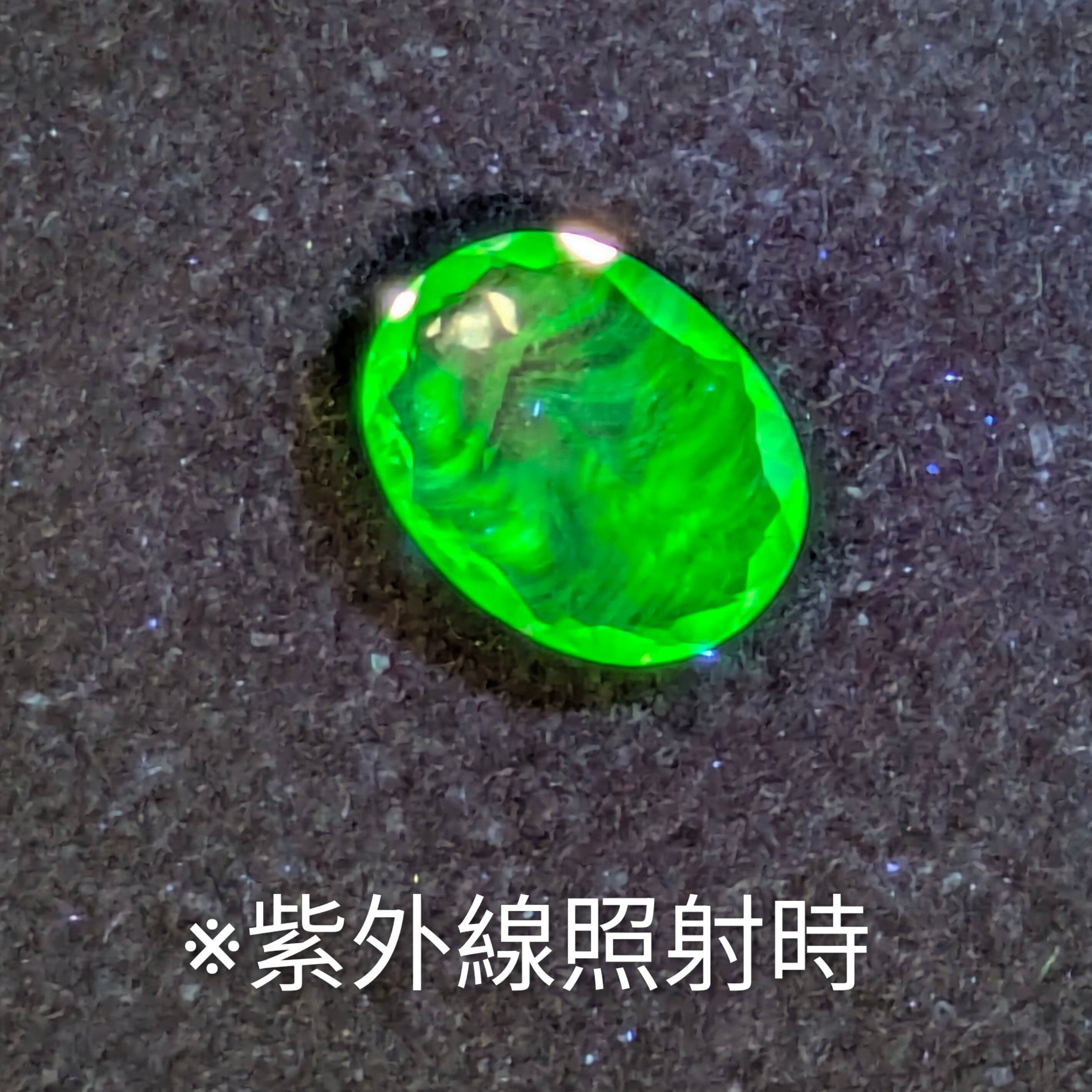 「オパール」という名を名乗っていながら、最大の特徴である【遊色(プレイ・オブ・カラー)】とは全く異なった個性を持つレアストーン。このハイアライトオパールは、通常時の冷静沈着な静かな輝きから、ブラックライト(紫外線)に当たると何かが目覚めたかのような光を発する姿に移行します。この現象は『励起(れいき)』といって、紫外線によってパワーを得た原子が覚醒して飛び回っている状態。音もなく、その輝きで結晶の『目覚め』を感じさせるだなんて、とてもロマンチックな宝石です。