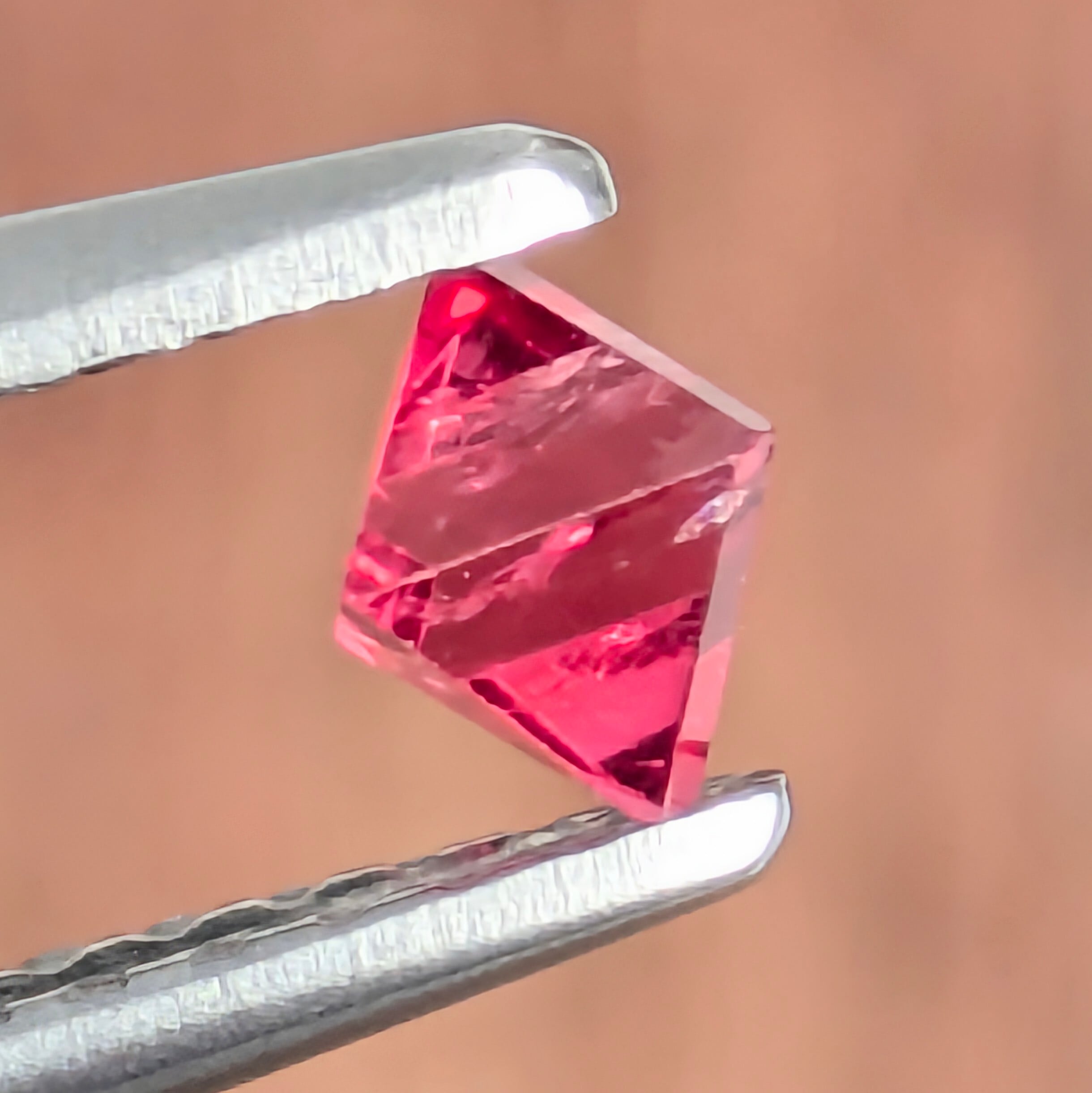 自然界に存在する「直線」と「曲線」。「曲線」で表されるものは数多くありますが、「直線」の最たるものは【鉱物】と言ってもいいかもしれません。その中でもスピネルはとても美しい原石の一つ。平滑な結晶面と美しい色合いに表情を与えてくれるのは、内包されている様々なインクルージョン。今回ご紹介の原石には、妖精の羽根を思わせるレリーフ薄めのフェザーが入っており、透明感は妨がず個性を演する一助になってくれています。