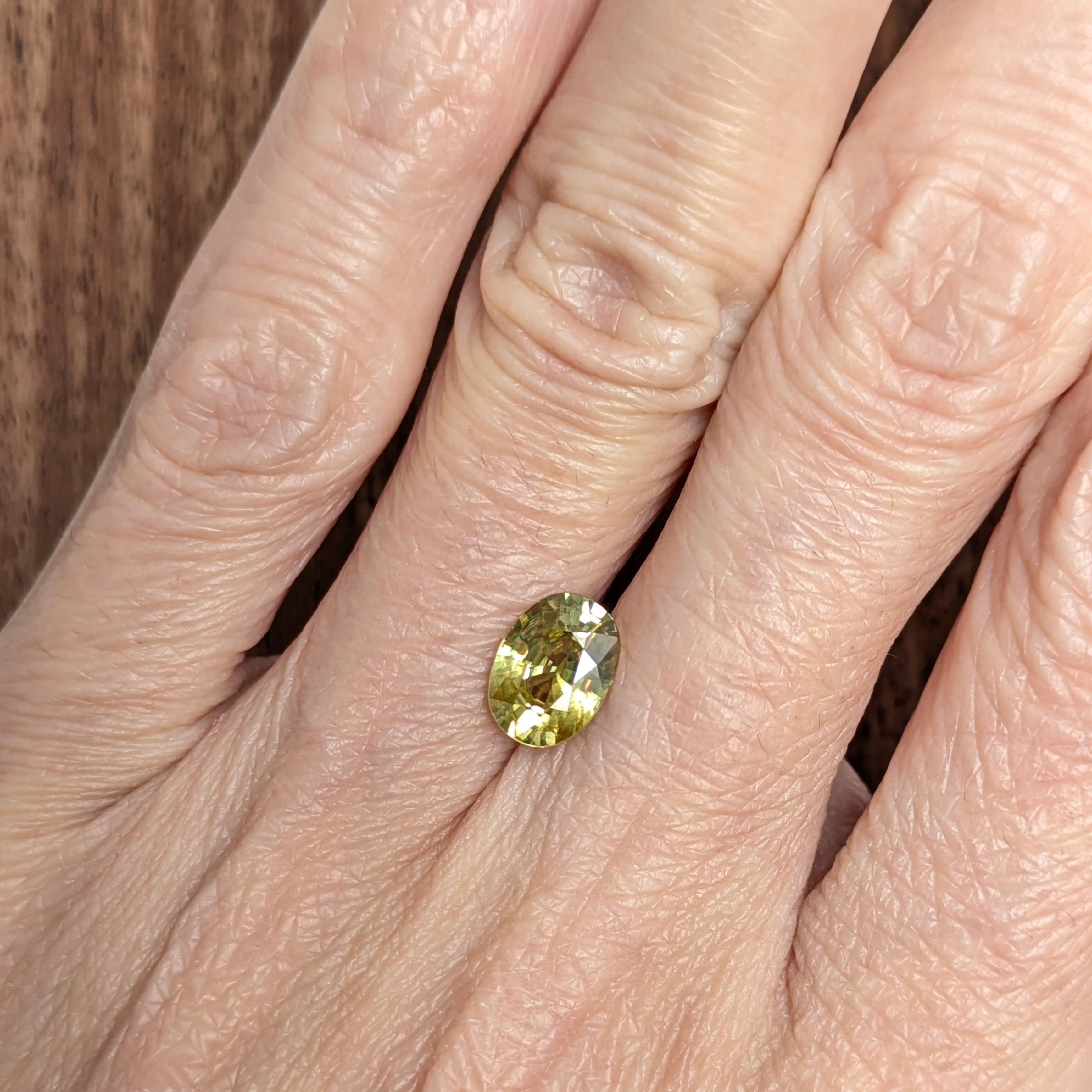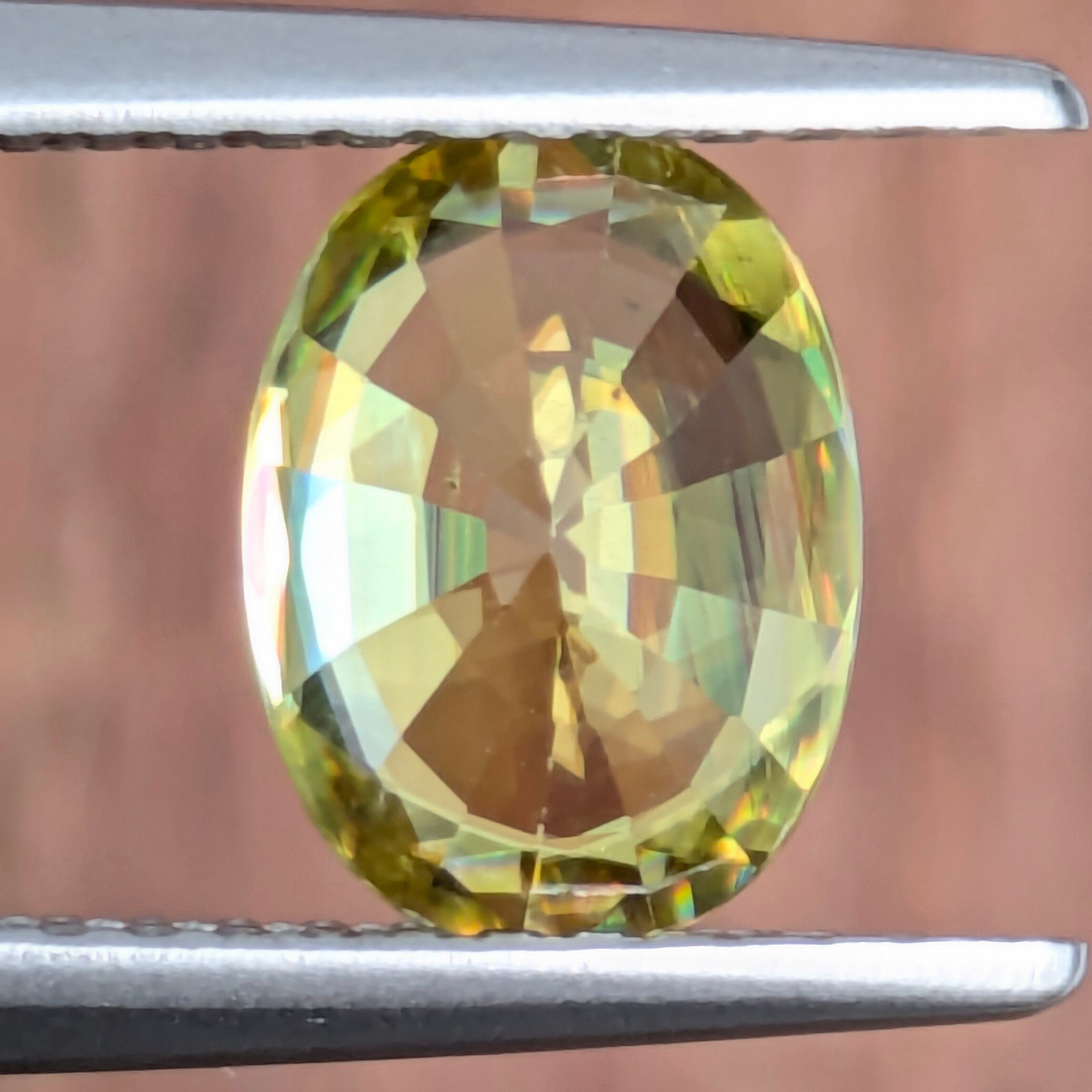 スフェーンには、「結晶を通して見た向こう側が二重に見える」という光学特性があるのですが、ルーペで実際にその様を拡大してみると、それはまるで『虹を通して透かして見た世界』のようかもしれません。ダイヤモンドの数値すらも上回る「分散度=白色光が七色に別れる度合い」のおかげで、結晶内はもうレインボーのパーティー空間!どの角度から見ても迸るような虹色の輝きがとても美しい宝石です。