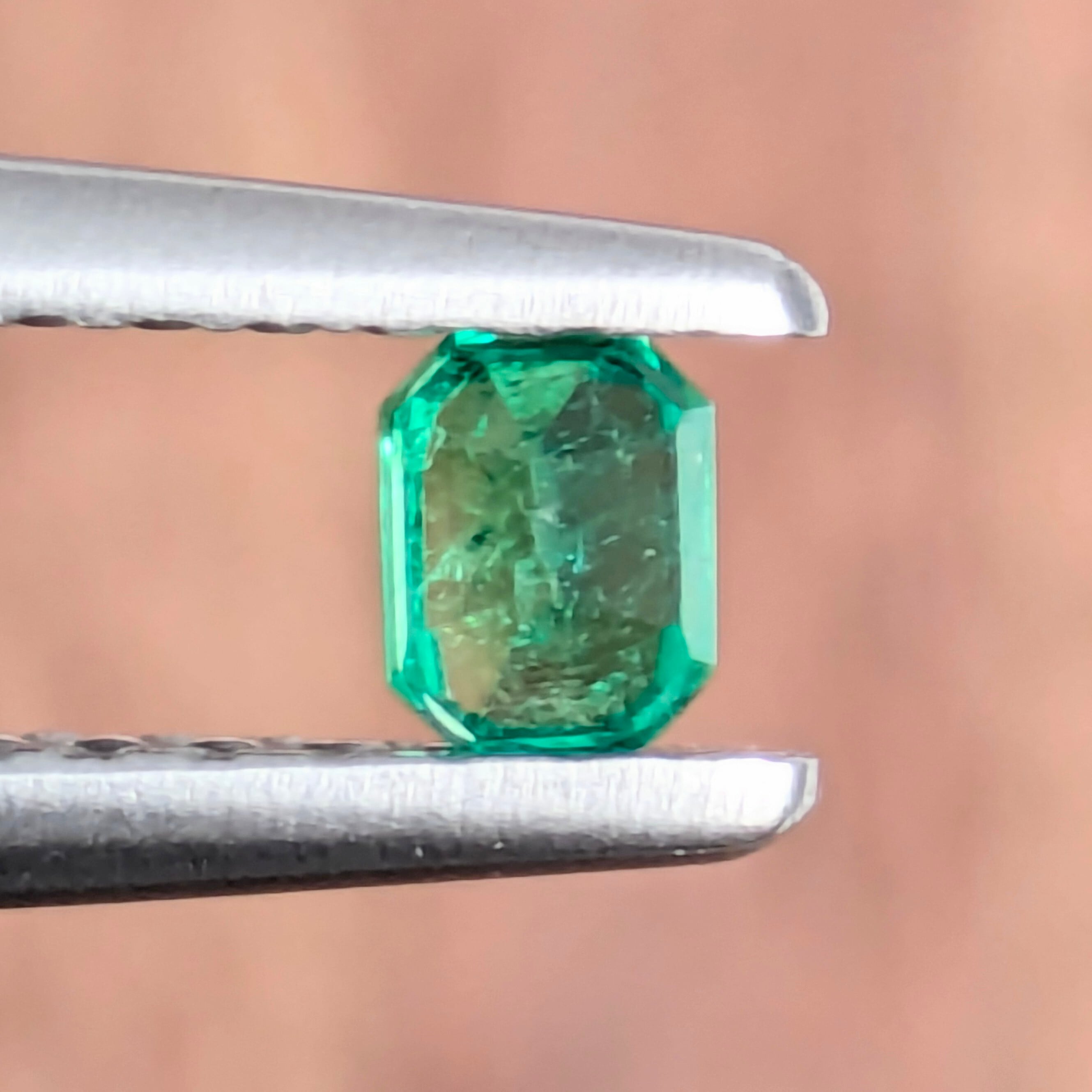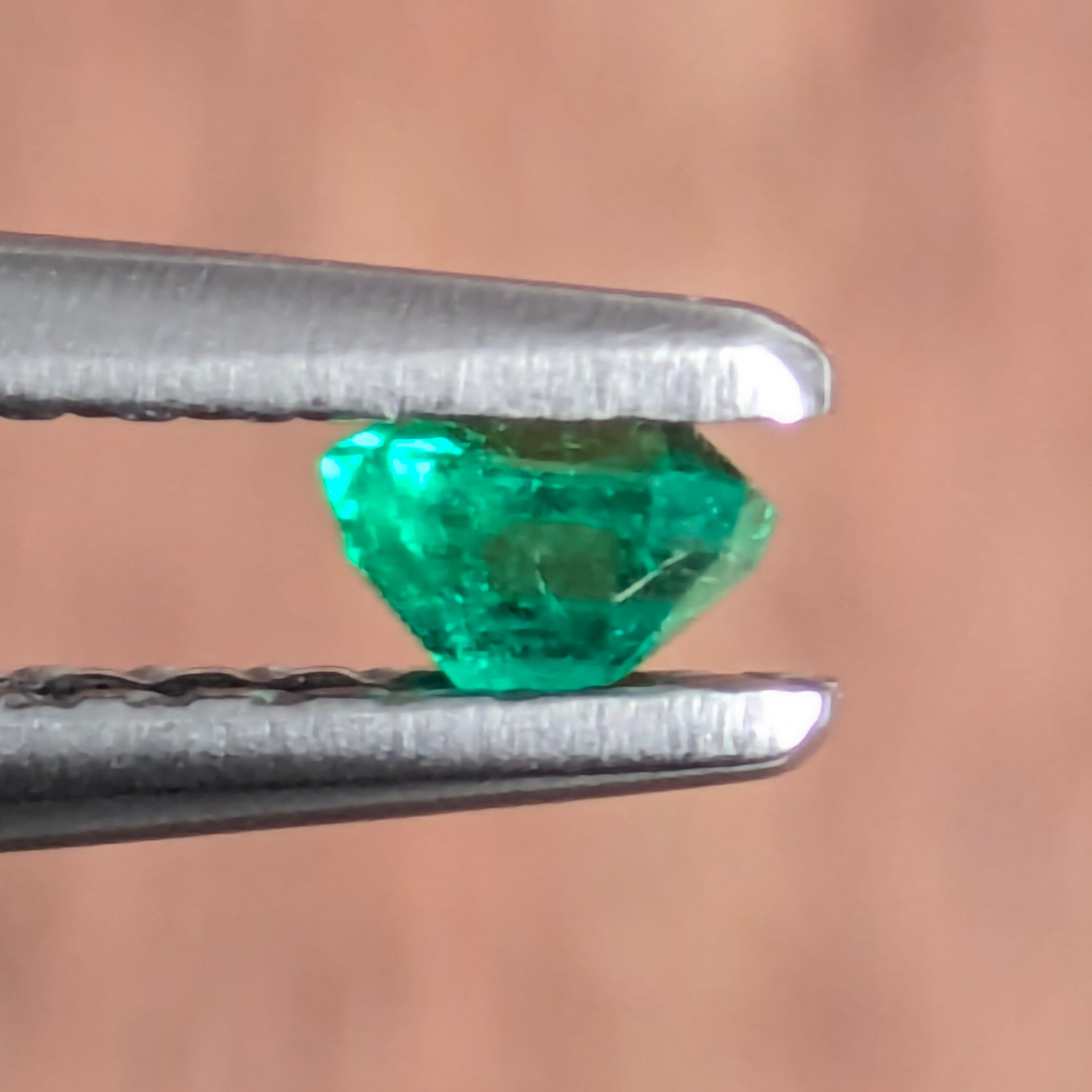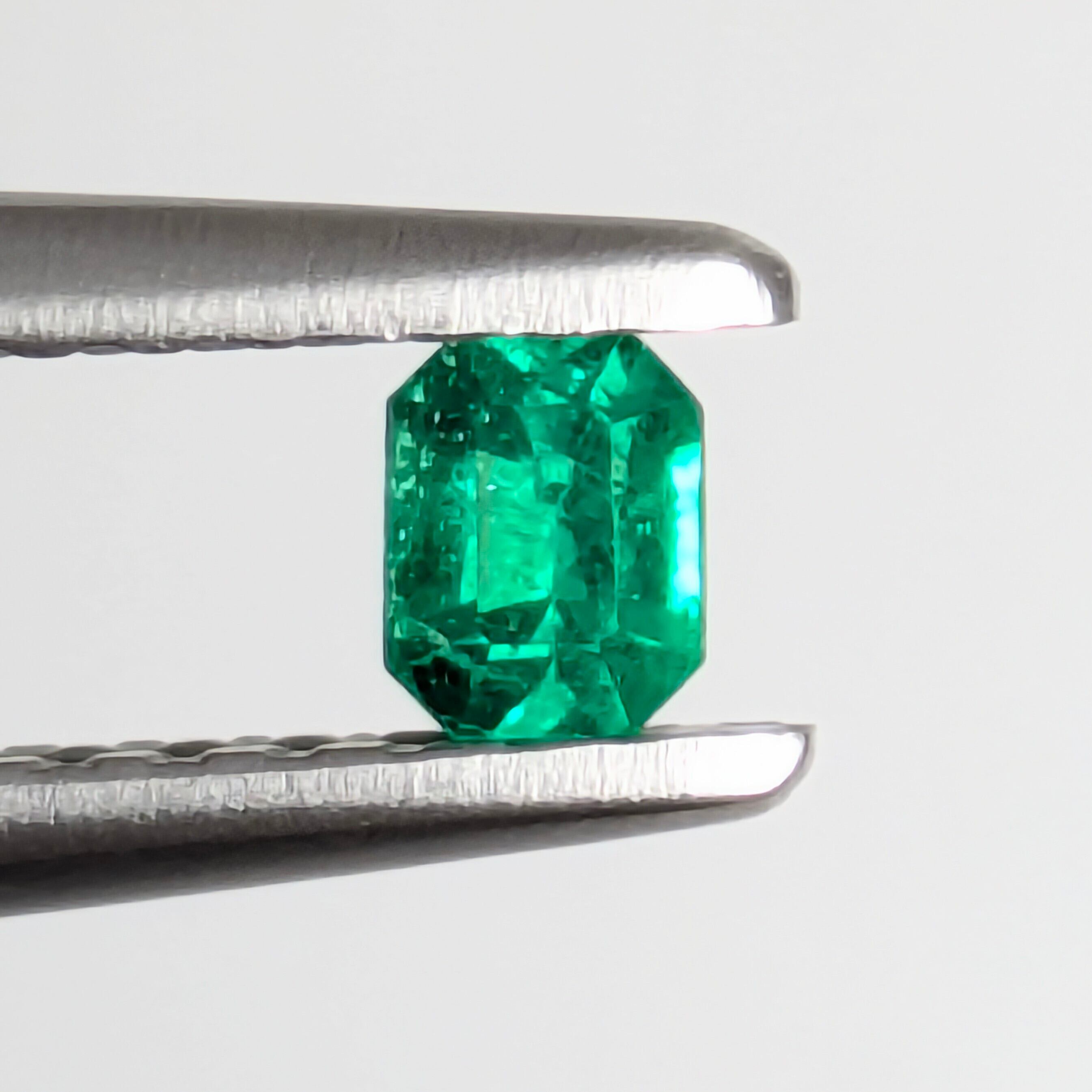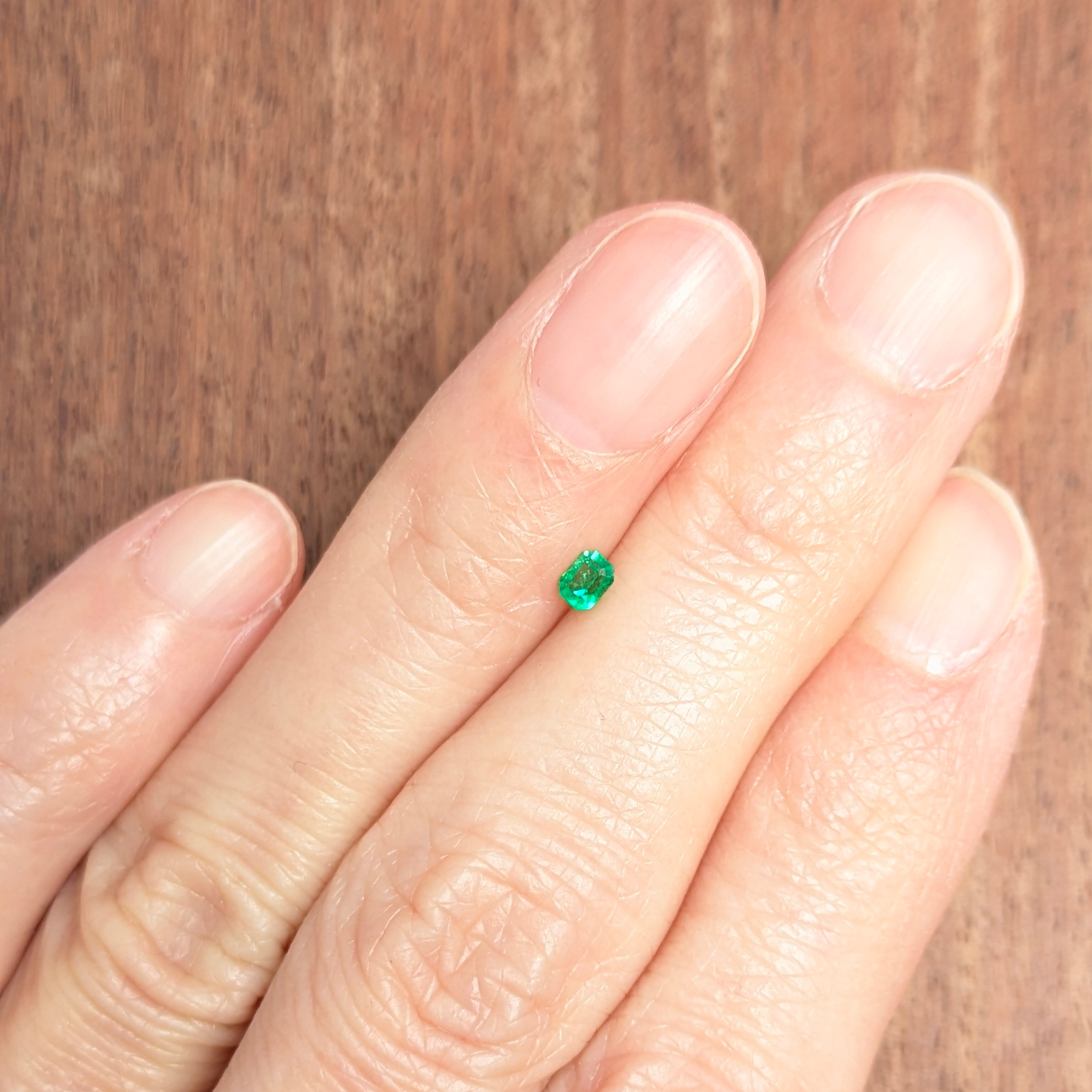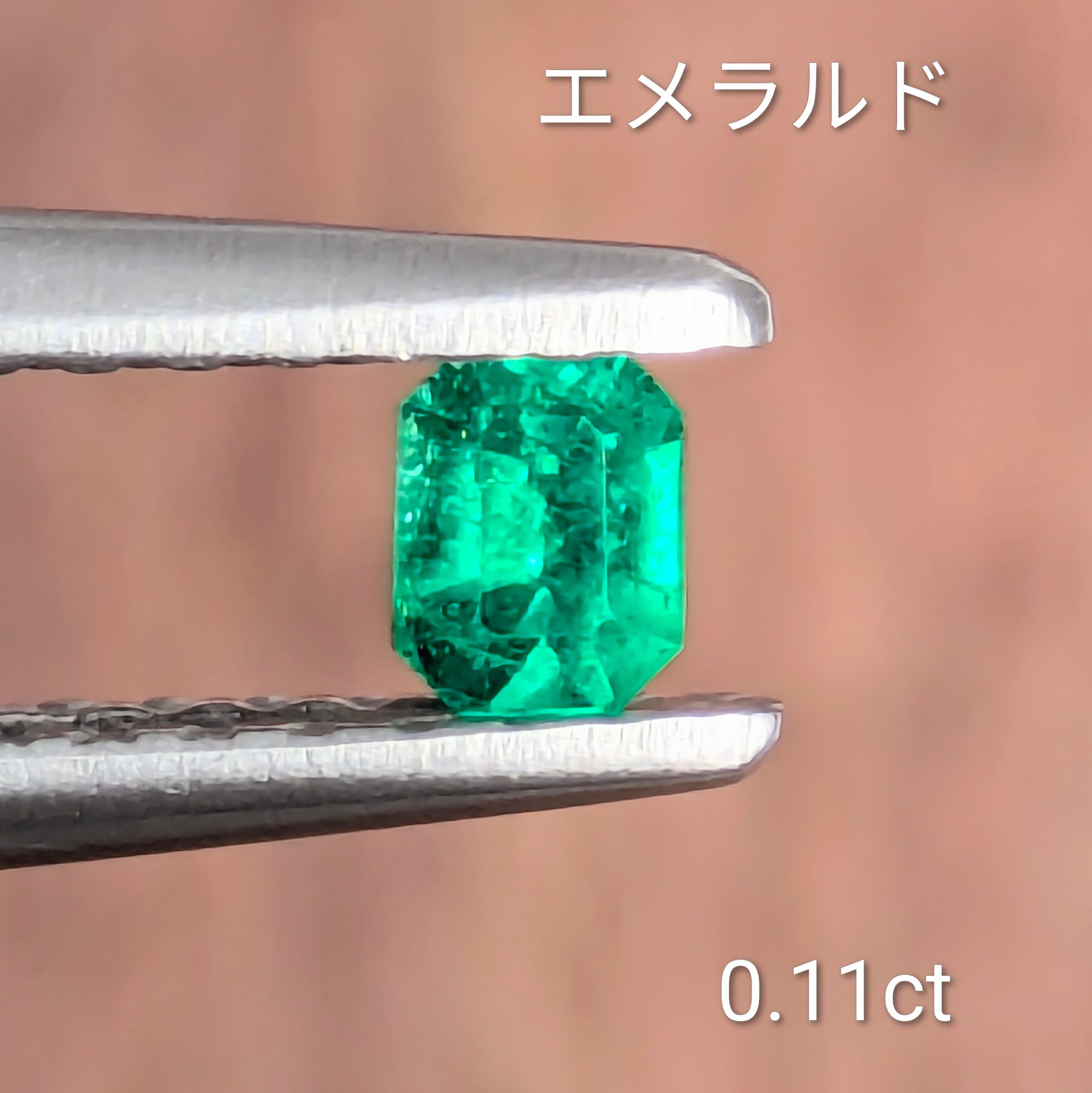 0.11ctと、決して大きくはないですが、不思議としっかりとした存在感を示すエメラルド。やはりこのサイズでの美しいグリーンの輝きを目にすると、改めて「エメラルドのグリーンは、この宝石種のみが持つ特別な色合いだな」と感じます。わずかに黄味を帯びた、鮮やかなグリーン。エメラルドの例にもれずインクルージョンも入っていますが、その美しい色とテリはそのような不純物に妨げられるようなものではありません。とても美しい1ピースです。