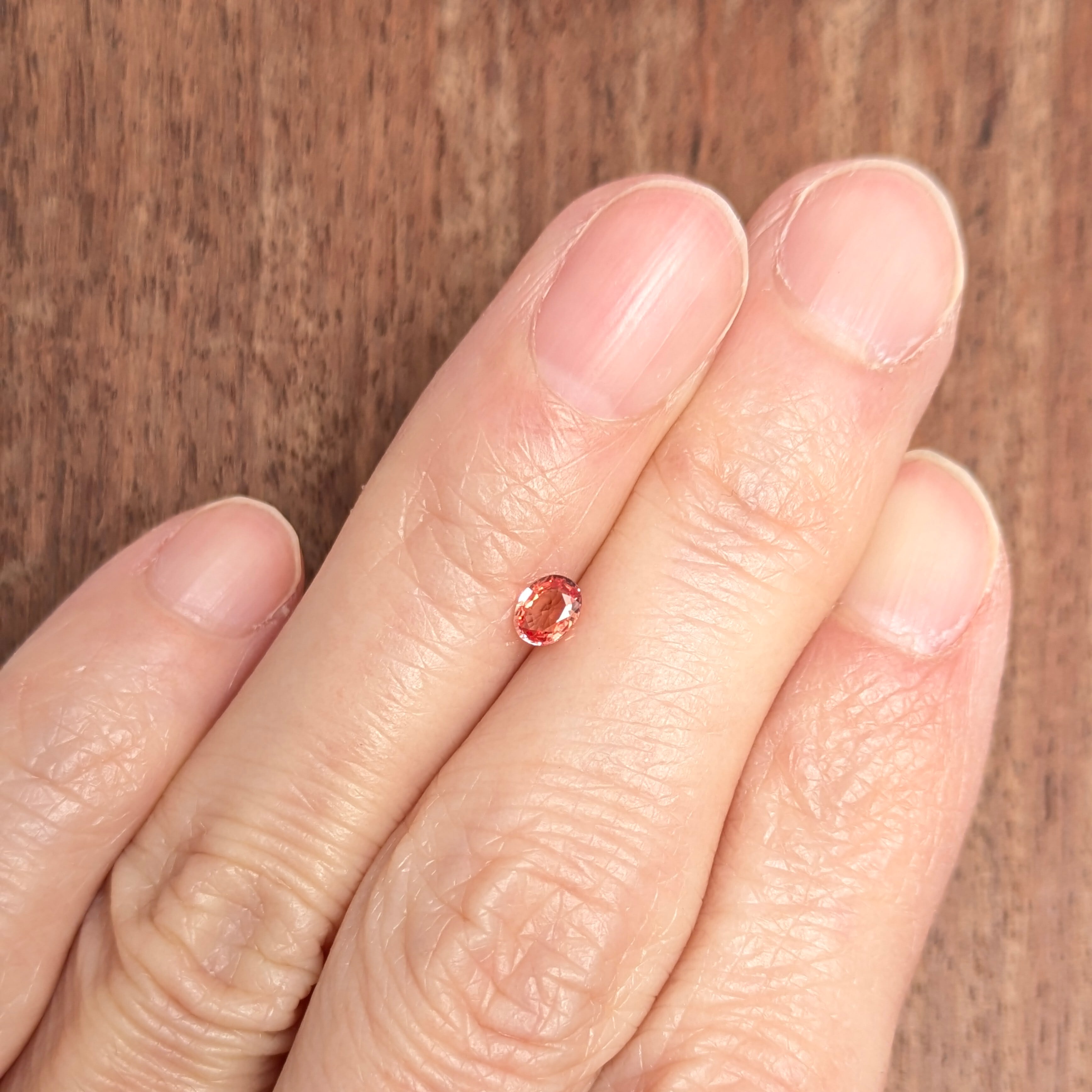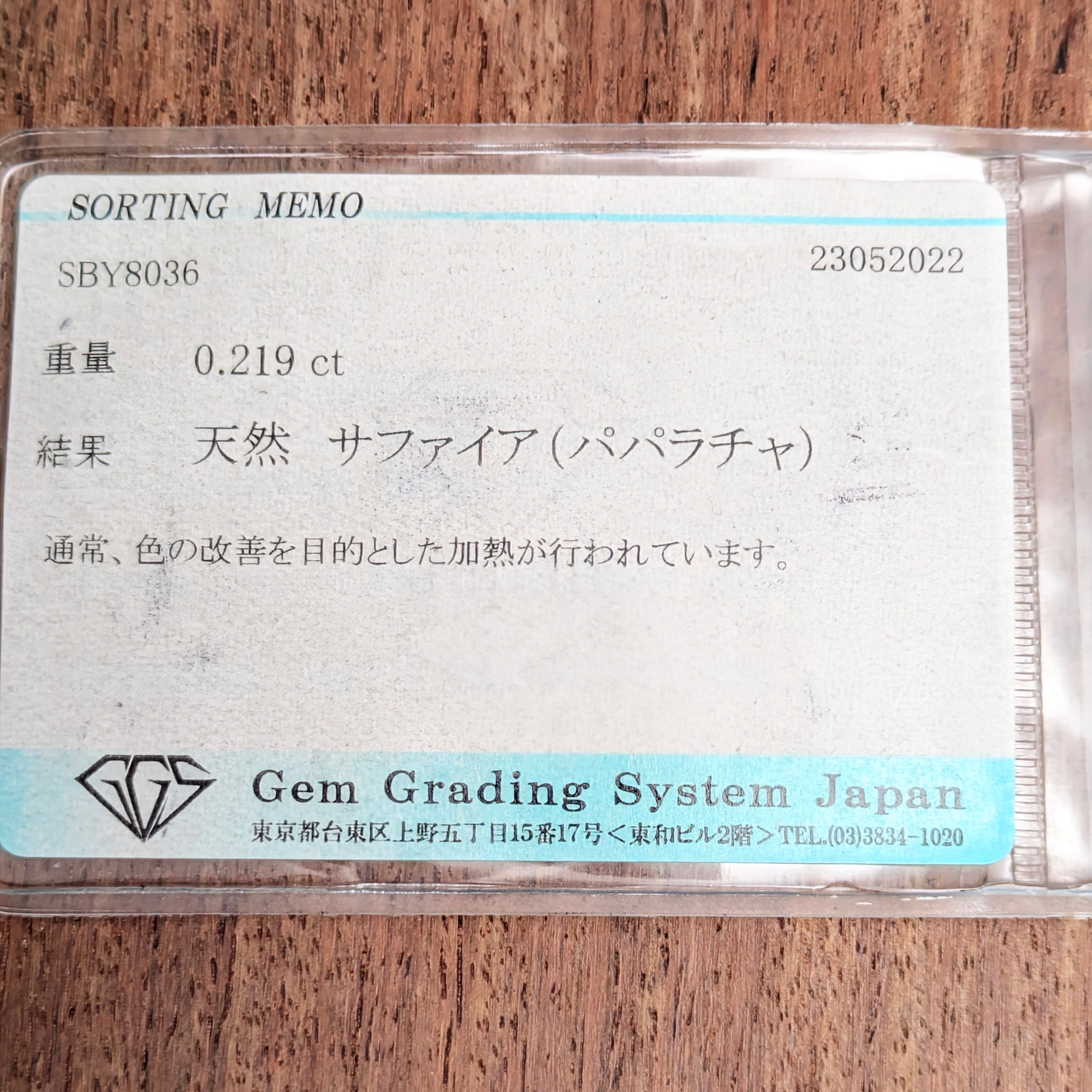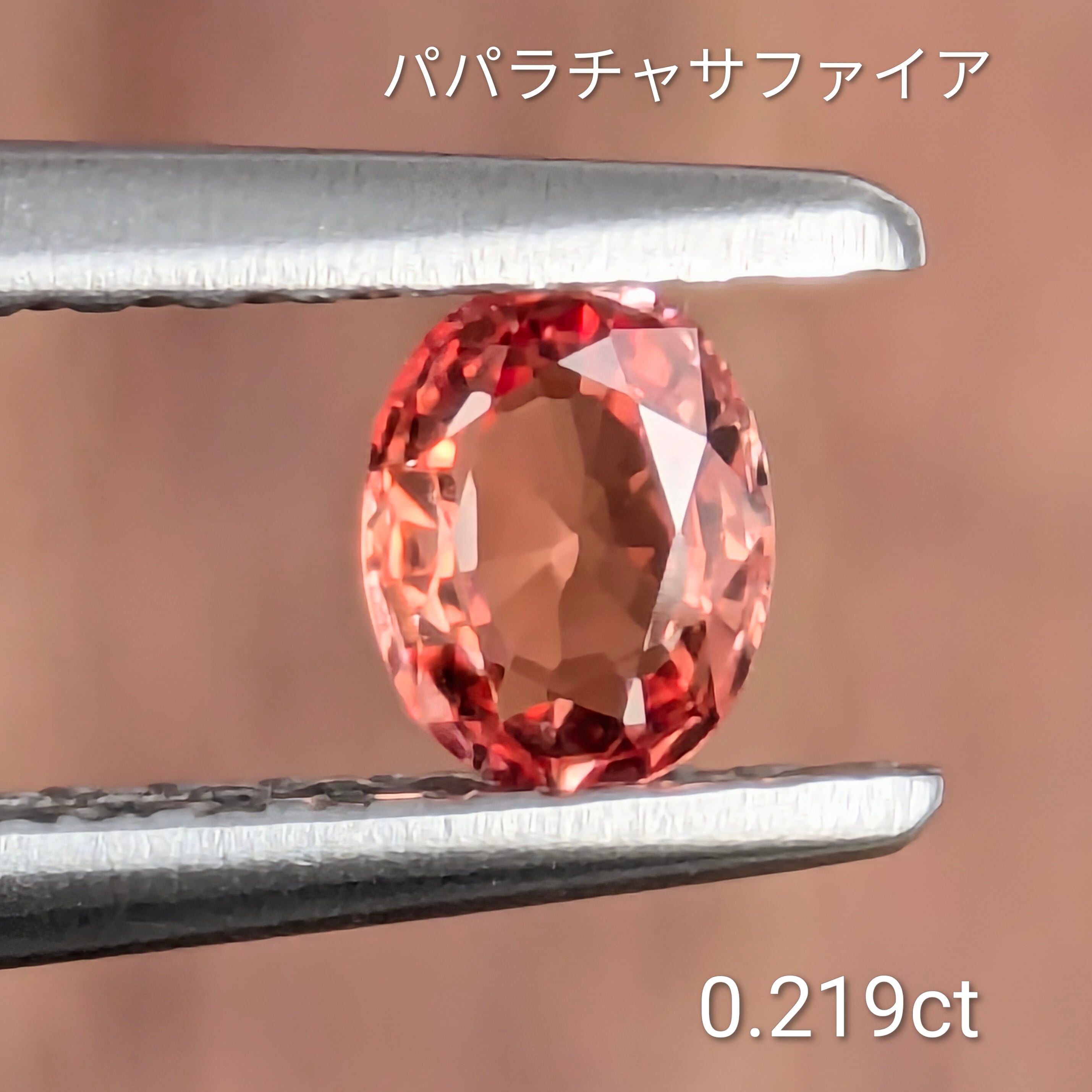 個人的には、「これこそが、パパラチャに期待する色だ!!」とドキドキする1粒。オレンジ色とピンク色のちょうど中間、まさにそれぞれの色が均等に混ざり合った色相の、とても美しいパパラチャサファイアです。色合いの美しさのみならず、濃さ、そしてテリ、透明度、どれをとっても申し分のない1ピース。しつこいですが、「これこれ!この色だよ・・・!」と、声を大にして言いたい一品です。実際にこの「パパラチャサファイア」は色相がかなり幅広く存在する石種なので、自分好みの1ピースを探し当てるのが一つの楽しみでもあります。