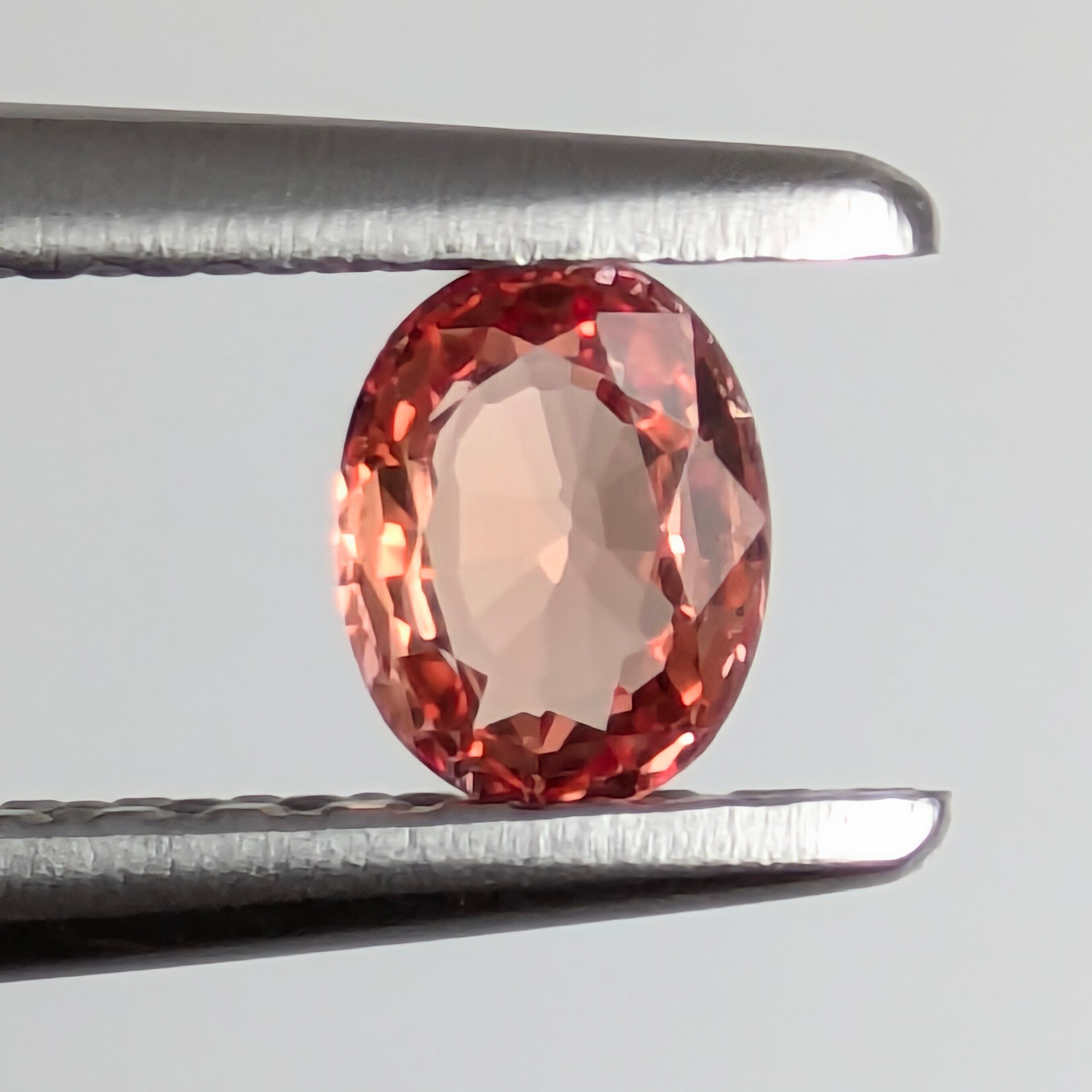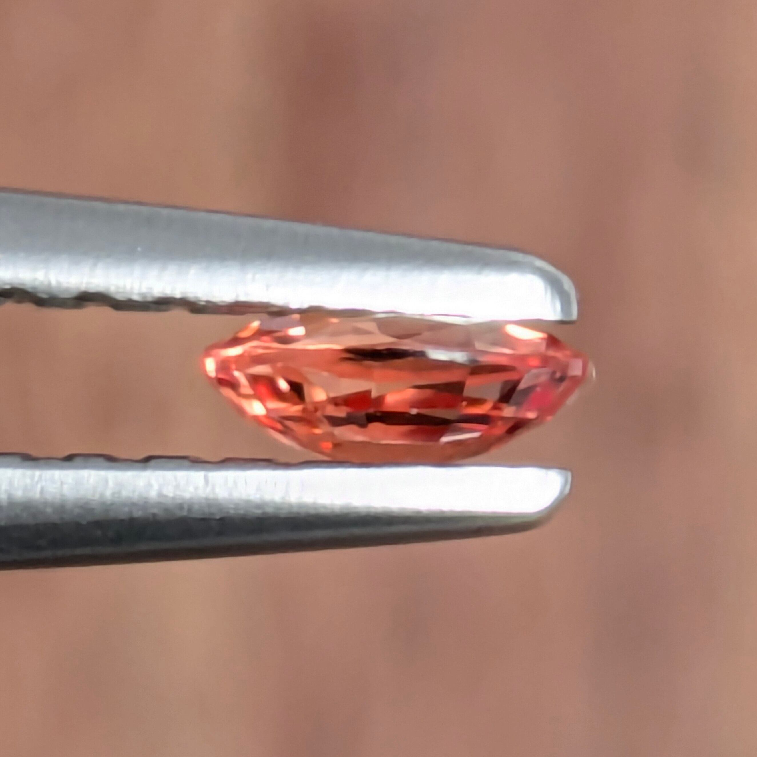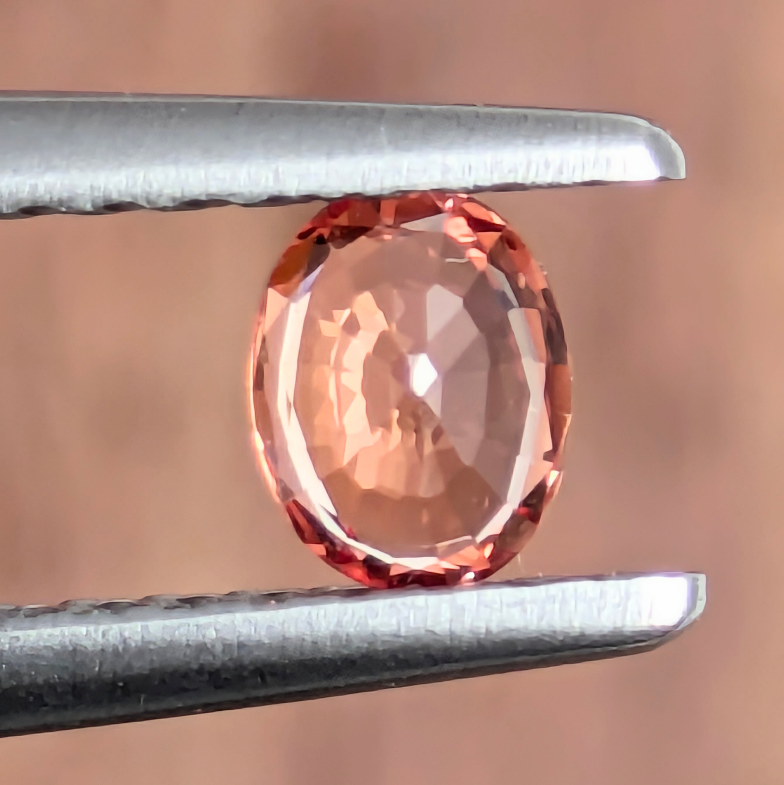 個人的には、「これこそが、パパラチャに期待する色だ!!」とドキドキする1粒。オレンジ色とピンク色のちょうど中間、まさにそれぞれの色が均等に混ざり合った色相の、とても美しいパパラチャサファイアです。色合いの美しさのみならず、濃さ、そしてテリ、透明度、どれをとっても申し分のない1ピース。しつこいですが、「これこれ!この色だよ・・・!」と、声を大にして言いたい一品です。実際にこの「パパラチャサファイア」は色相がかなり幅広く存在する石種なので、自分好みの1ピースを探し当てるのが一つの楽しみでもあります。
