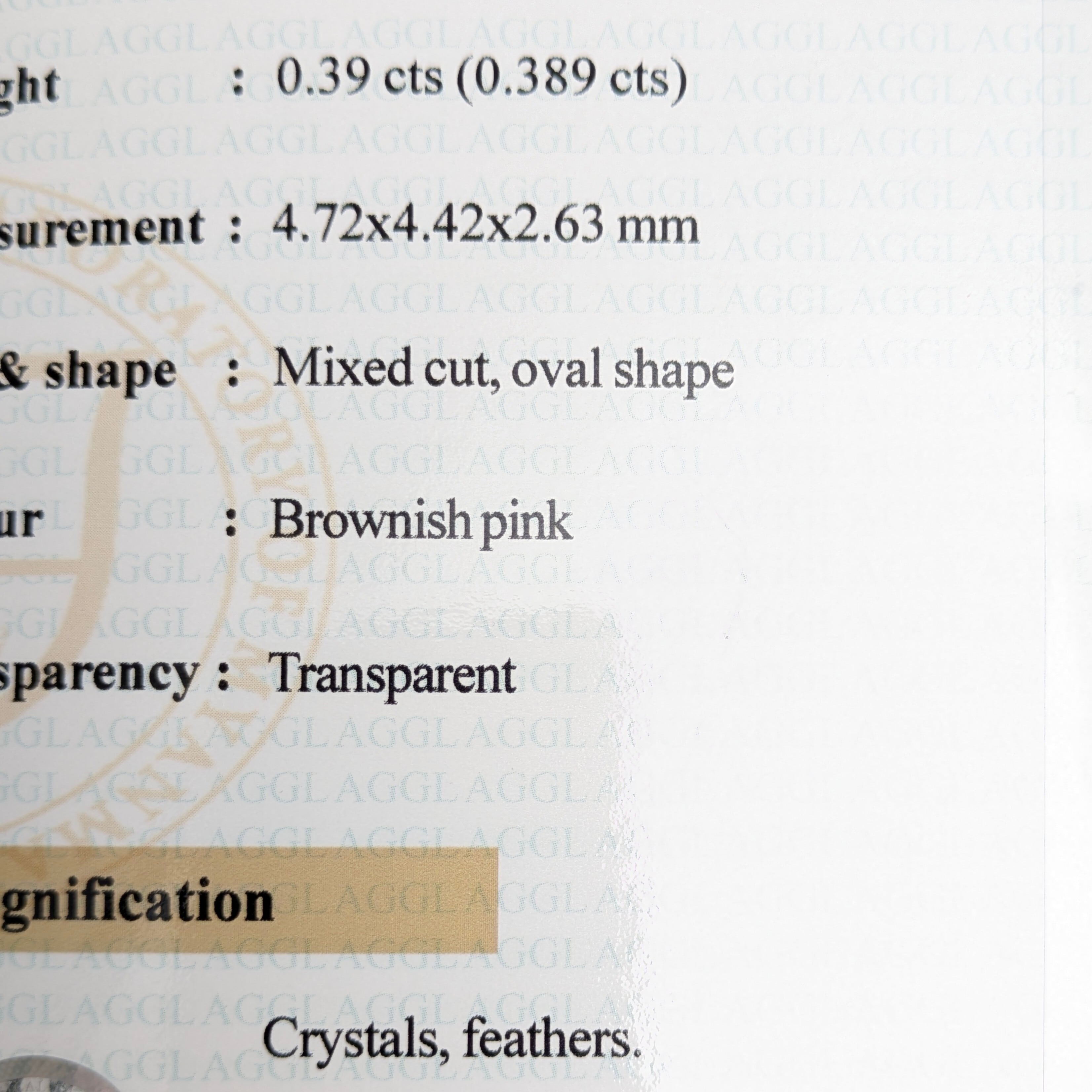 カラーグレードは「Brownish pink」となっていますが、肉眼ではほとんどブラウン味は感じません。ほのかにオレンジ味を帯びた夕暮れの温かな光を浴びたイチゴのように、一日の最後の瞬間の煌めきを閉じ込めたような美しい輝きと色合いの1ピース。見れば見るほど、「甘いのではないかな・・・?」とその香しい香りすらも漂ってきそうな有機的な雰囲気まで感じます。何も語らない『宝石』ですが、私たちに伝わってくる魅力はとてもおしゃべりです☆