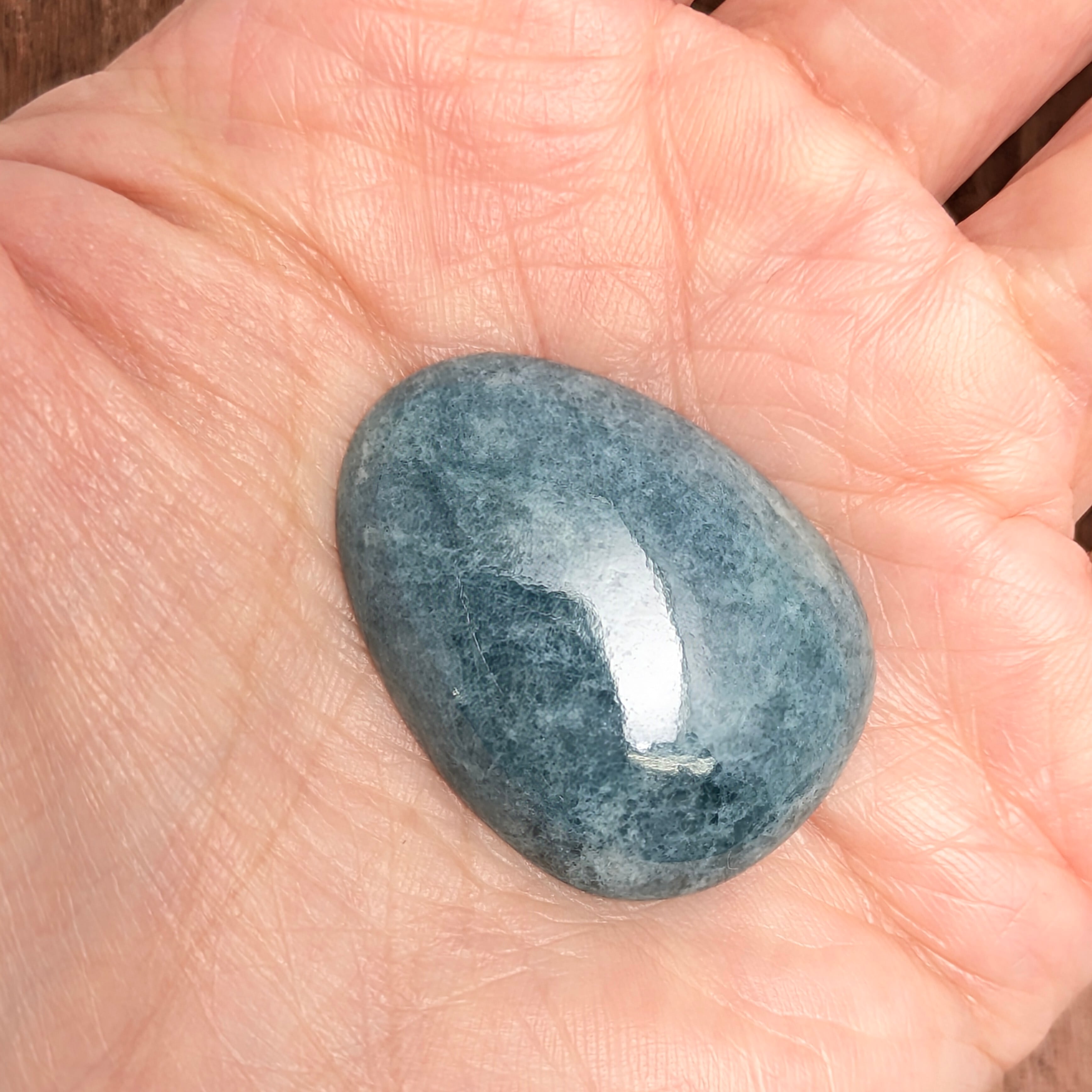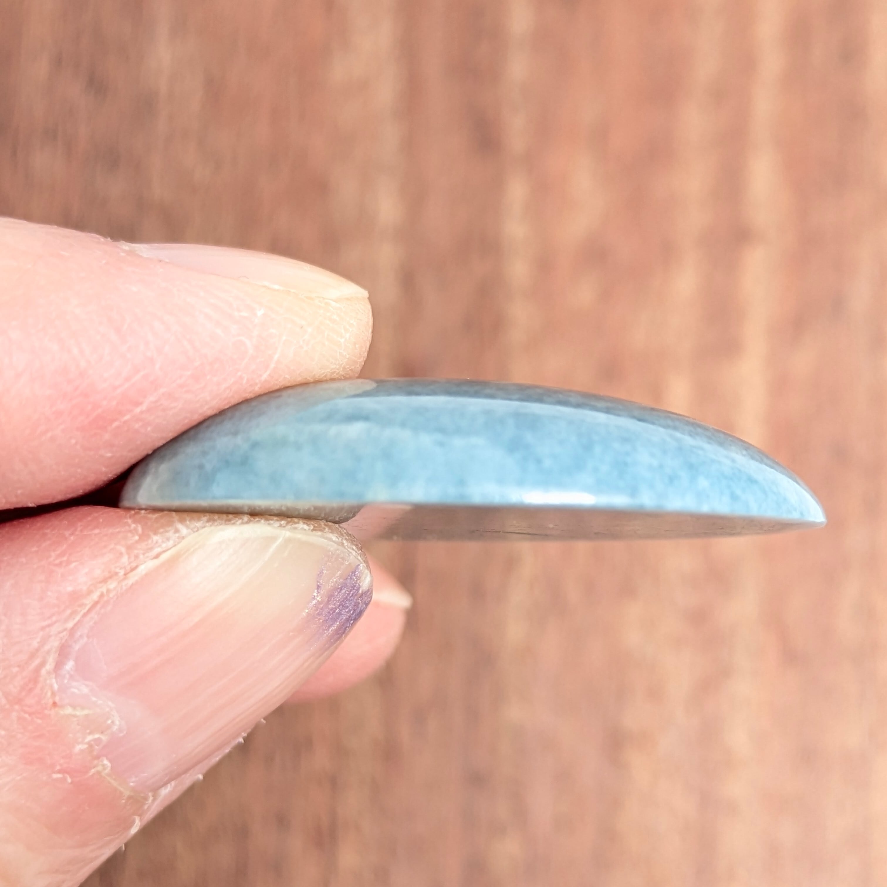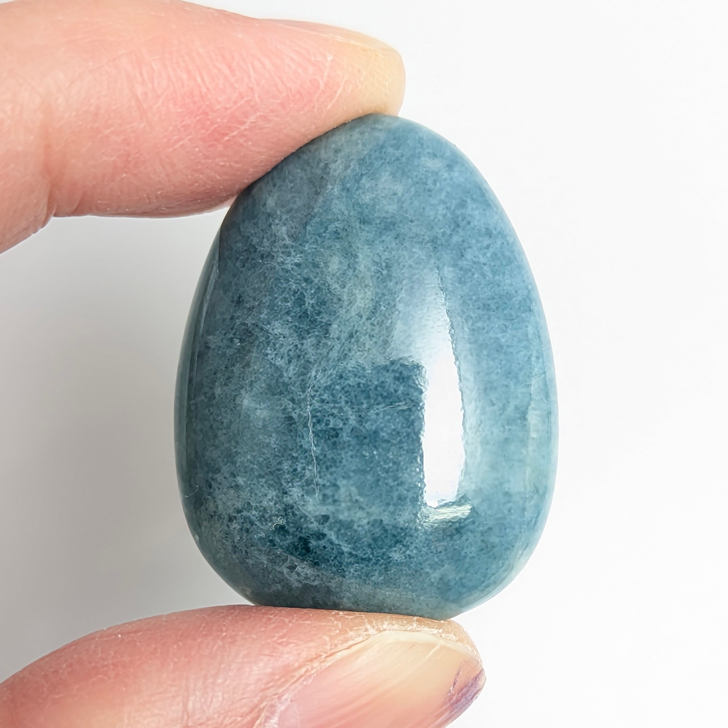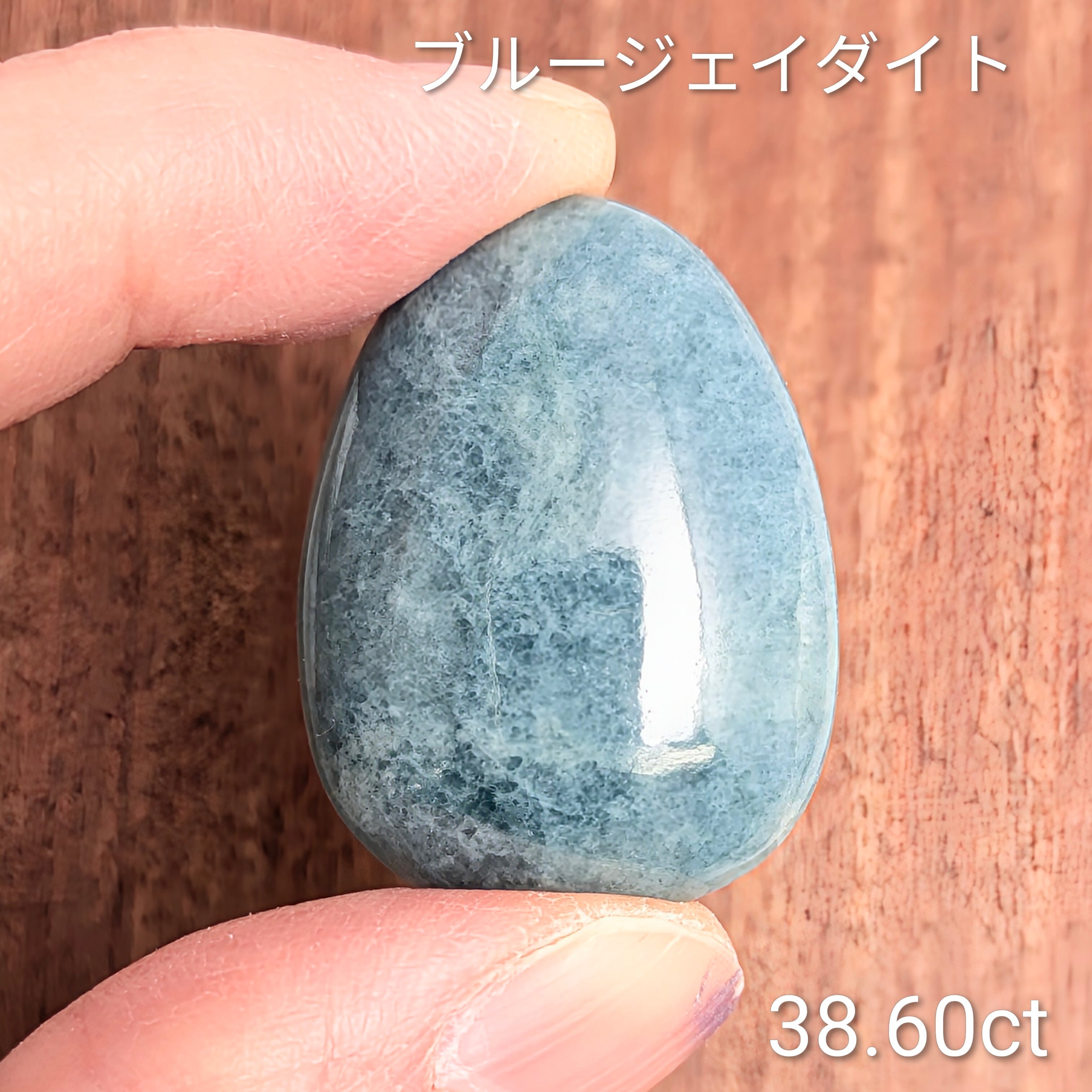 この石は何でしょう・・・?「ジェイダイト(ひすい/翡翠)」です。通常私たちがよく見るグリーンやラベンダー色とはちょっと一線を画す珍しい色合い。「ブルー・ジェイダイト(青翡翠)」の登場です。純粋無垢なジェイダイトは「白色(無色)」ですが、不純物として微量の「鉄(Fe)」と「チタン(Ti)」を含むことで、この様なちょっとグレー味を帯びた風情のあるブルーが生まれると言われています。ツヤツヤ、テリテリの非常に綺麗な1ピースです。