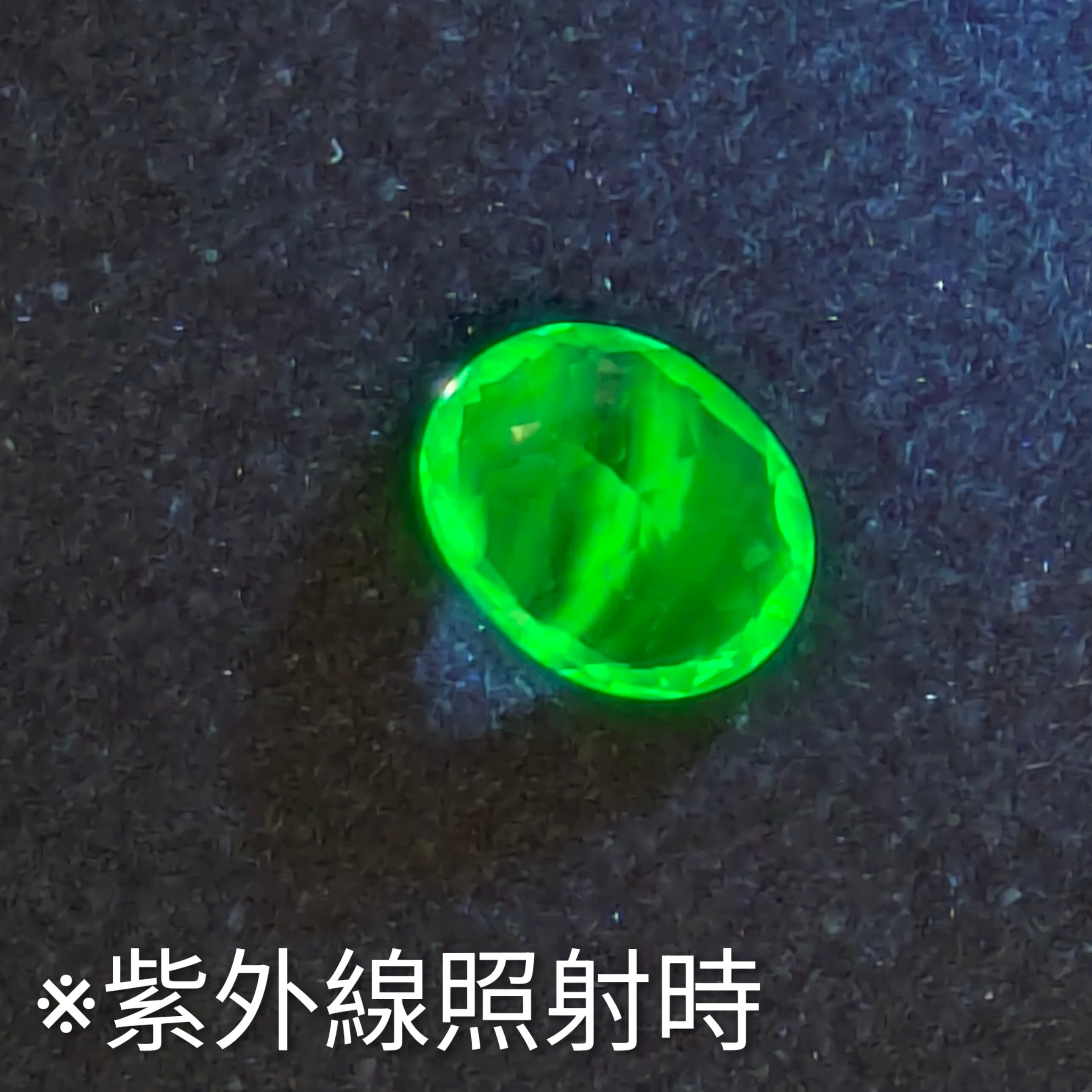 空気がそのまま宝石になったような、透明感にひたすら見入ってしまう一粒。他のカラーレスの宝石たちとは一風違う、『結晶構造を持たない』というところに秘密があるのかもしれません。ひとたびルーペで内部を覗き込むと、まるで大気を吹き渡る風がそのまま封じ込まれたような『流紋模様』が印象的です。とても静かな印象の宝石ですが、紫外線に当たった瞬間にその姿を激変させる・・・!イナヅマの閃きのようなビビッドグリーンの輝きにも、ご注目ください。