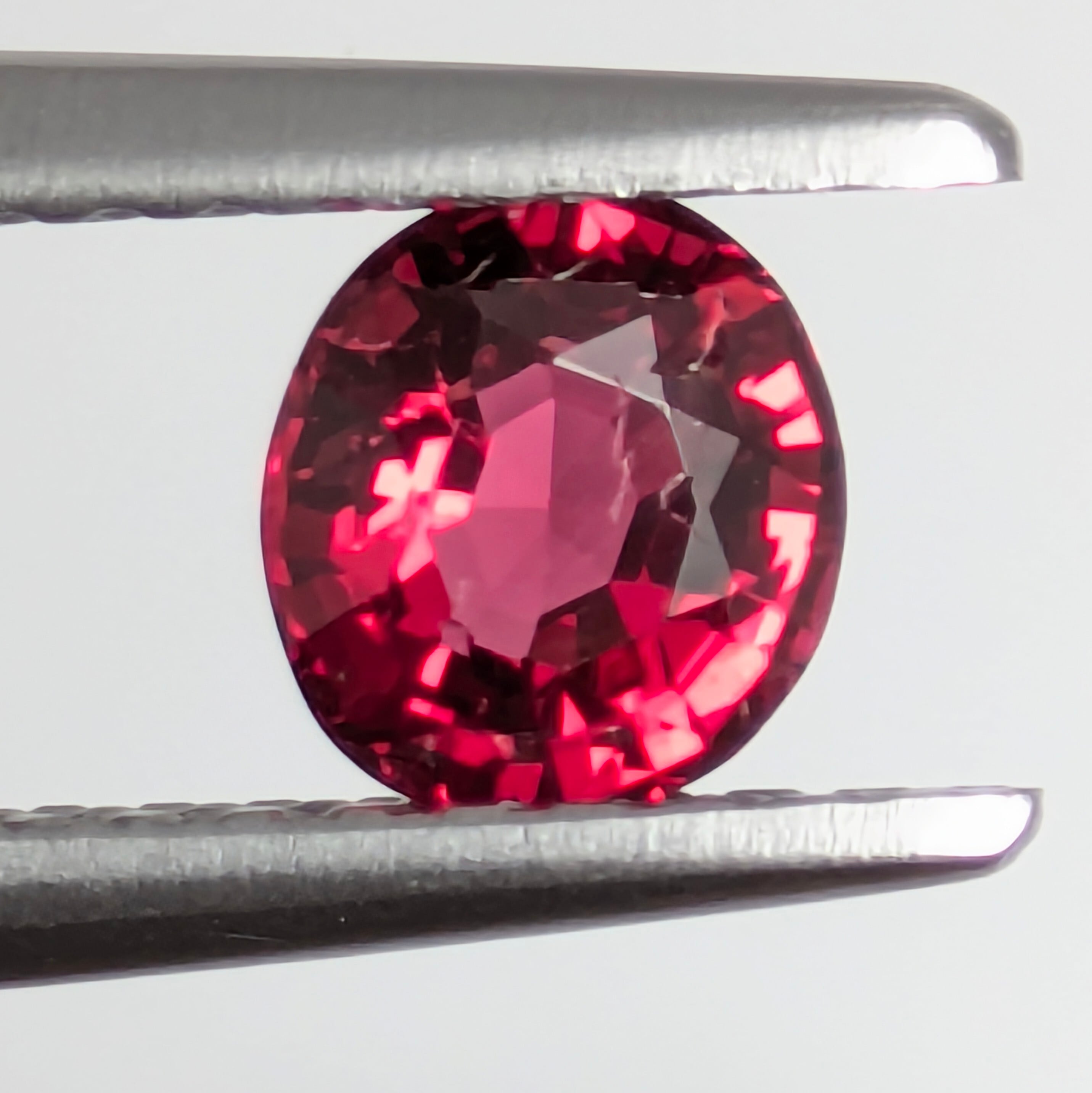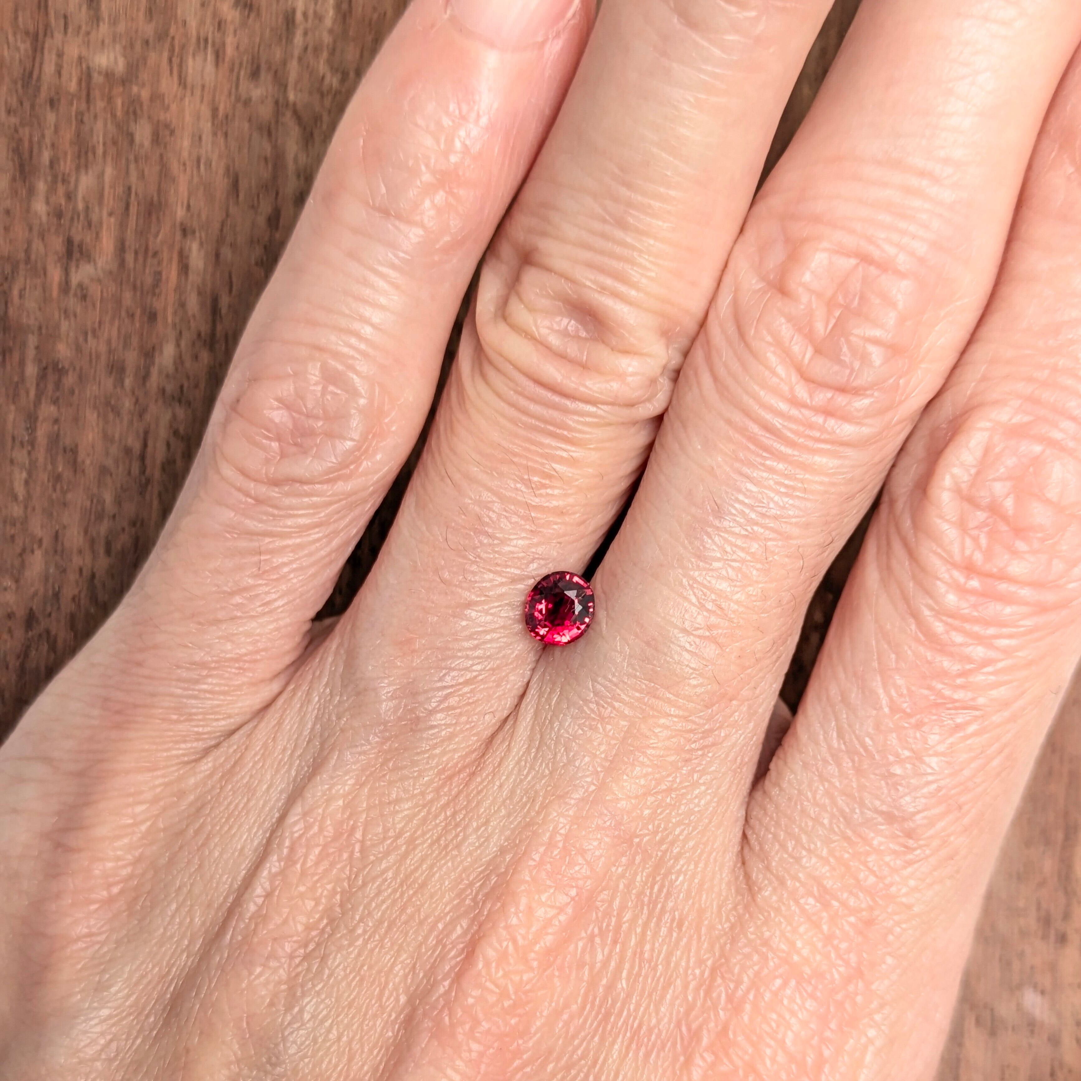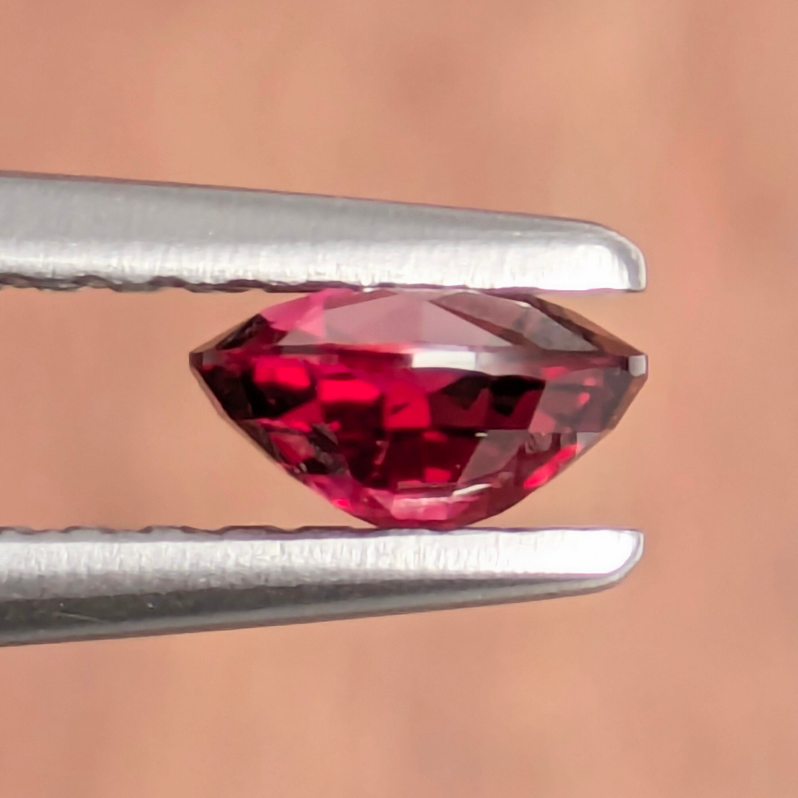とても美しい赤色の輝きに、まず目を奪われる一粒。肉眼での印象は、かなり純色に近い赤色に感じます。主なインクルージョンはテーブル面の端の方にあるちょっと大きめのフェザーですが、肉眼で濁って見えたり、輝きを損なうようなものではありません。若干面の部分に生地足らずの部分がありますが、これは天然の石の「個性」として楽しんでいただきたいポイント。『完璧なものよりも、多少不完全な方が面白い』・・・これは人間も宝石も同じかもしれません。