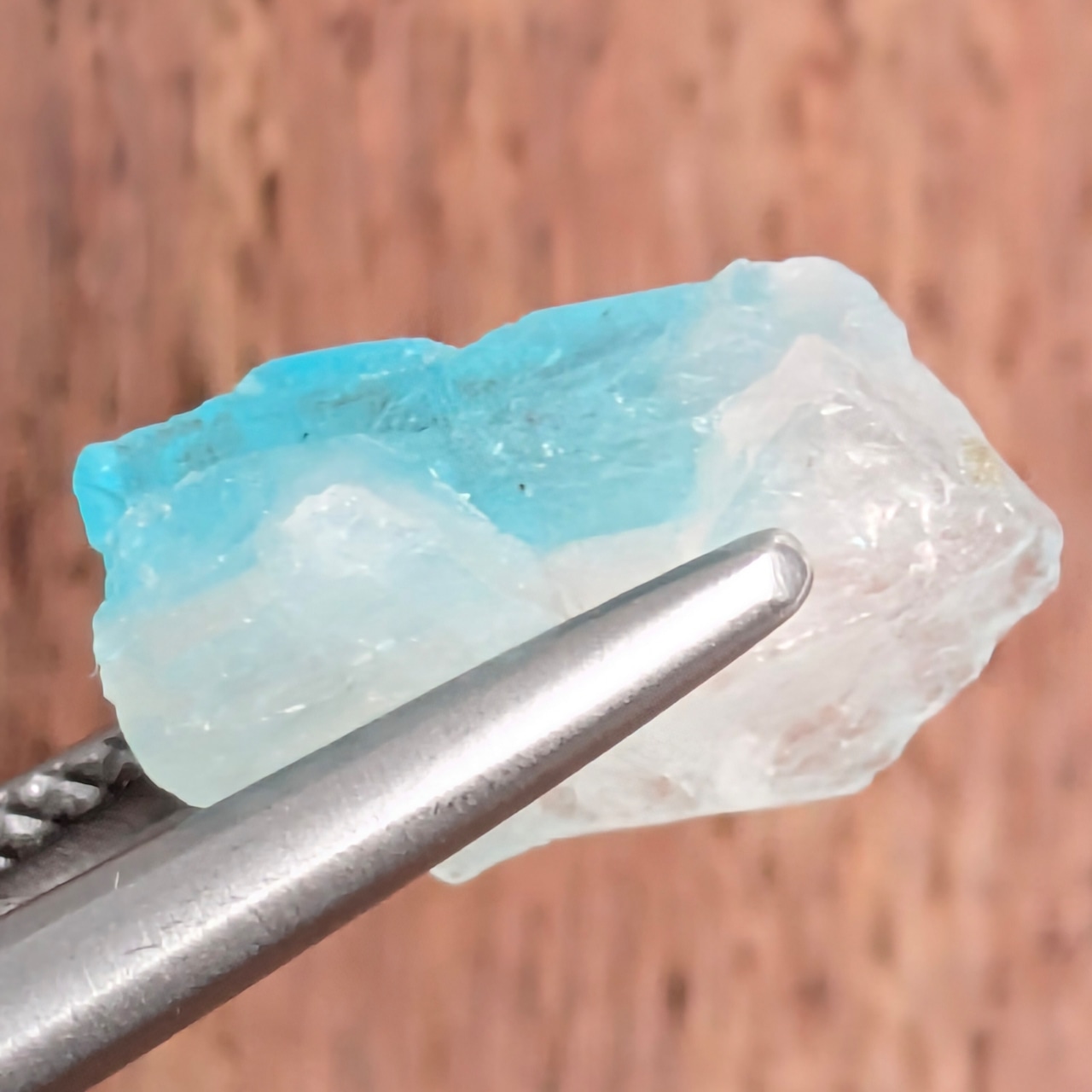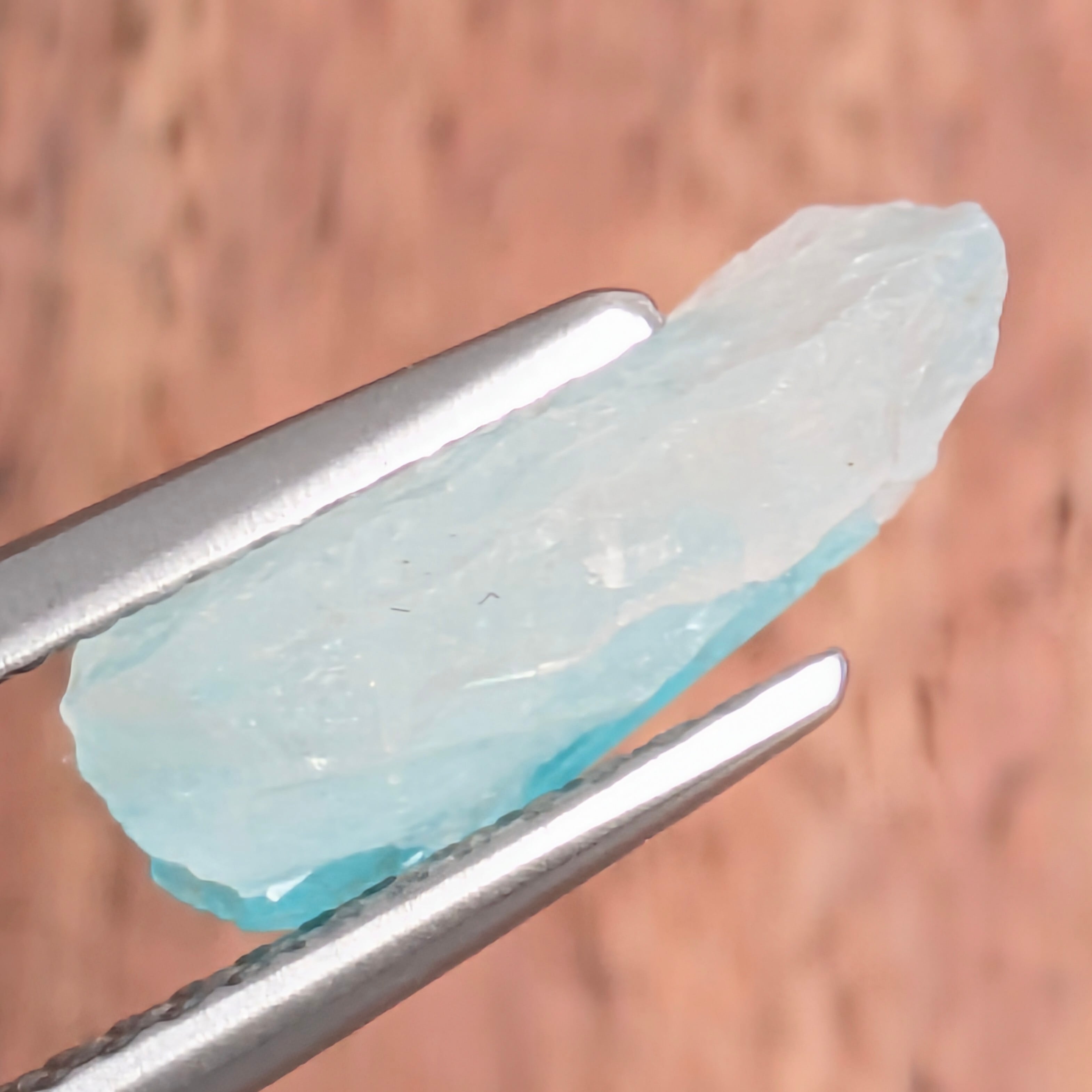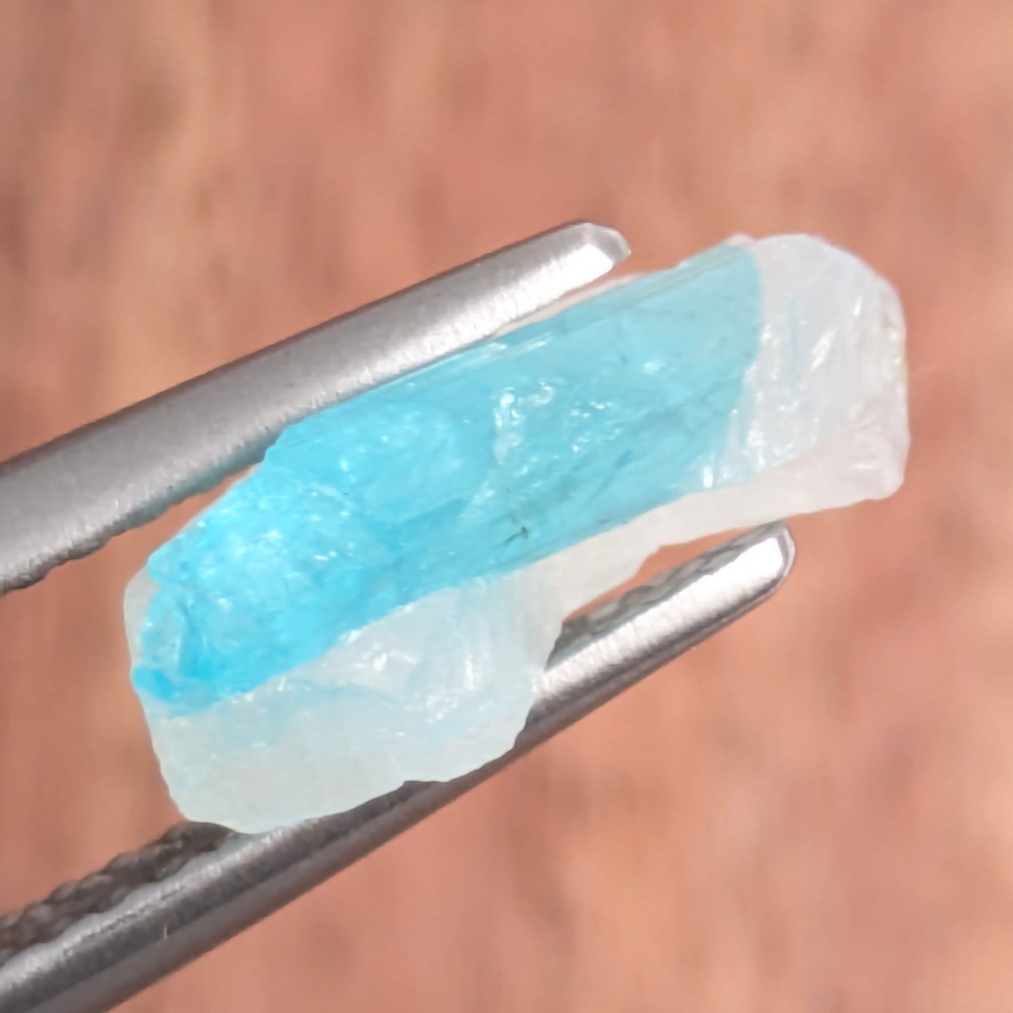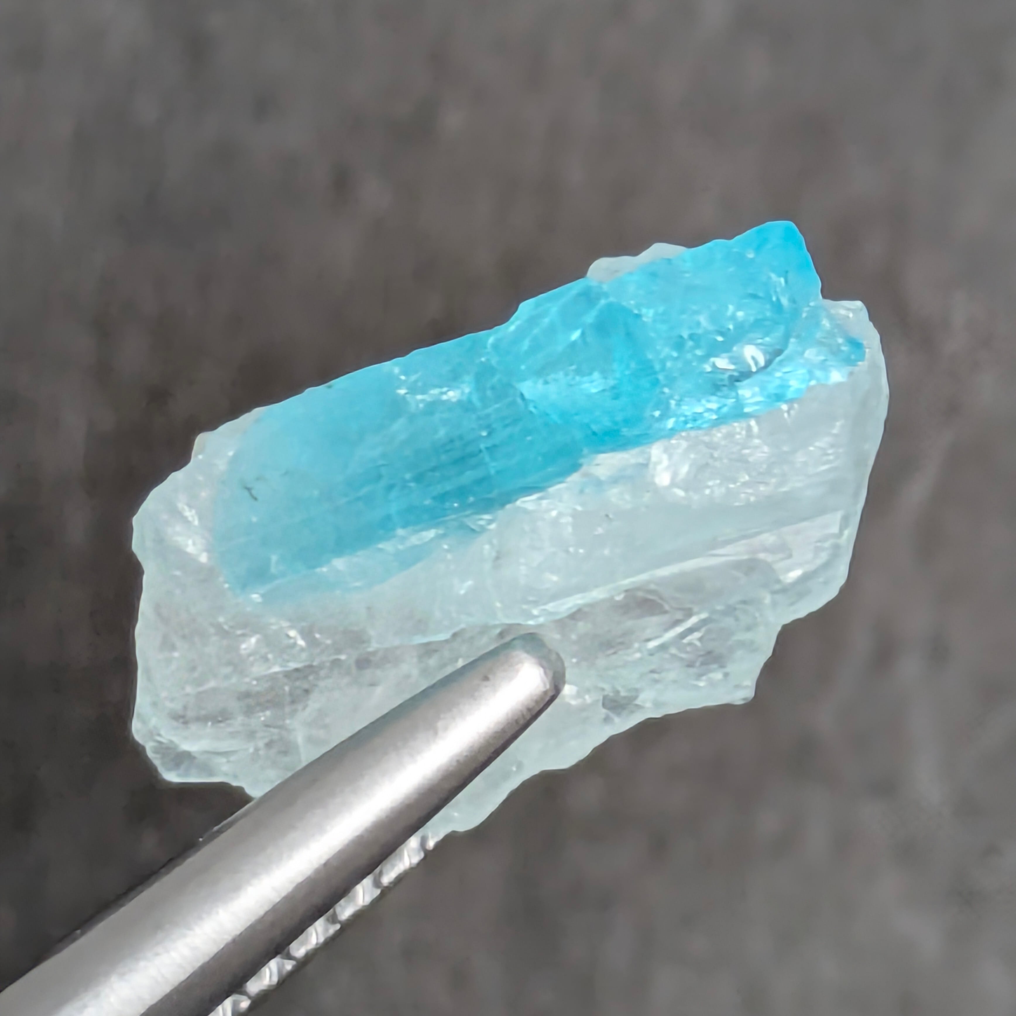 まるで空の雲に抱かれた、青空のカケラのようにふんわりと原石に留まったパライバトルマリン原石。動かしながらいろいろな角度から見ると、トルマリン原石特有の表面の条線が艶々と煌めき、「私を磨いて!!とっても美しく輝くわよ・・・!」とこちらにアピールしているかのような生き生きとした美しさを感じます。カットの醍醐味の一つは、「原石を最大限に生かした形に切り出す」こと。もし自分が宝石研磨師だったら、どのようにカットするかな・・・?なんて、想像を巡らせるのも楽しいひと時です。