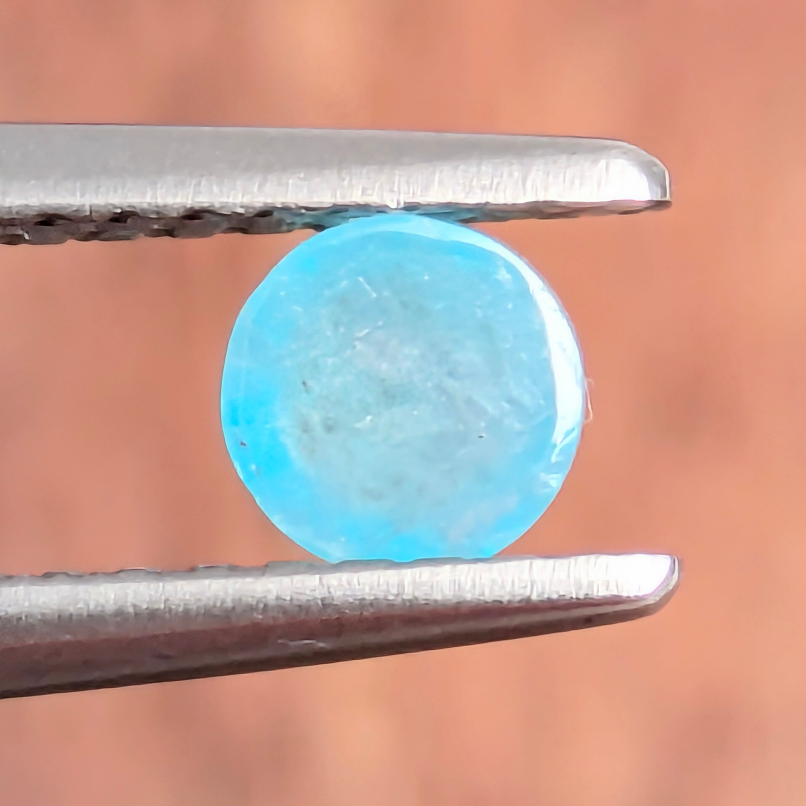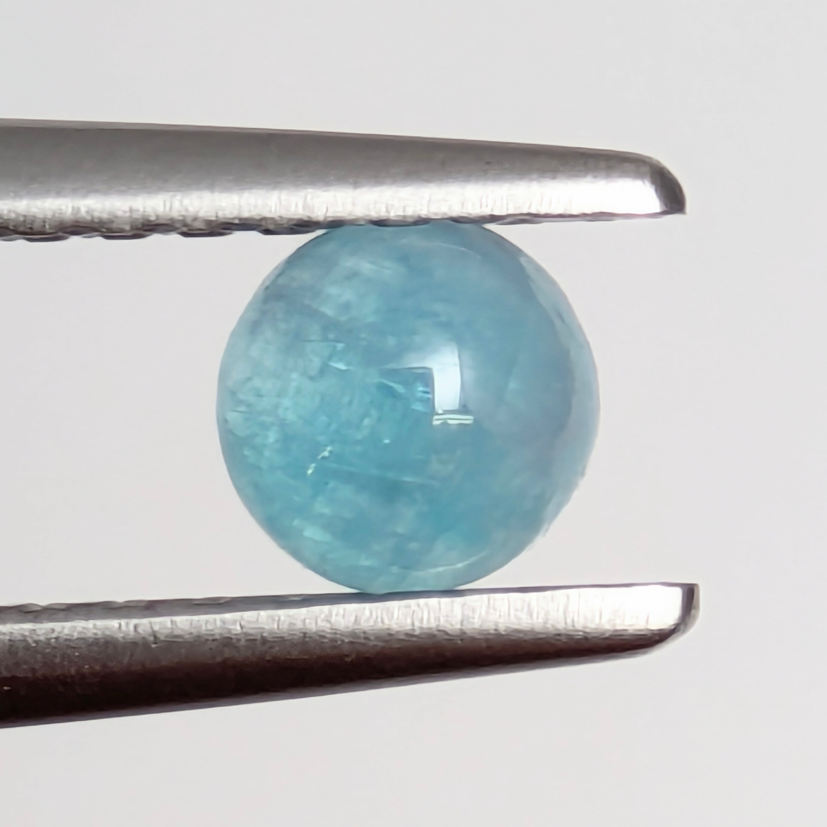 肉眼での見た目の印象は、艶々のとっても可愛らしいベビー・ブルーのパライバトルマリンのカボション。でも、どんなに可憐で可愛らしい見た目をしていても、その内部には「生まれいずる過酷さ」というものが宝石には刻まれています。ひとたびルーペで覗くと、まるで氷山のぶつかり合うギシギシとした軋みが聞こえてきそうな、雄々しいインクルージョンが・・・!見た目だけでは測れない、秘めた力強さを感じる1ピースです。
