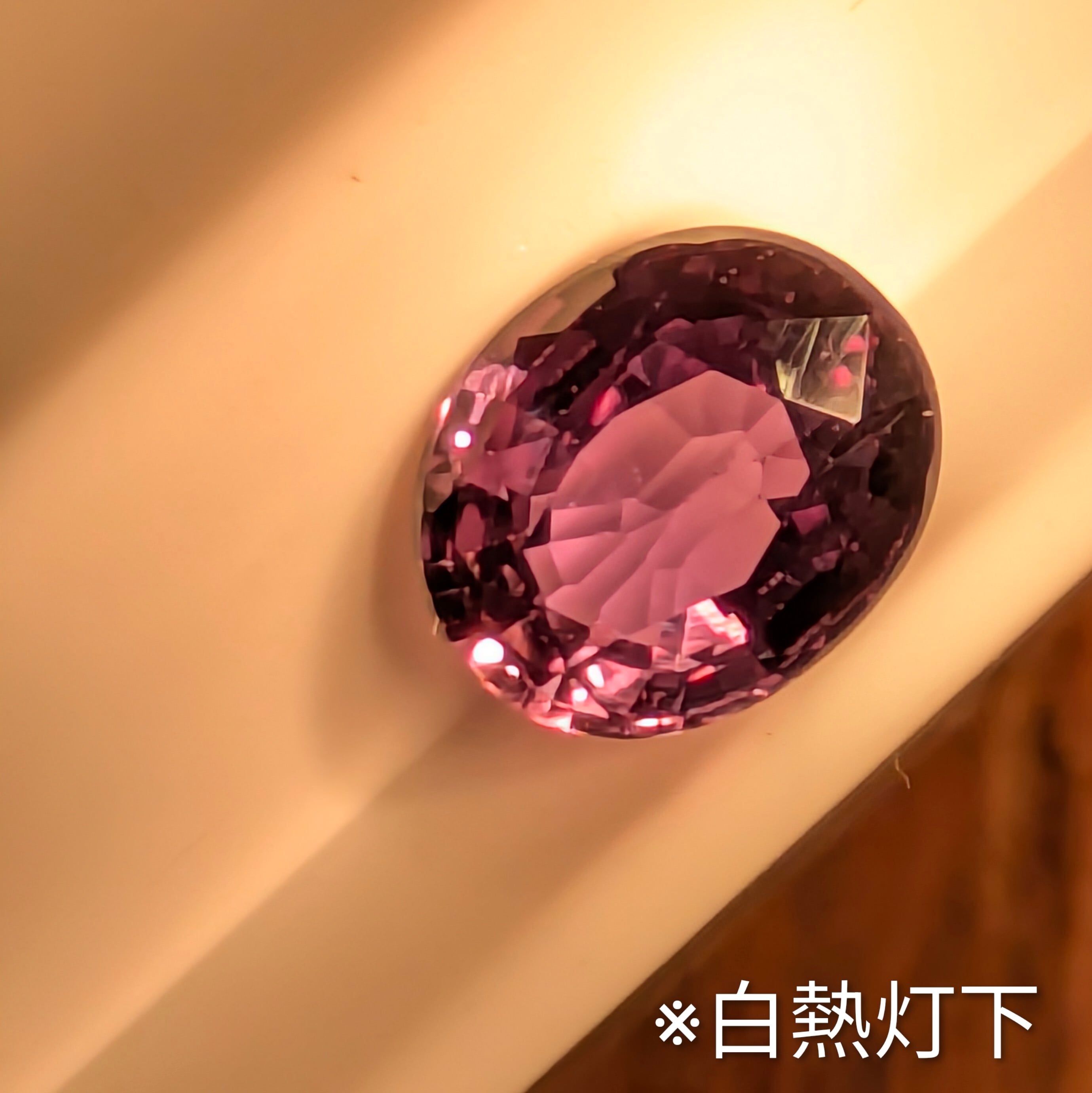 落ち着いた紫色から、光を変えることで妖艶な赤紫色にその姿を変えるカラーチェンジ・サファイア。通常光(紫色)と白熱灯(赤紫色)でその姿を一変させます。その様は、私たち人間も誰しもがきっと隠し持っている『もう一人の自分』。どちらが良いとは言い切れませんが、それぞれに美しく個性的で、紛れもなく『そのものの本質』なのだと気づかせてくれます。インクルージョンもほとんどなく、透明度高く綺麗な1ピースです☆
