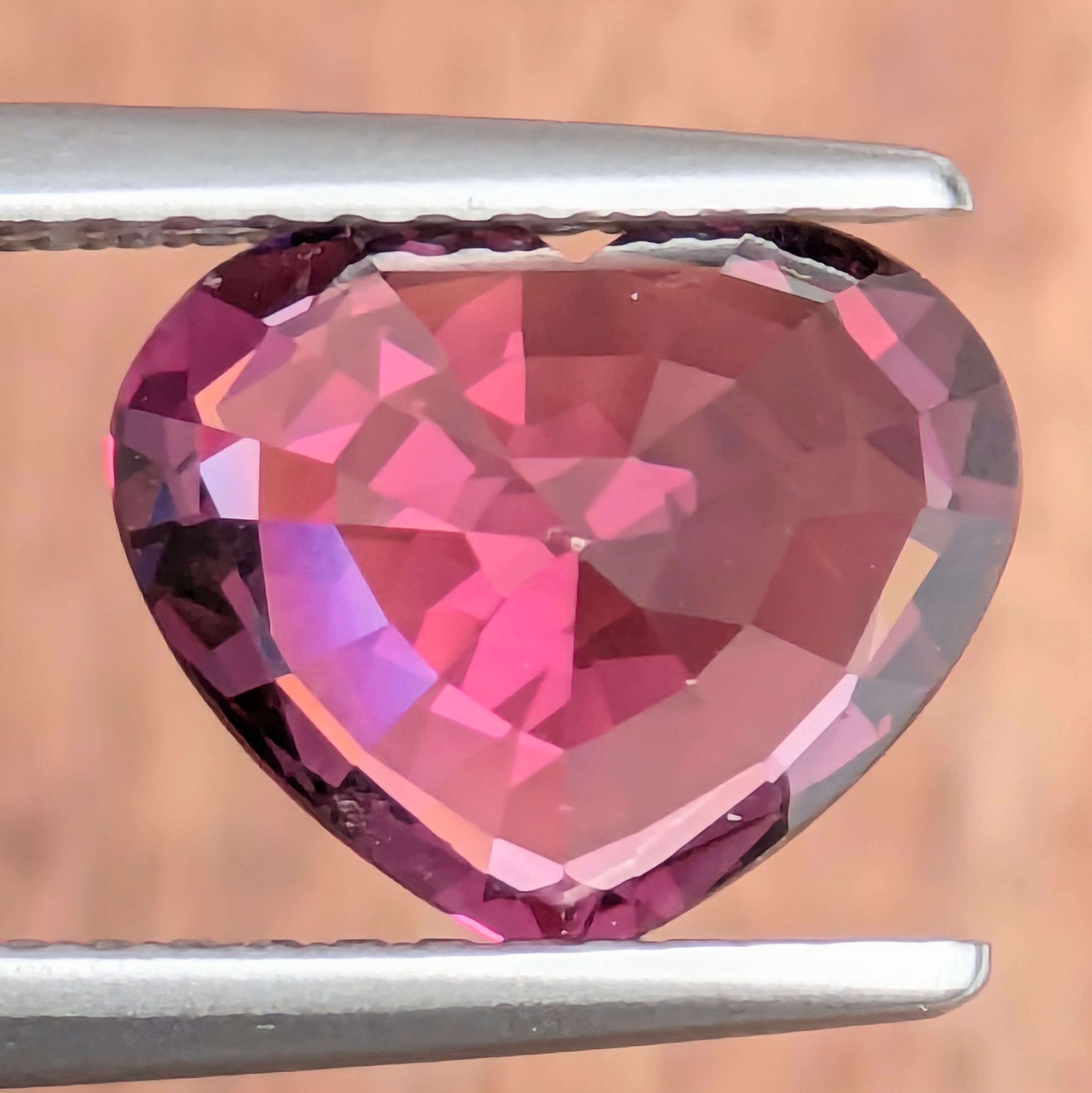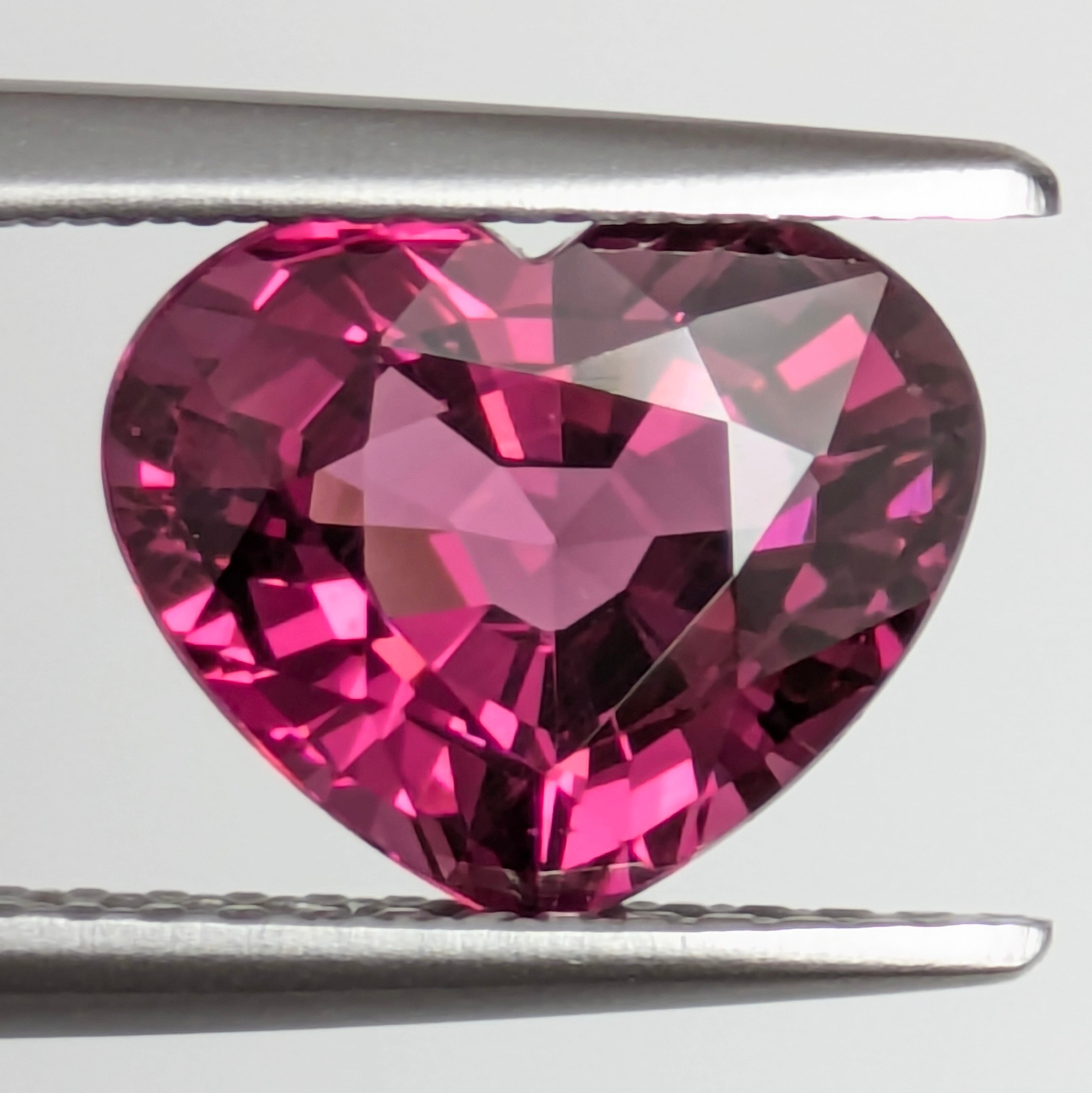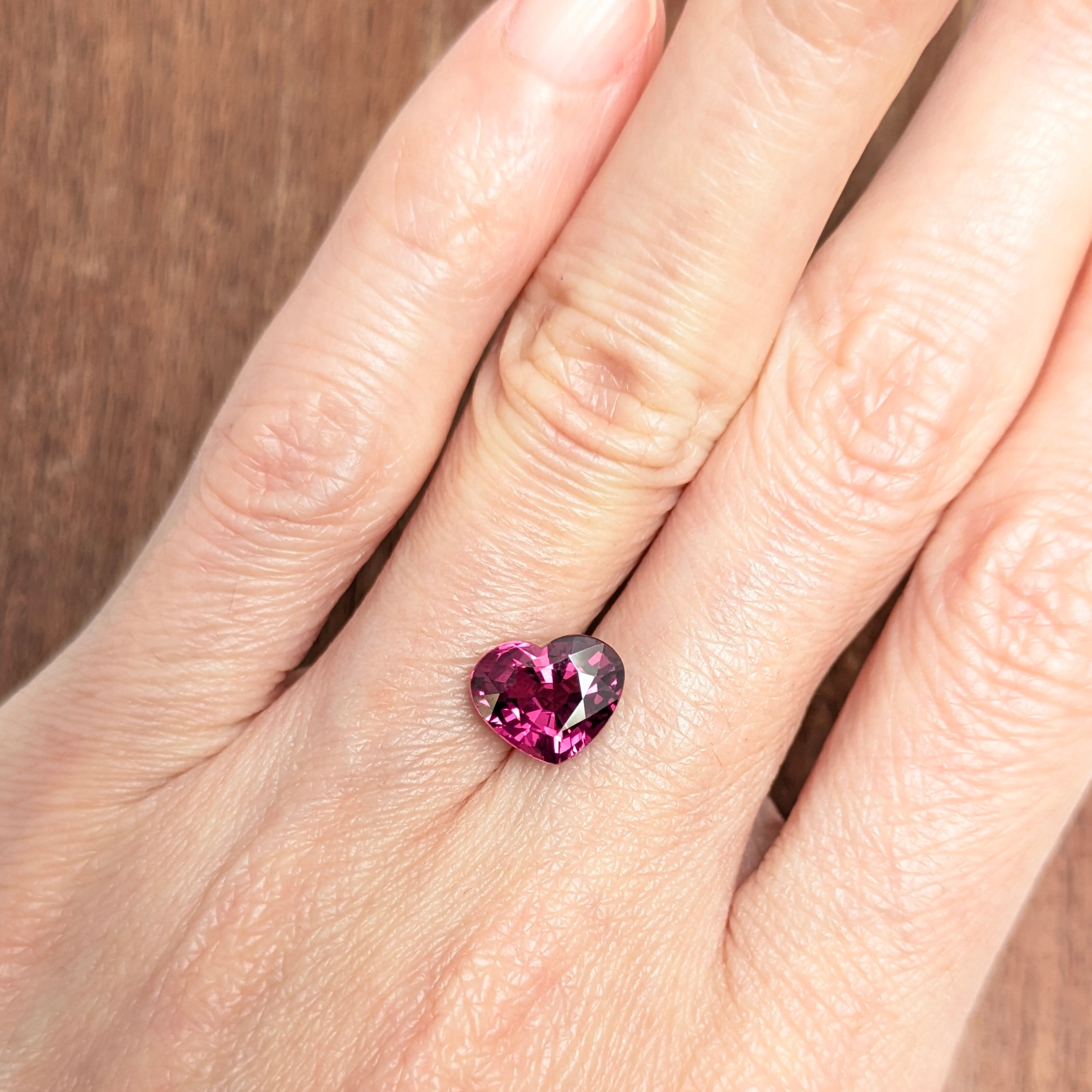 実物はもっと色鮮やかでコクのある色合い。何といってもこのフォルムのバランスの良さ、透明感とテリ、そして色の美しさに一目惚れしてしまう1ピース。「ロードライトらしい色」と、「ガーネットに特徴的なシルクインクルージョン」という理想的な個性を持っています。「ハート型」という形もあって、降りしきる想いの雨のように内包されたシルクのエモーショナルなその姿に、ついつい「もう一回・・・」とルーペで覗き込んでしまうこと請け合いです☆