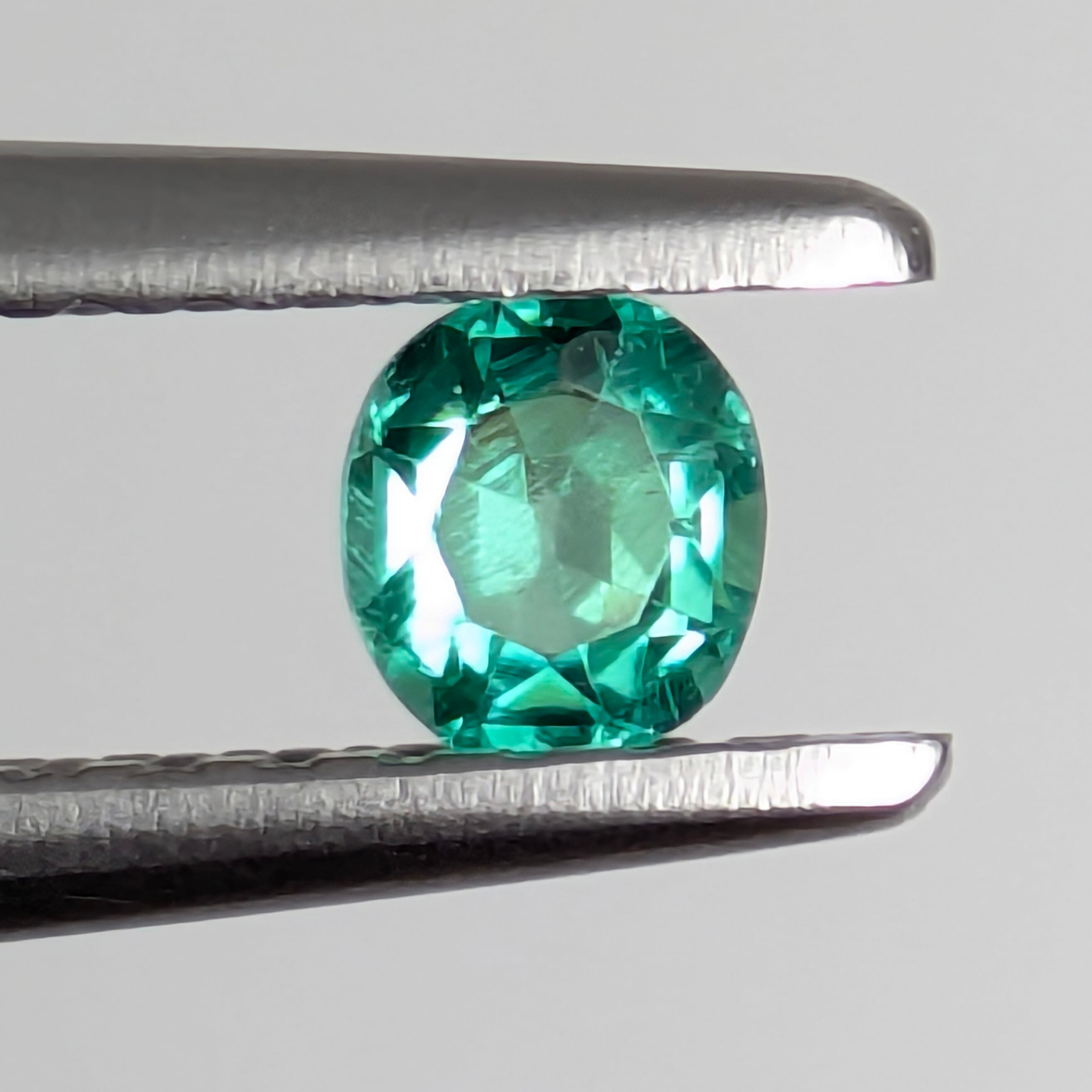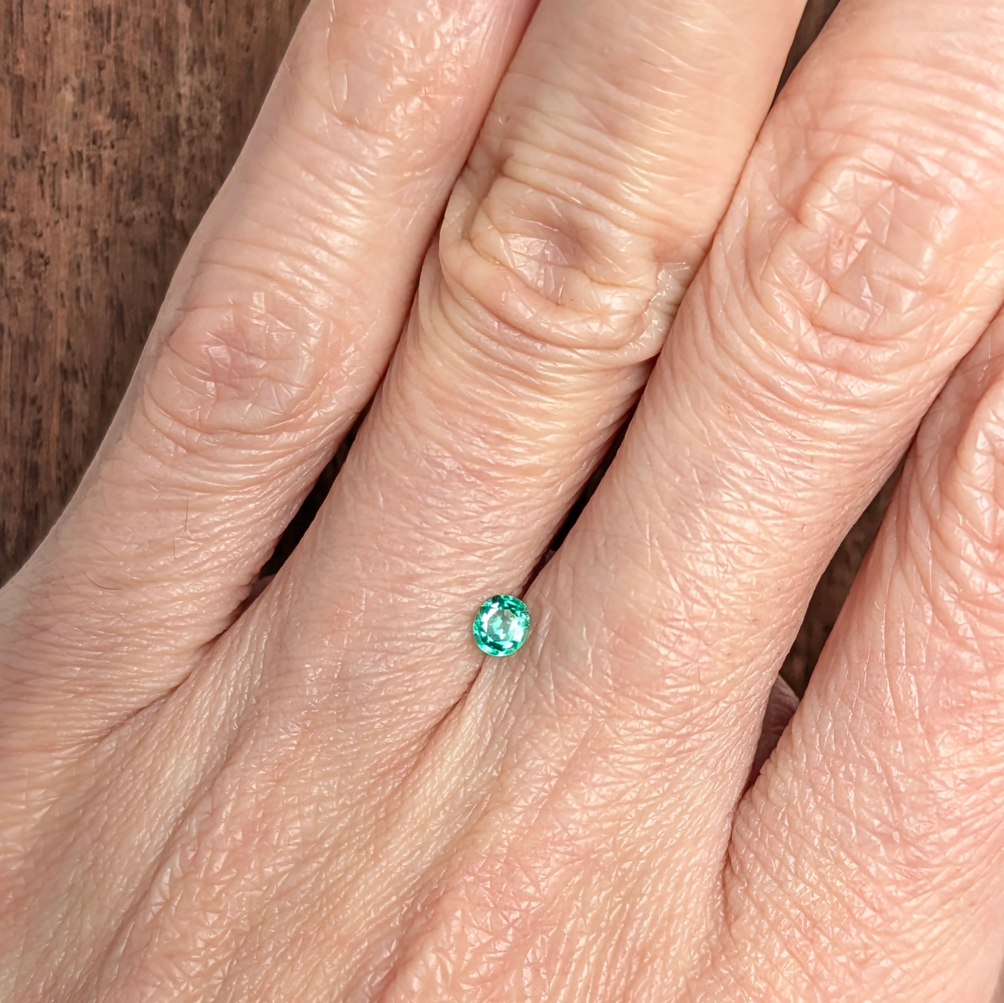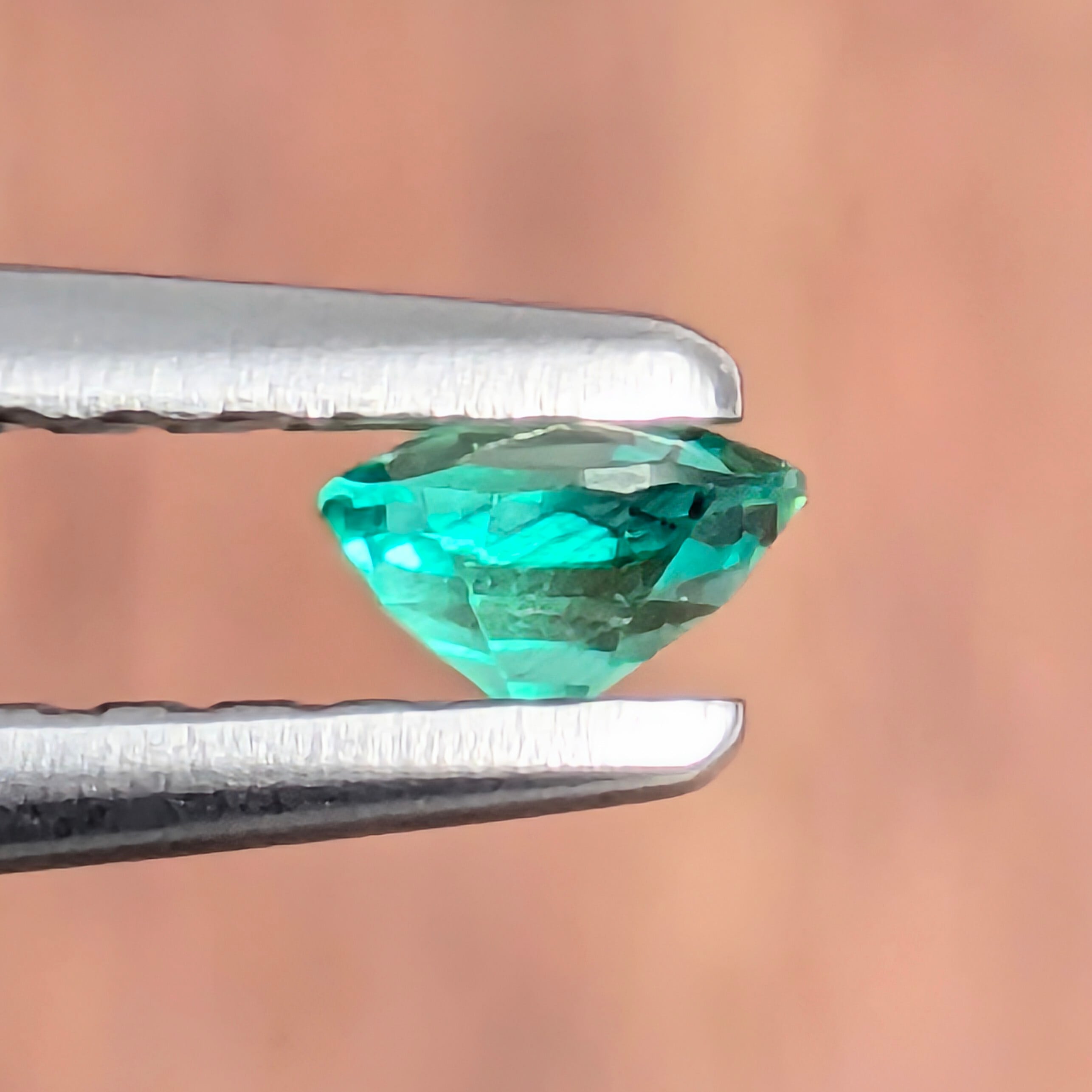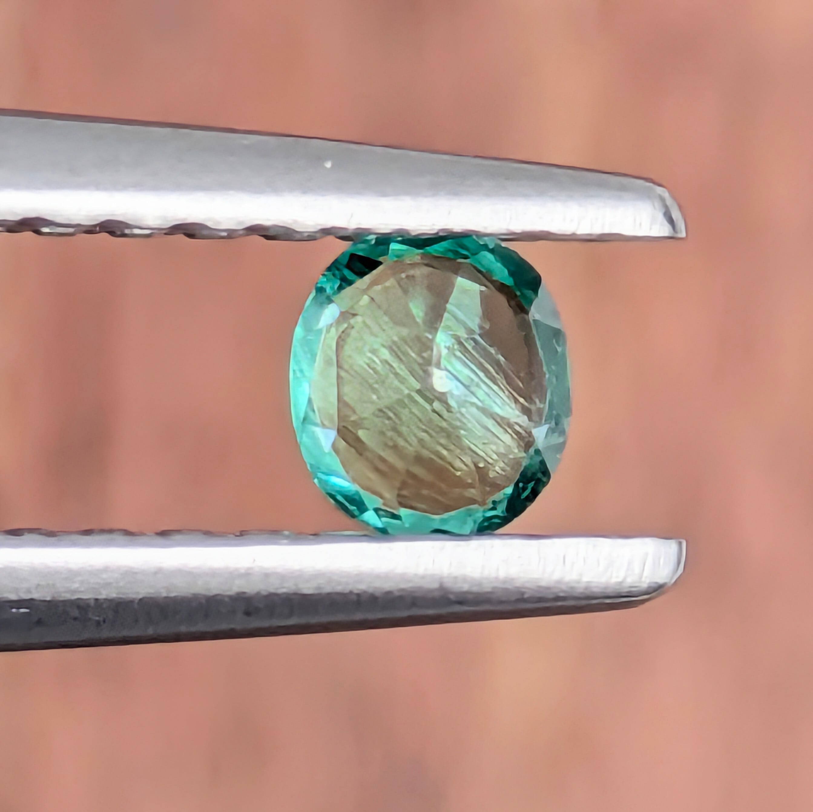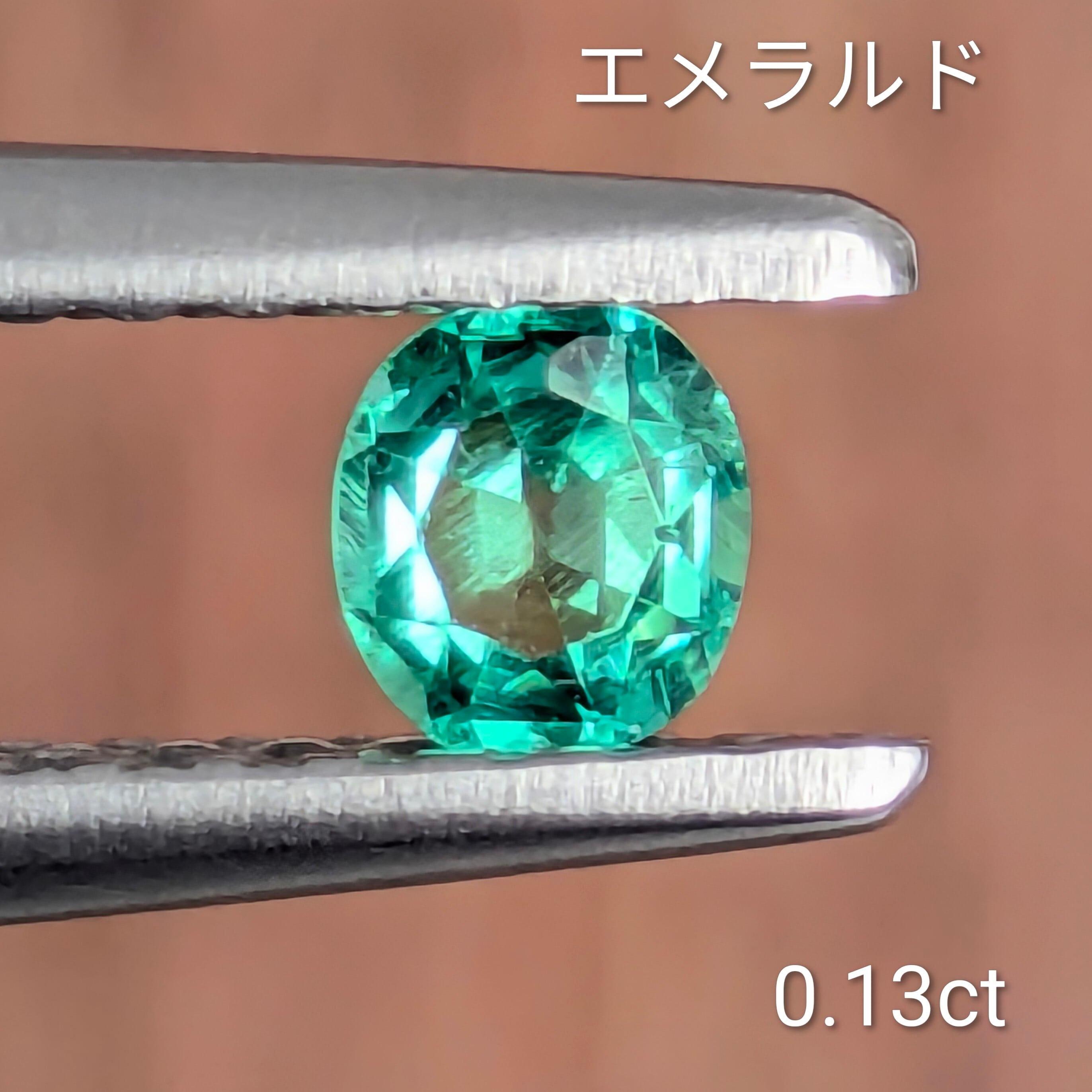 肉眼で見ると、何やらネオン感すら感じる美しいライト・グリーンのエメラルド。コロンビア産のビビッドなグリーンと比べて、また違った瑞々しさと魅力を感じる1ピースです。インクルージョンは、一番最初に目を惹くのはうっすらと何本も横切って見える針状のインクルージョン。トレモライト系かな・・・とも思うのですが、傾けるとわずかに虹色に煌めき、まるで新緑に降り注ぐ春の雨のようです。とはいえ、もちろん肉眼では見えません。とても綺麗な色とテリの1ピースです。