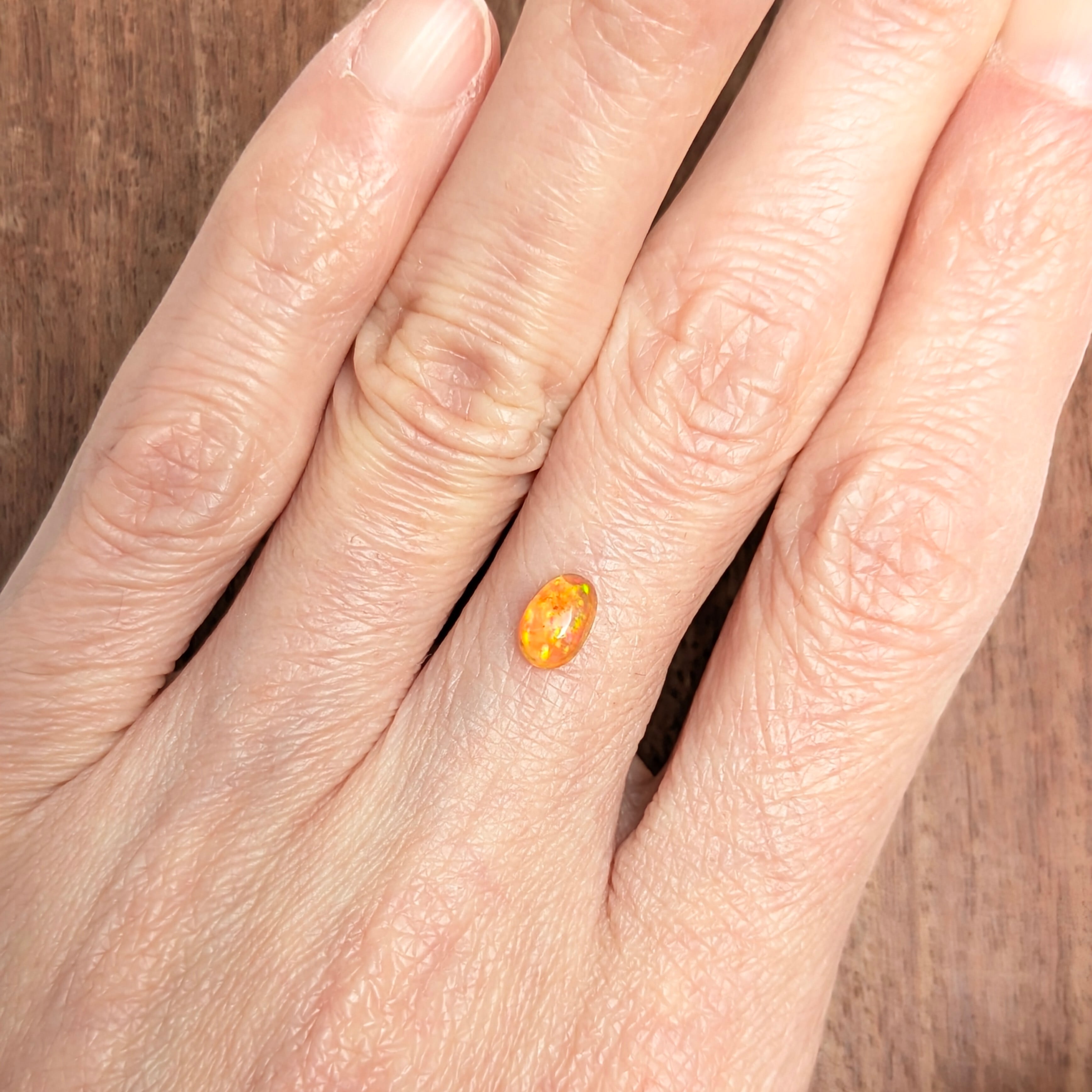 チラチラと、炎が爆ぜる音まで聞こえてきそうなファイアオパール。美しいオレンジ色の地色に負けず、虹色の遊色もとても美しく見える1ピースです。一つ一つの斑は小さめですが、7色すべてが詰まった奇跡の一粒。空を映し、森を映し、色とりどりの花々までも映しとったような賑やかさ。パチパチと燃える焚火の炎のように、ちょっとホッとするような、ちょっと自然界の脅威を感じるかのような、そんな不思議な色と揺らめきに釘付けになってしまう1ピースです。