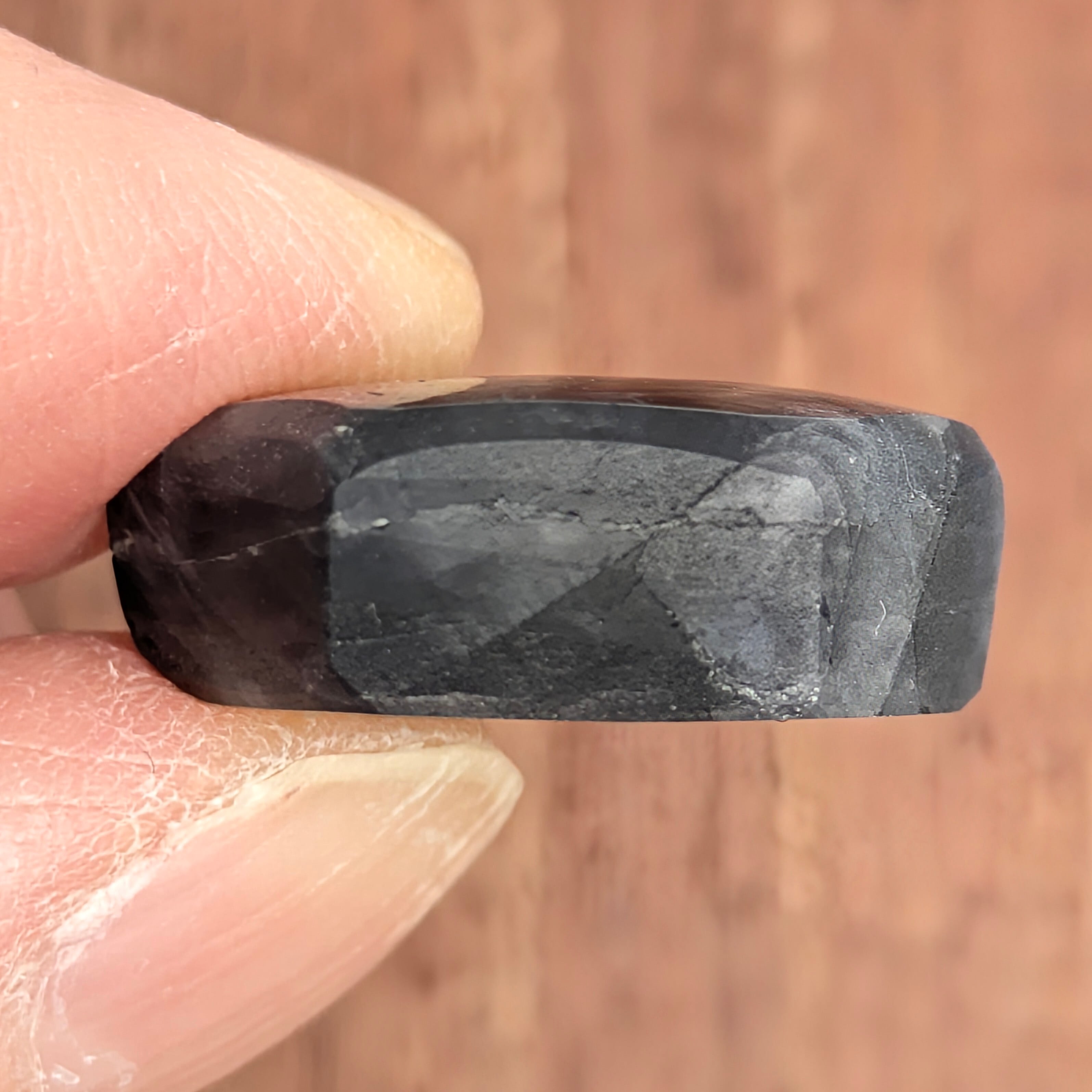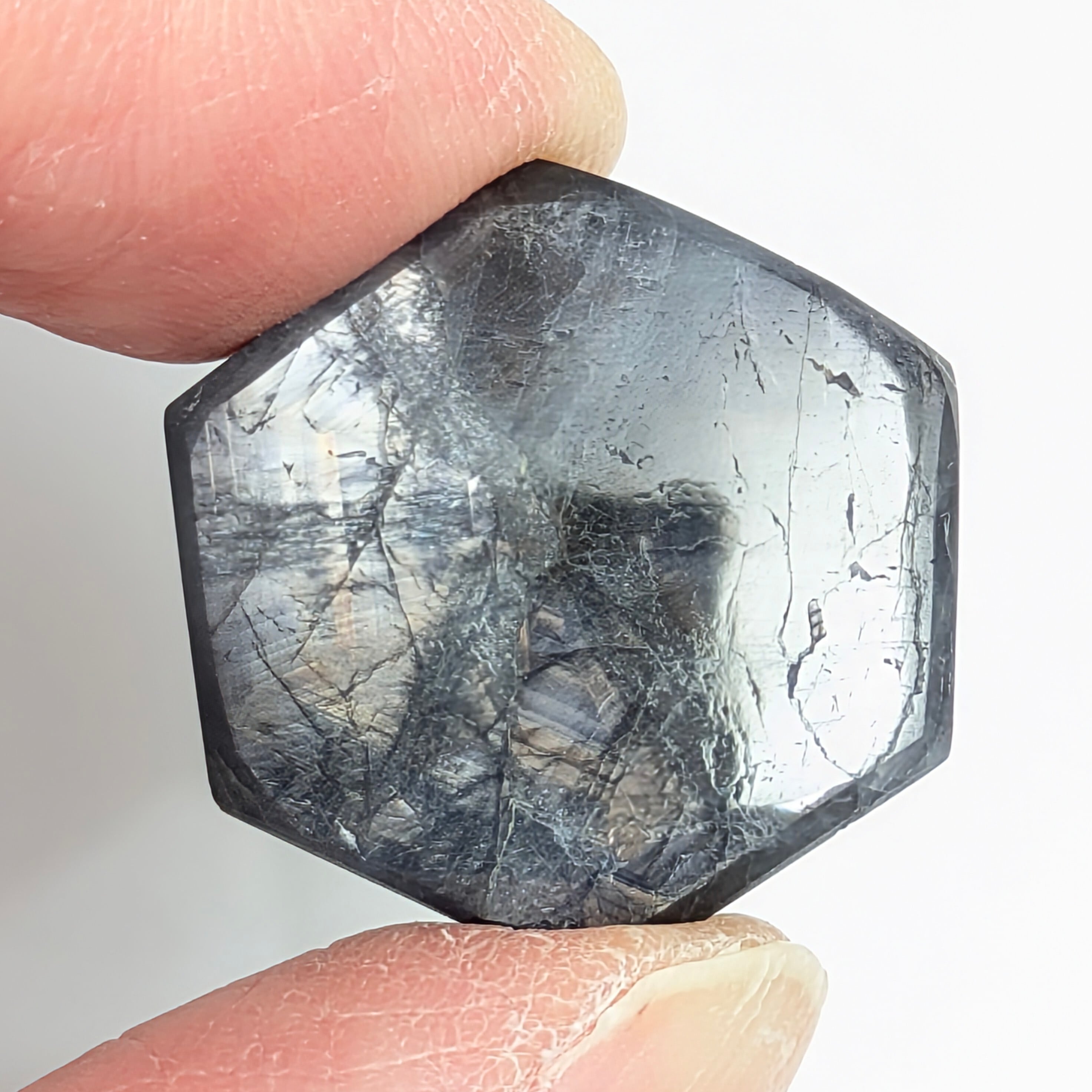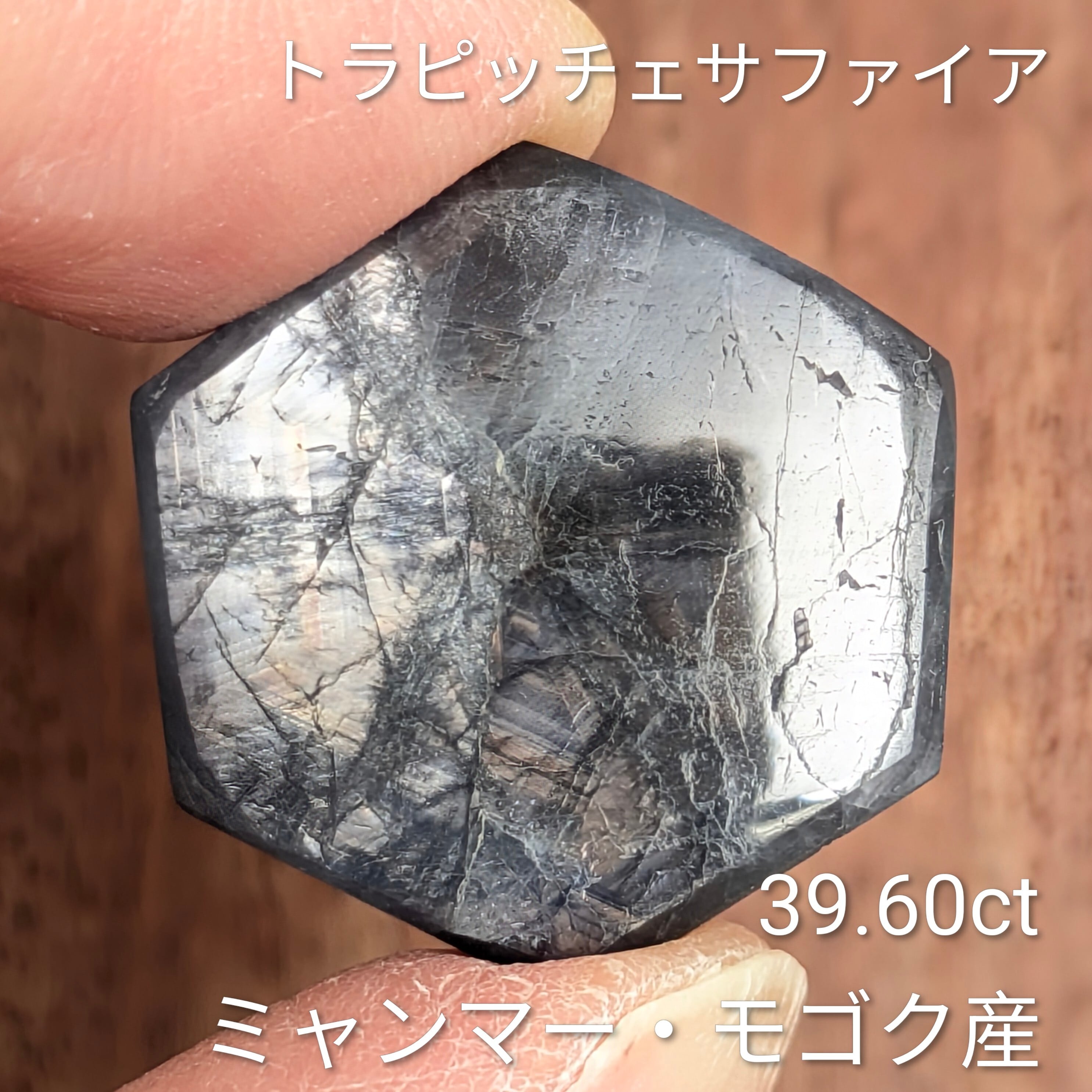 グレーのシックな地色に、金属光沢と独特な歯車模様が個性的なサファイア。39.60ctの、だいぶ大きめのトラピッチェ・サファイアです。模様を強調するかのように六角形の外形にカットされ、それ以外は余分な加工を施していないタブレット状の1ピース。模様の面白さや艶感の美しさはもちろんなのですが、角度によって光の干渉から生まれる複雑な干渉色も、この石固有の面白さだと思います。