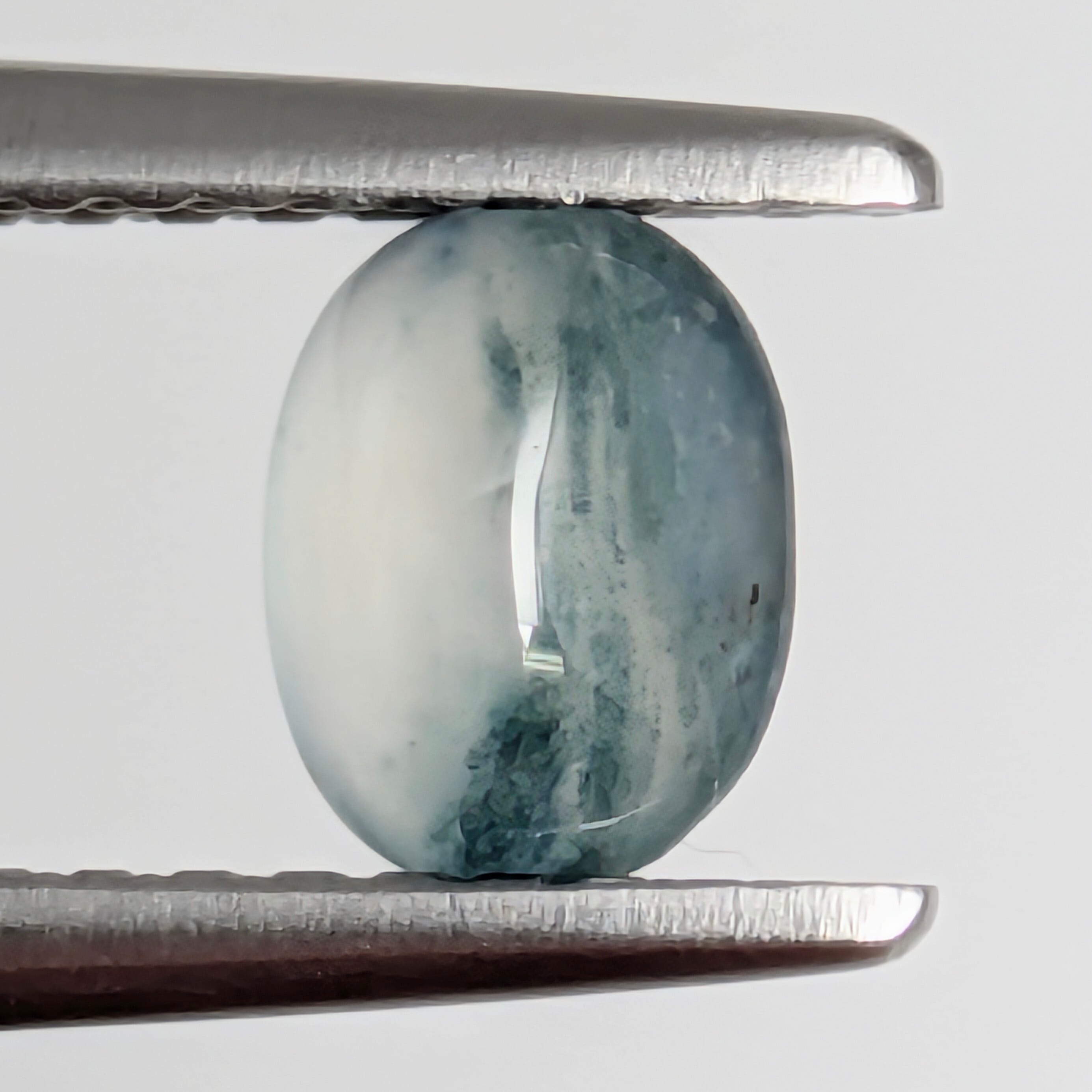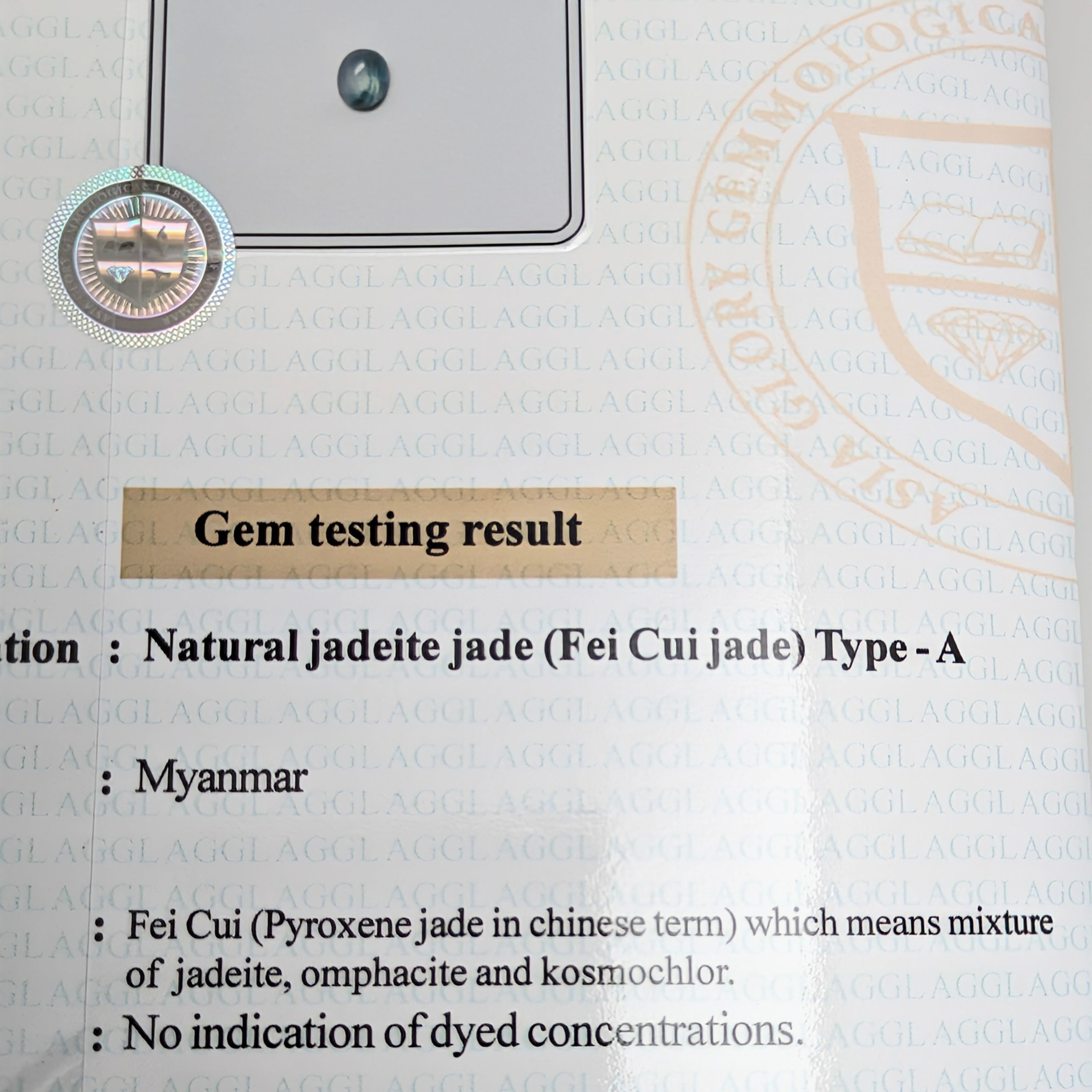 ご覧のとおり、乳白色のジェイダイトに所どころ深緑色の色ムラが見られるジェイダイト。日本の鑑別書ではなかなかこういった表記はないですが、付属の鑑別書には「アイスジェイダイト」の記載があります。あくまで、「アイスジェイダイトにグリーンの模様(Patches)があるよ」という表現です。こういった海外の鑑別機関の「見た目に忠実なカラー表記」は、とても個性的で正確だなと感じます。その模様は、雪解け時期の針葉樹を思わせる美しさです。