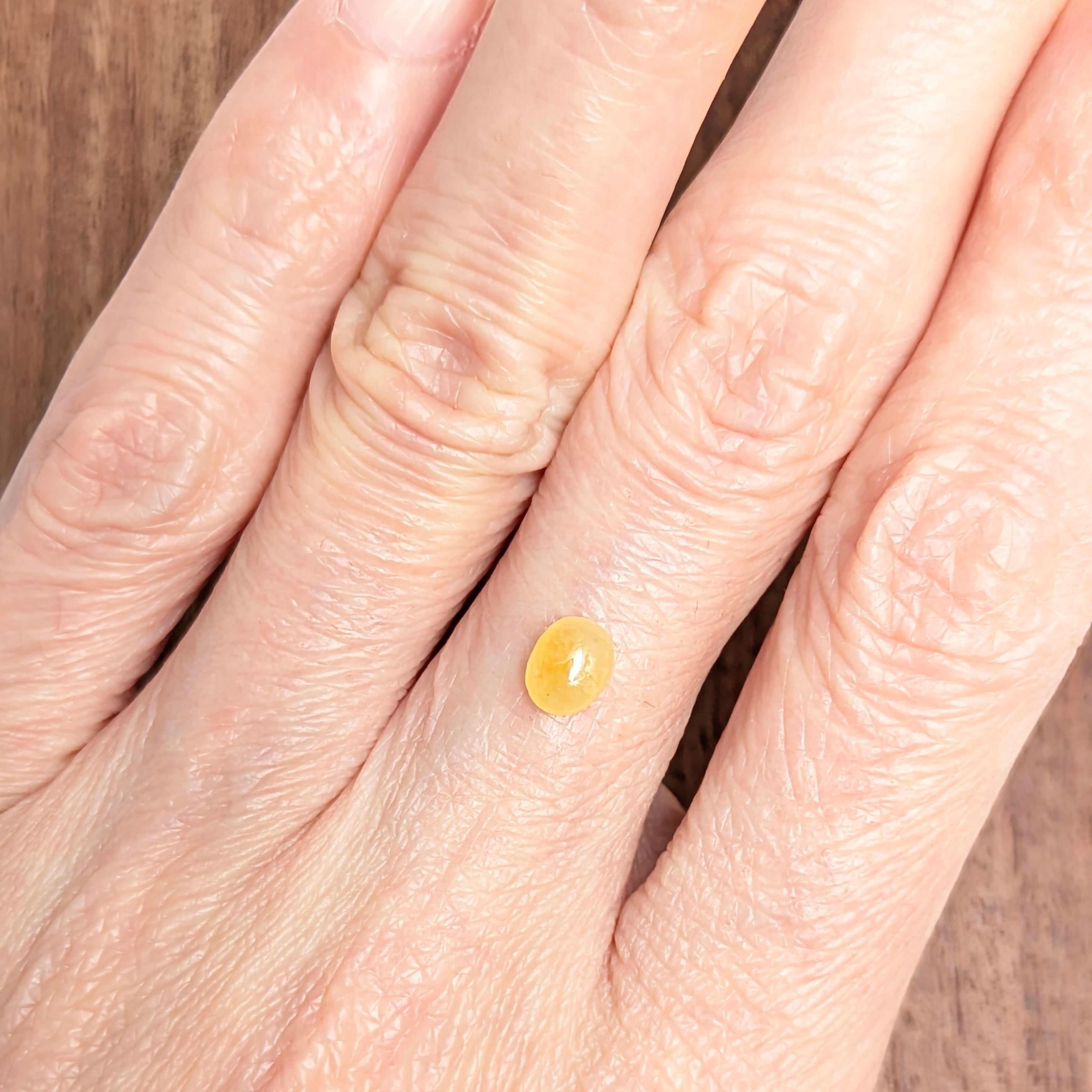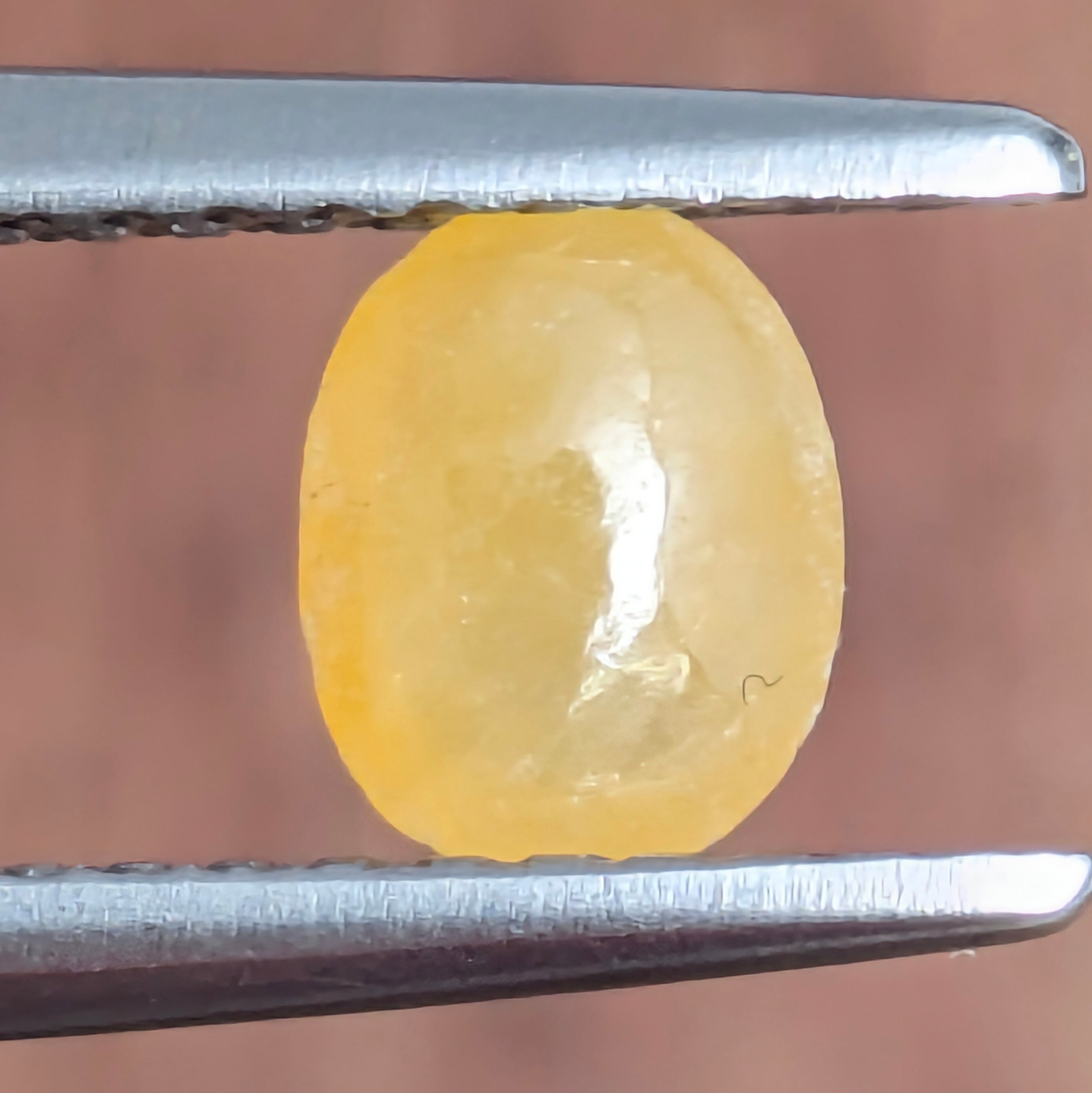 例えば、グリーンのジェイダイトは色因が「Cr(クロム)」だったり、ラベンダー色は「Mn(マンガン)」が原因だったりとそれぞれ言われていますが、今回ご紹介の「ブラウニッシュ系」のジェイダイトの色因は、実はまだはっきりしていません。今回ご紹介の1ピースは、「ブラウニッシュ」と付いてはいますが肉眼での印象は「はちみつ色」を思わせる彩度もありつつ艶やかな色合い。わずかに表面部分に凹みのような部分が見えますが、肉眼では全く気になりません。可愛らしい1ピースです。