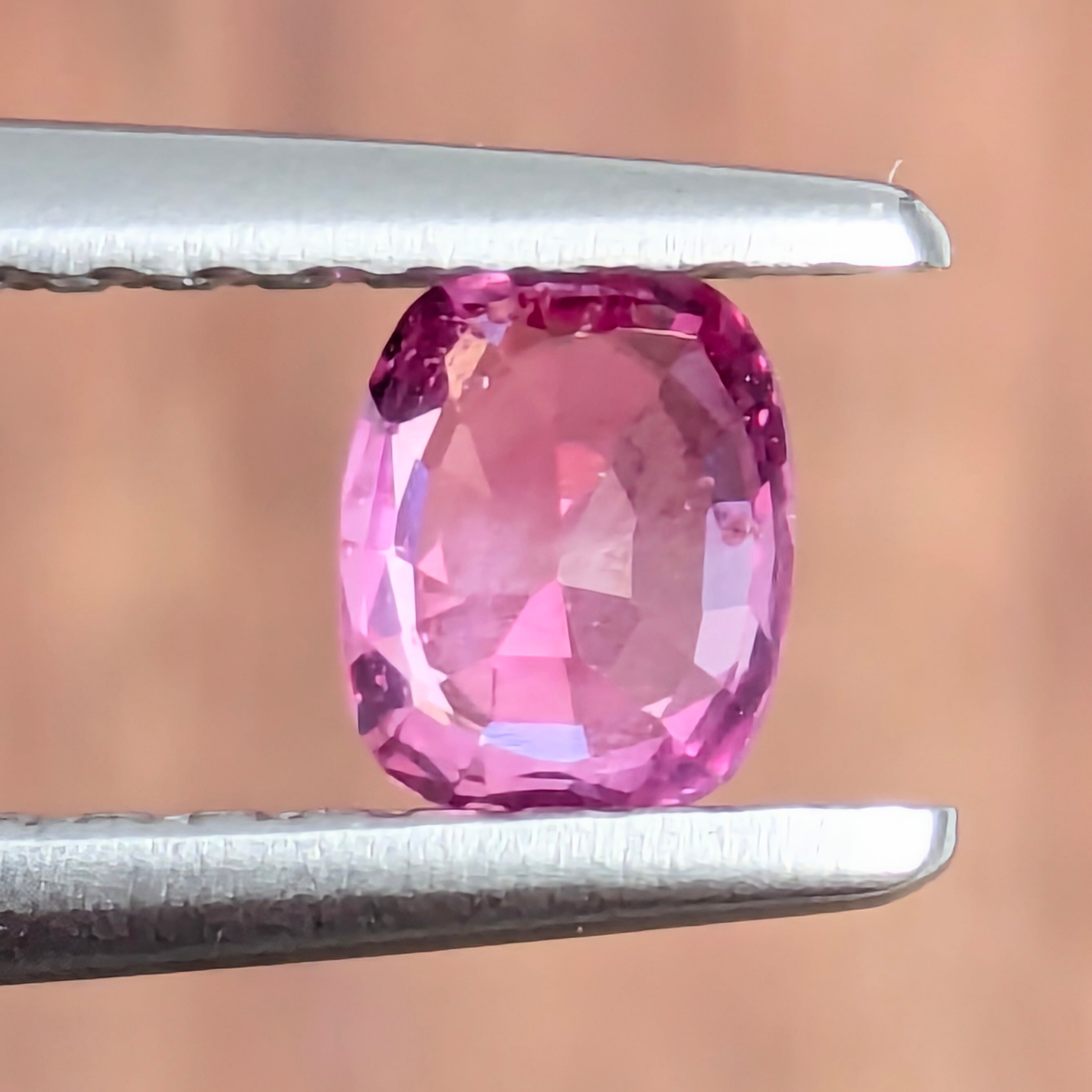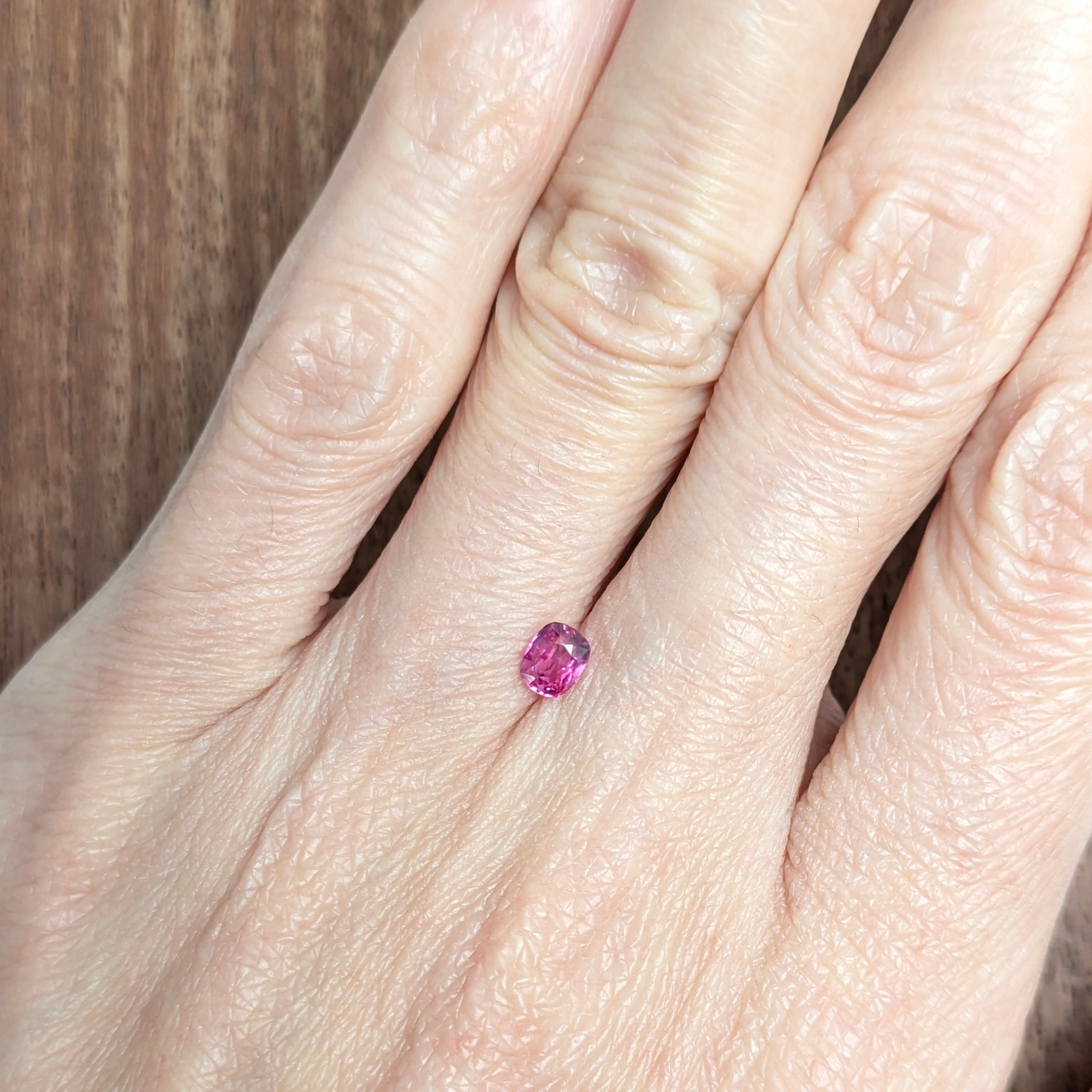 イチゴ果汁をぎゅっと濃縮したような、鮮やかなレディッシュピンク。石上部(クラウン部分)に原石の名残がありますが肉眼では気になりません。照り、艶、良し!の美しい1ピースです。