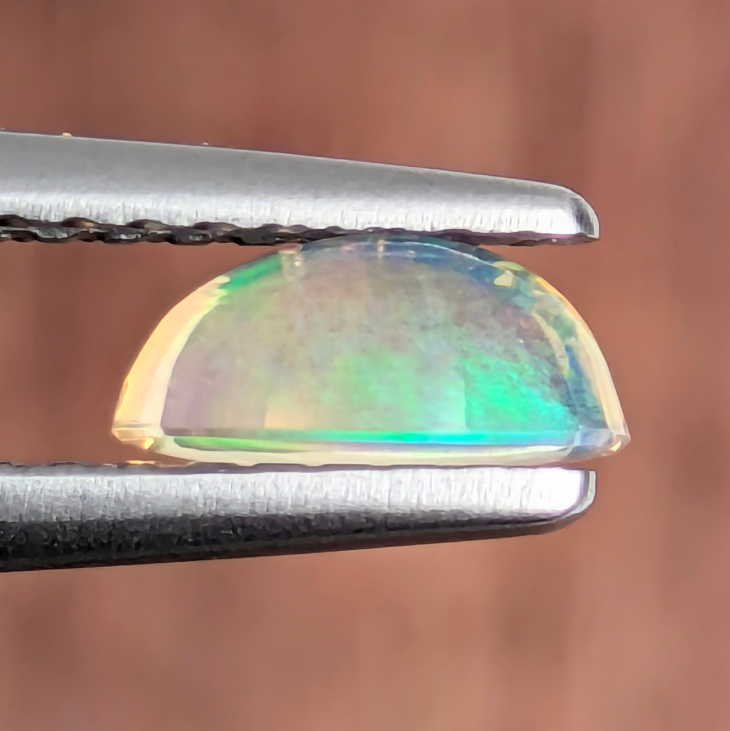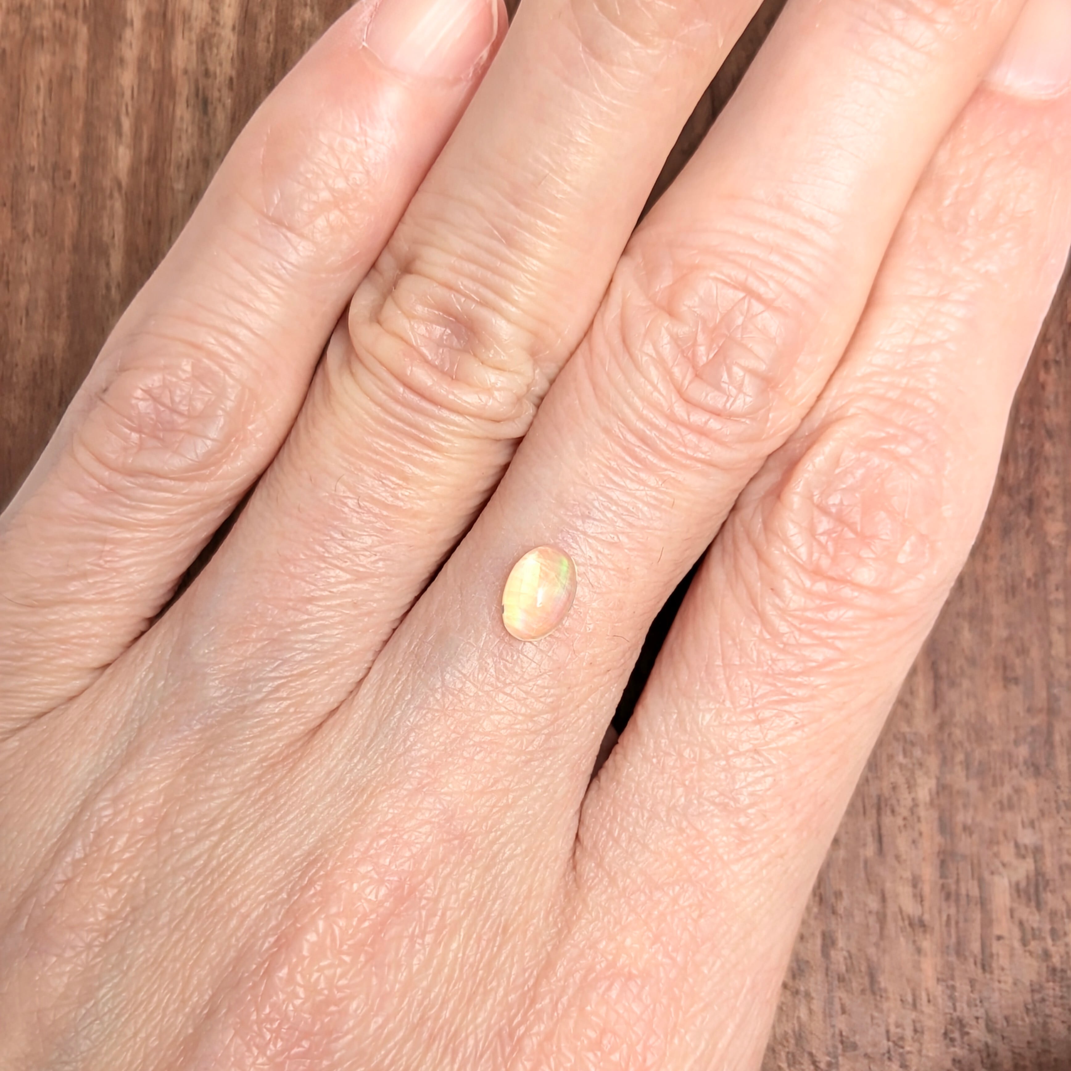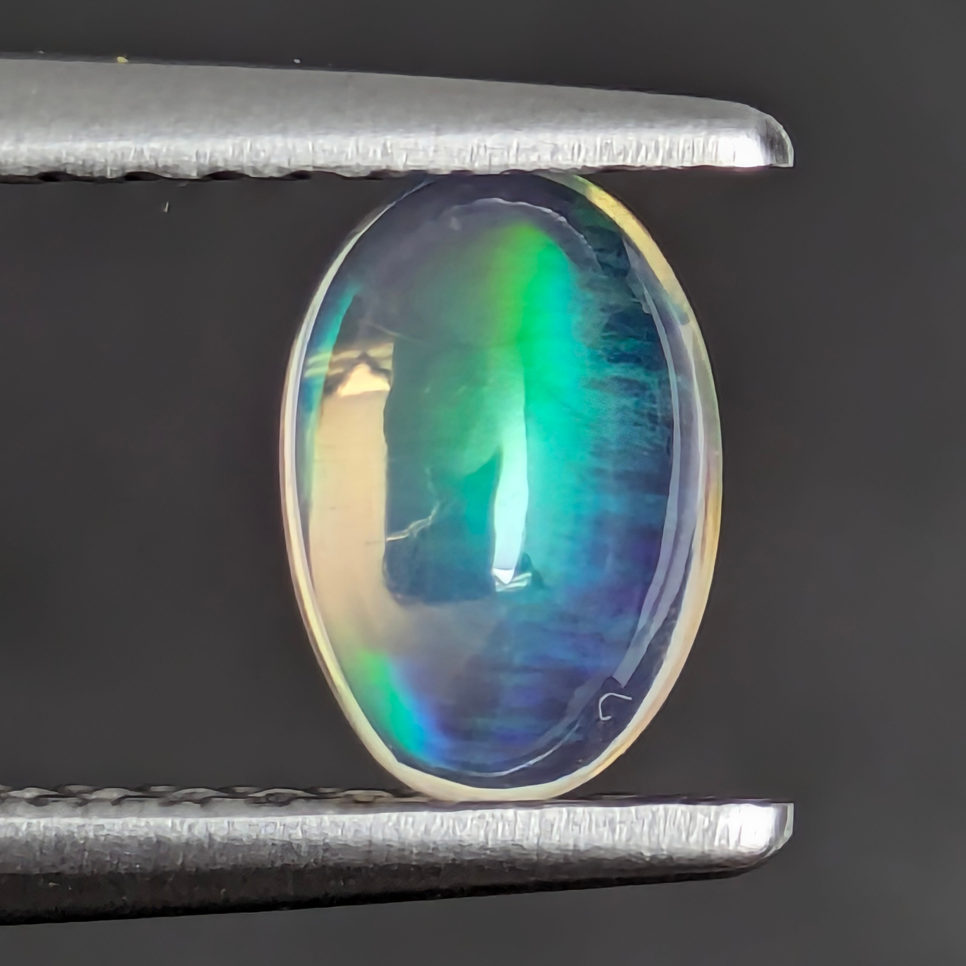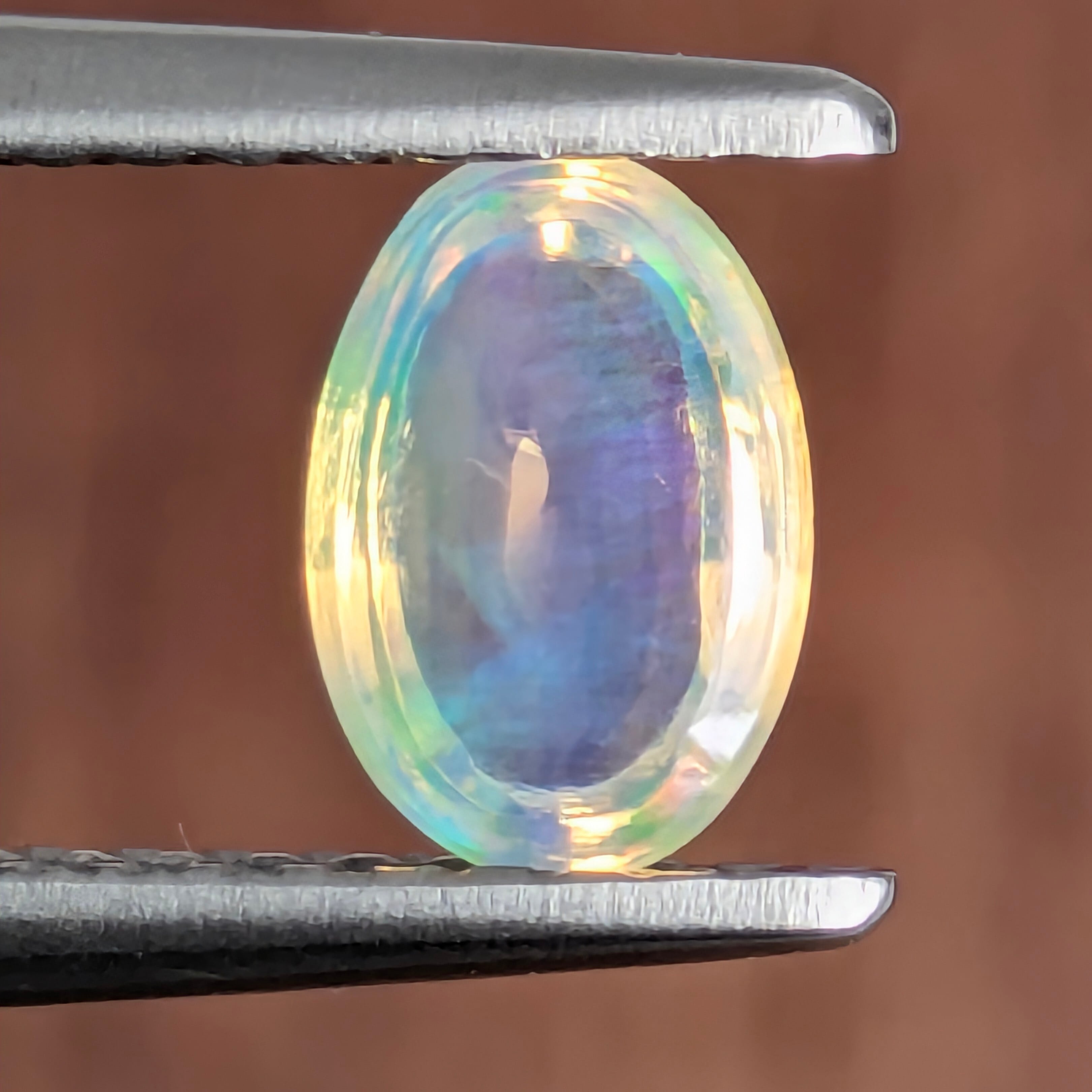 『光のかくれんぼ』・・・私たちが普段目にしている【光】というものは、一見無色のように見えますが実は【赤・橙・黄・緑・青・藍・紫】の7色の混合体だということをご存知でしょうか?普段はその色とりどりの姿は影を潜め、なかなか気づけません。それが稀に南極のオーロラや雨上がりの虹のように、空にかけられたた大きな網に捉えられたそれぞれの色の光たちが、私たちに奇跡のような美しい姿を見せるのです。それがいつでも楽しめる宝石が、この【オパール】であると言えます。