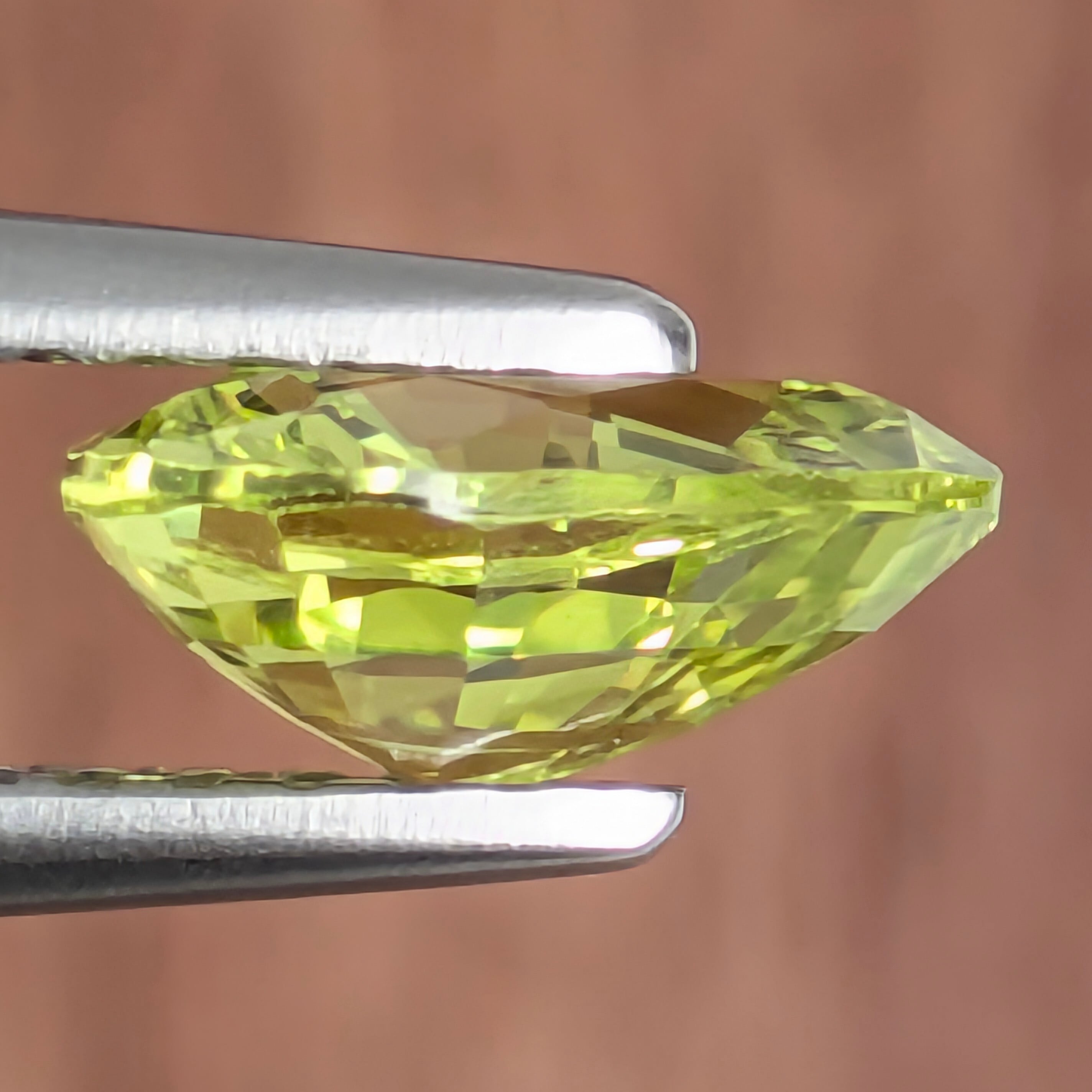 目の覚めるような蛍光カラー、通称「パロットカラー」と呼ばれる、独特の明るさを持ったイエローグリーンのクリソベリル。語源は鳥のオウムから来ています。微弱ですが蛍光性も認められます。見ているだけで元気になる!そんなパワーとエネルギーを持った1ピースです。