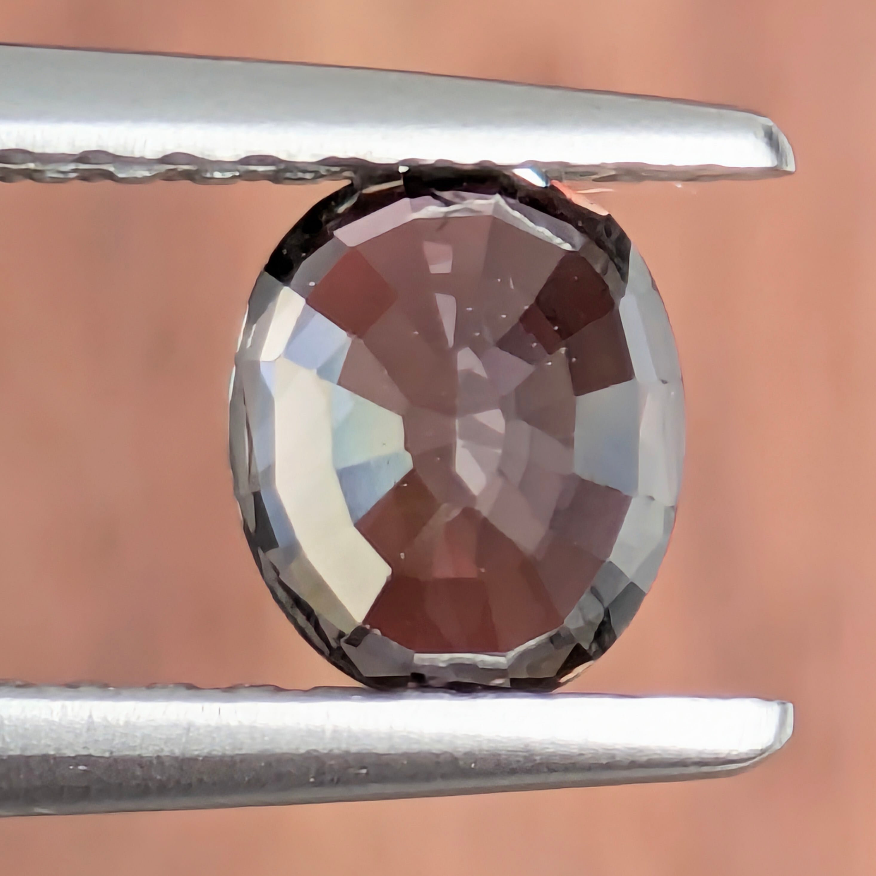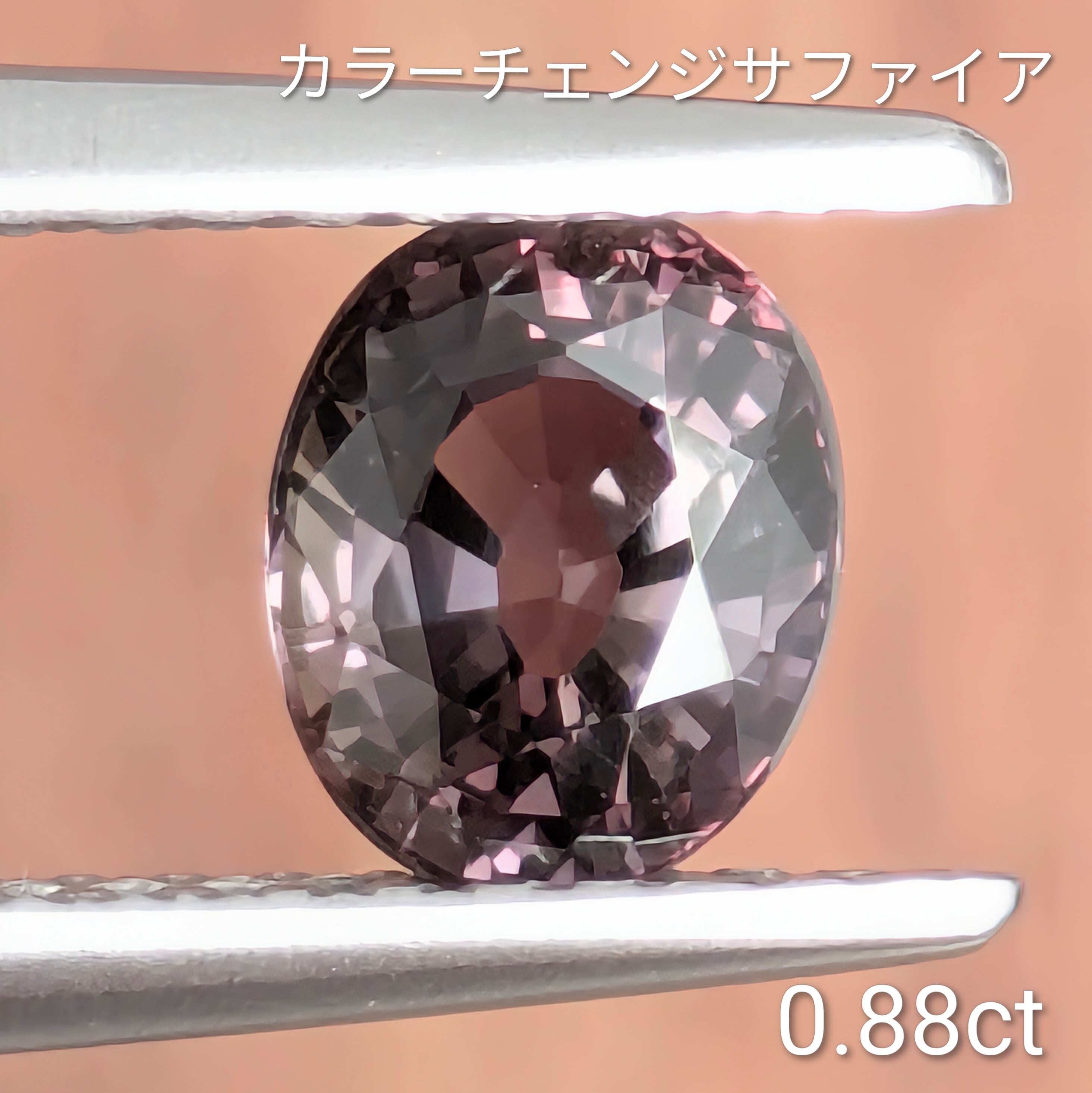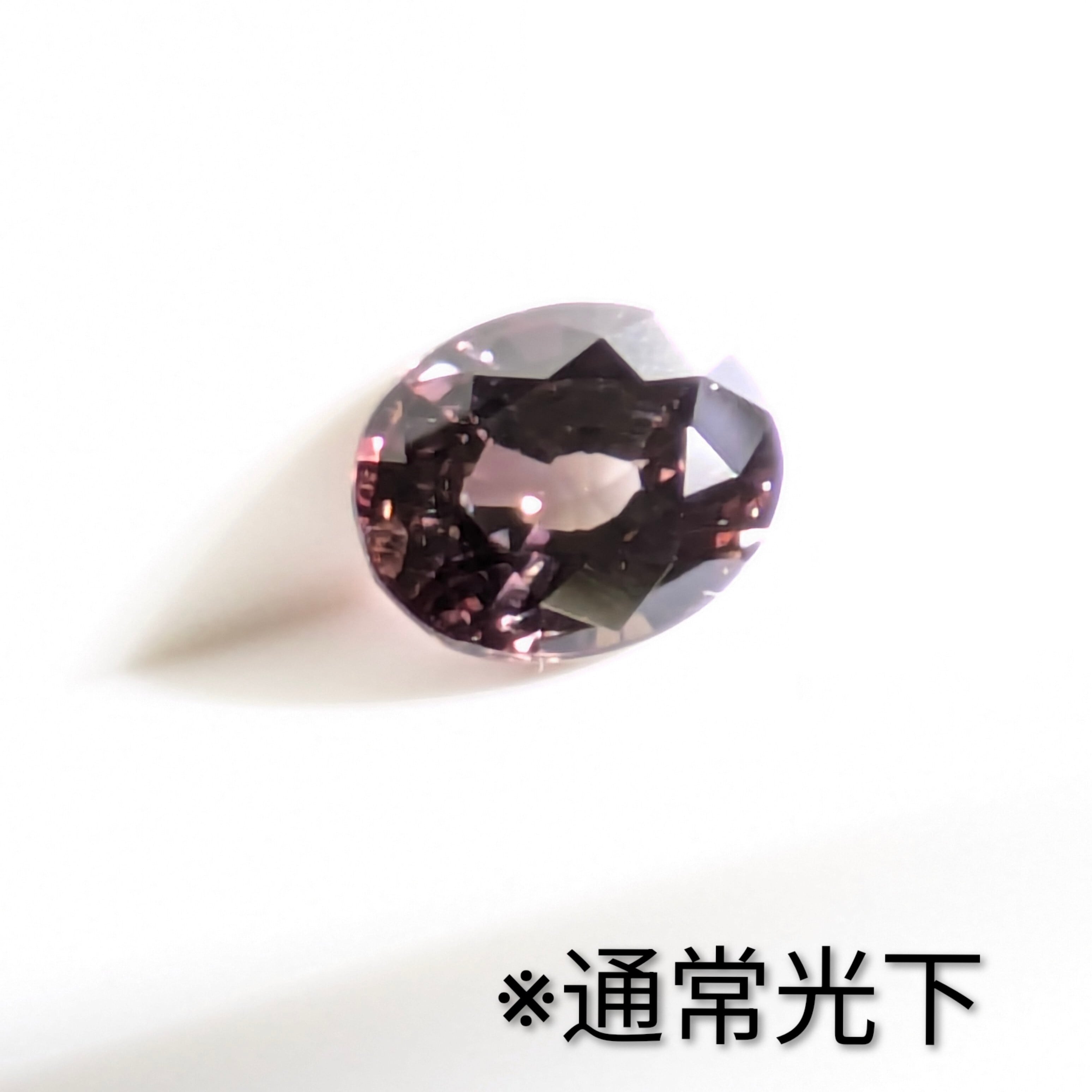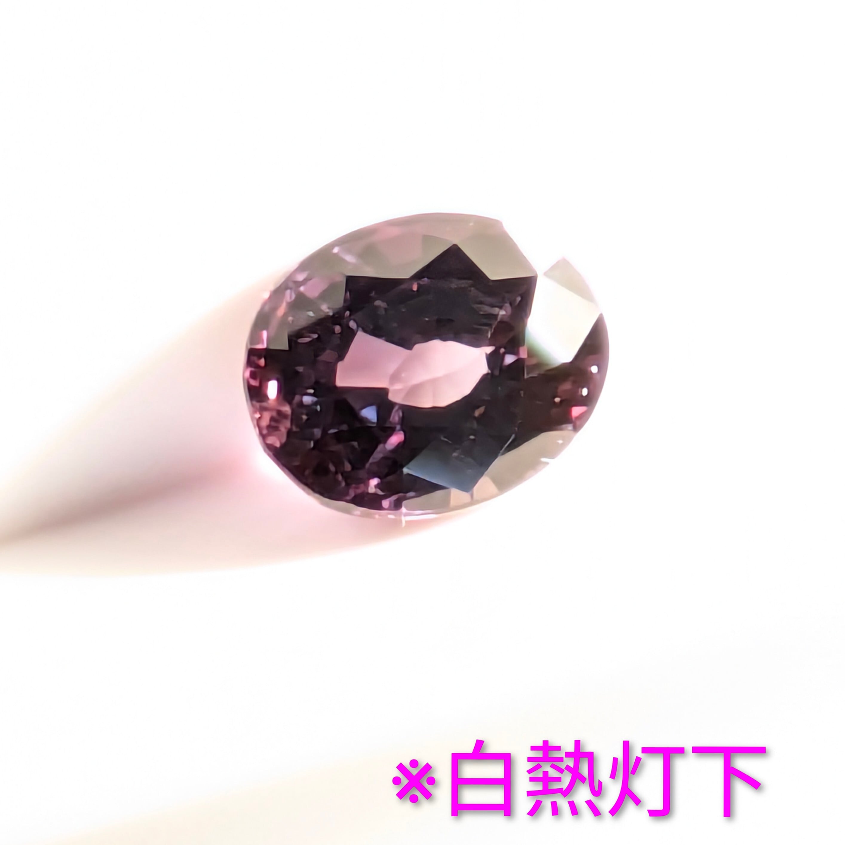 当店の社長のキメ台詞「心で感じてほしい」をこれにも適用したい1ピース。かなり通常光の下でも紫味は濃いのですが、白熱灯に変えるとより赤紫色味が強くなる「カラーチェンジ・サファイア」です。中世の時代とは違い、現代の光源は蛍光灯やLEDなど、その光の波長も様々。光に含まれる色の成分で見た目が変化するカラーチェンジの宝石からすると、まるで万華鏡のようにくるくると見た印象が変わる、面白い時代かもしれません。