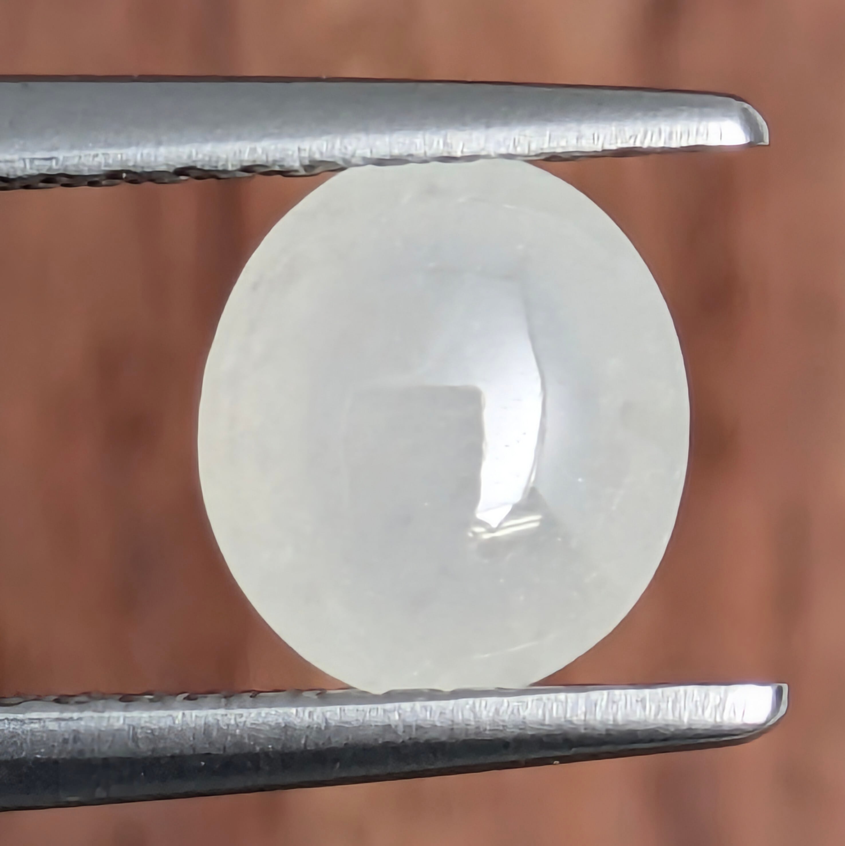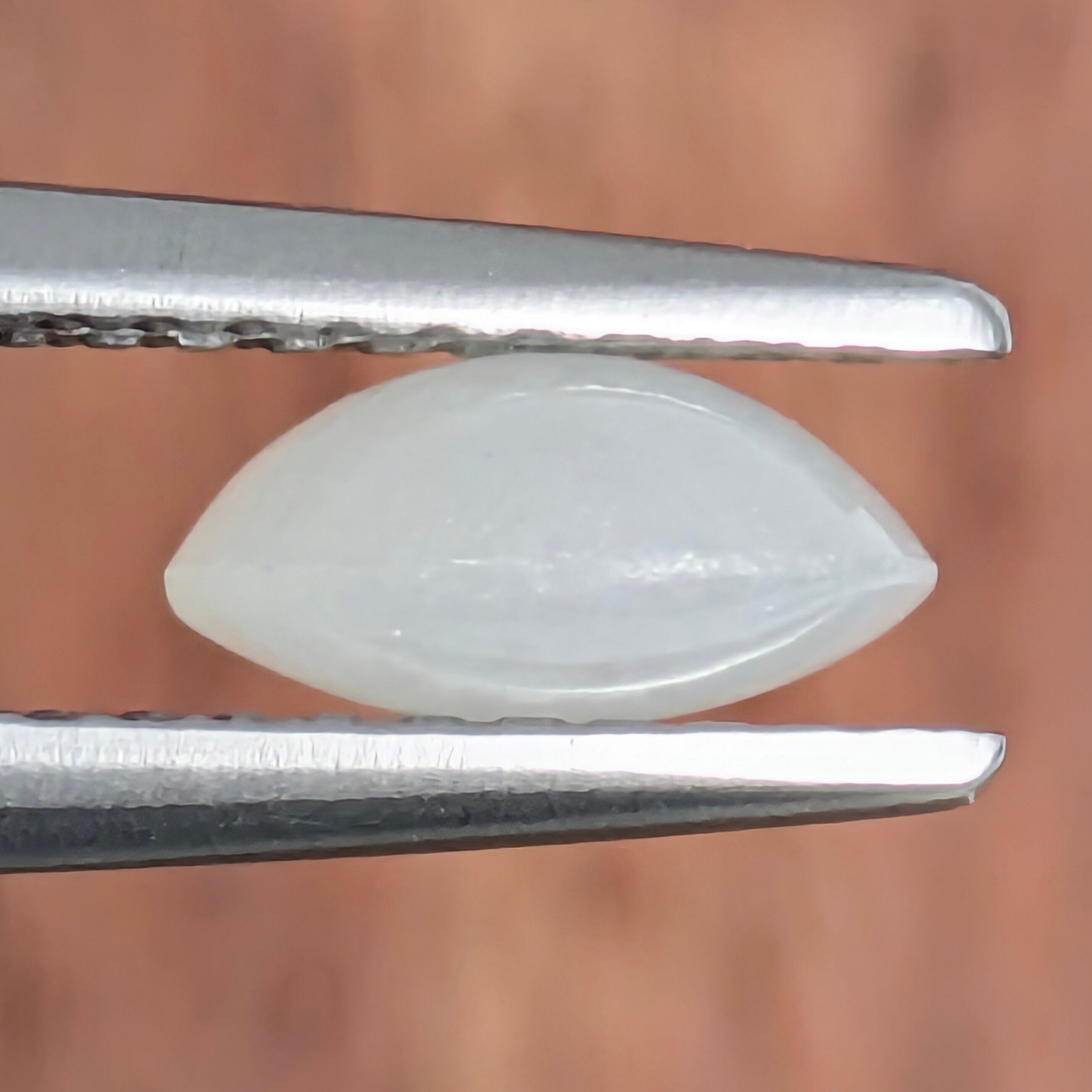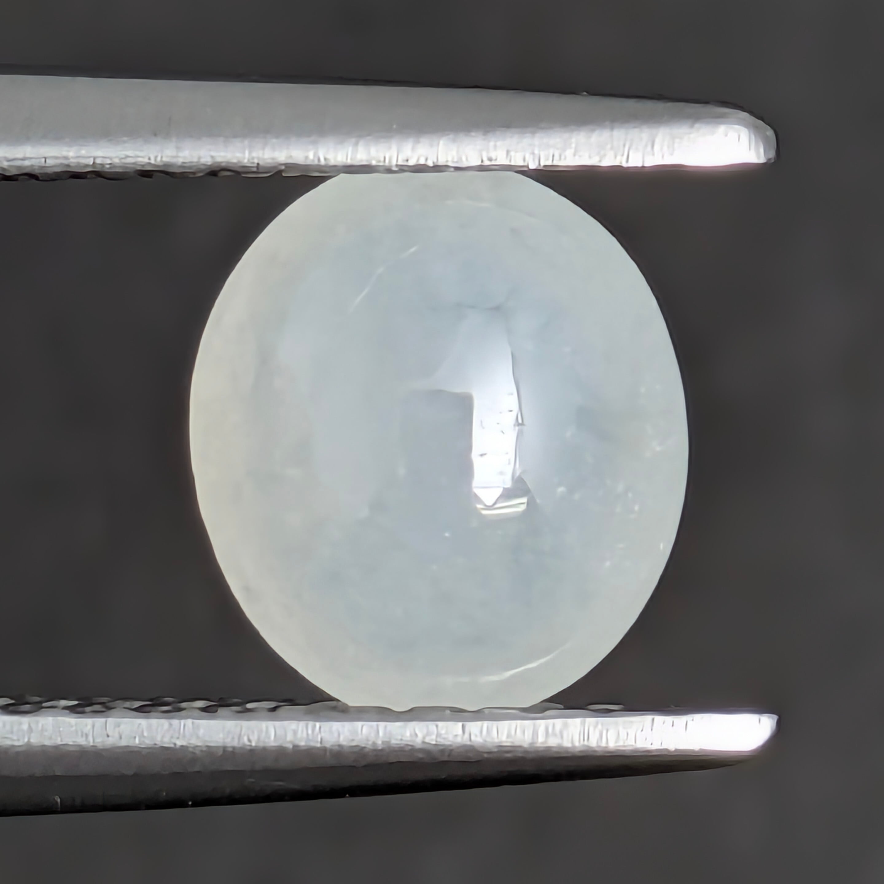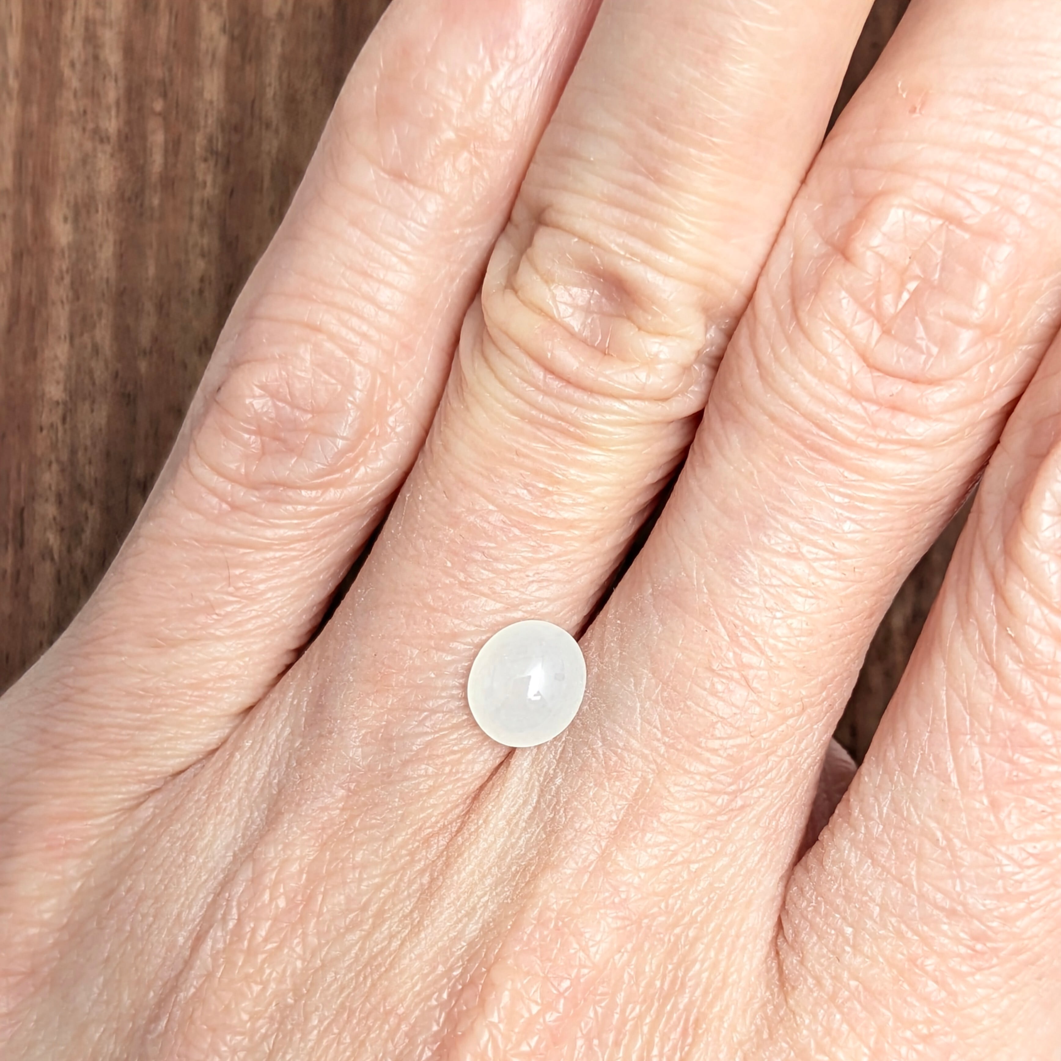 動画や横からの写真でもお分かりいただける通り、ダブルカボションのアイスジェイダイトです。初雪がそのまま宝石になったような、美しい乳白色と艶感に目を奪われる1粒。動画で伝わっているかわからないのですが、ジェイダイトはとても小さな結晶の集合体なので、その微小な結晶の間隙から反射しているようなキラキラとした煌めきも魅力の一つ。純粋無垢な、瑞々しい美しさに心を持っていかれる1ピースです。