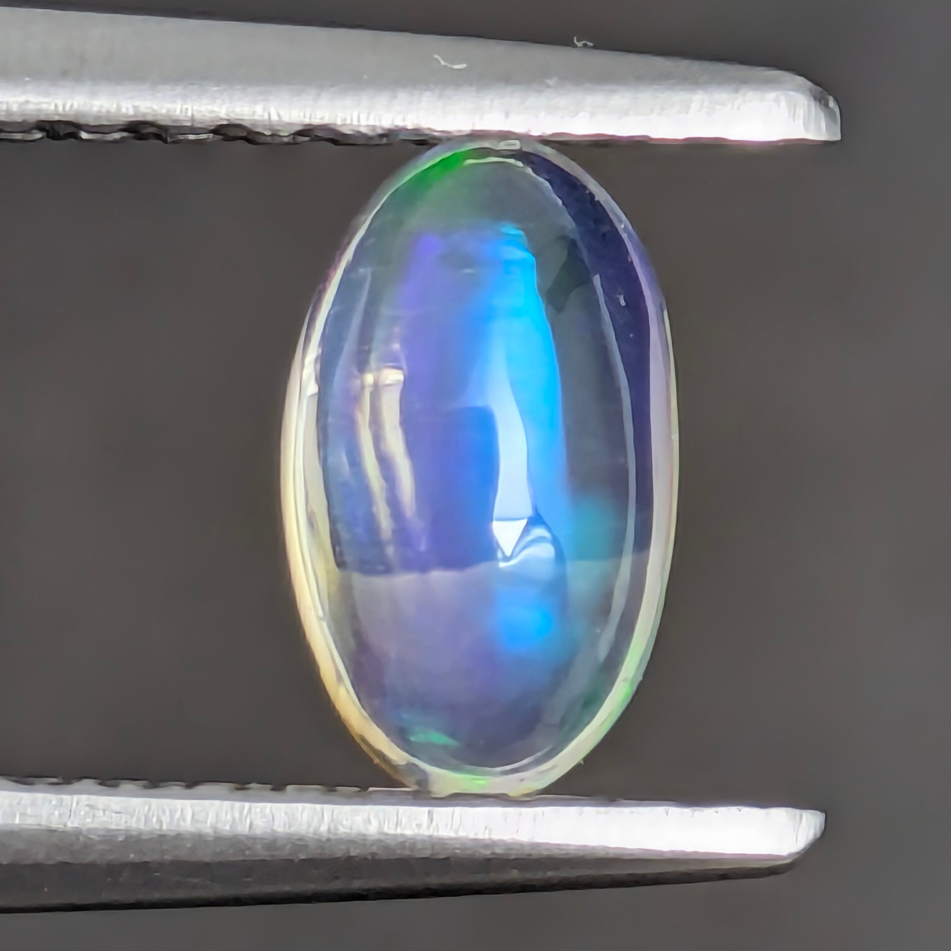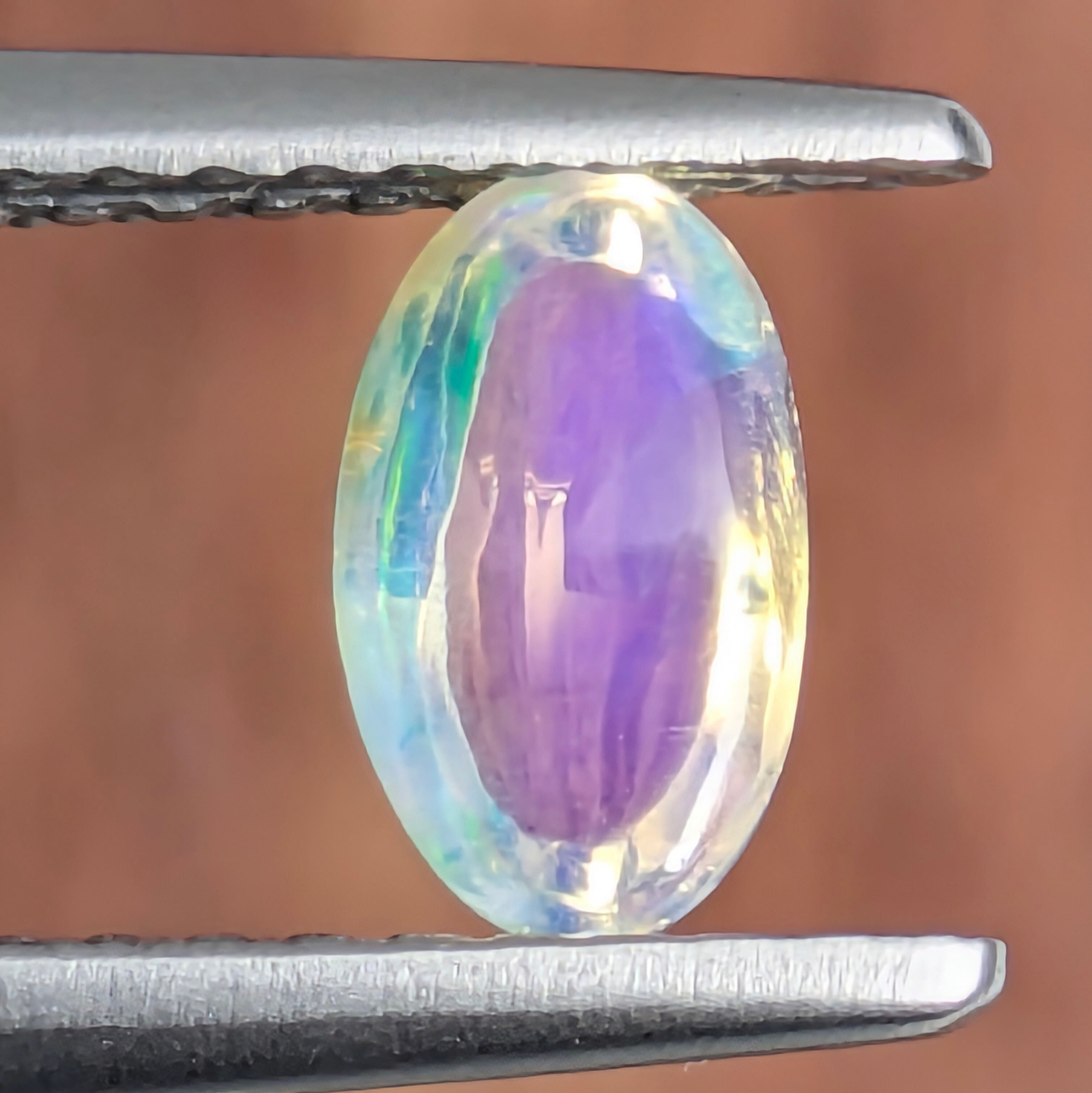 子供のころは、何が楽しかったのか雨上がりの水たまりに長靴で入っては、パチャパチャとよく遊んだものです。皆さんも、一度はそんな経験(もしくは光景)をしたことがあるのではないでしょうか?今回ご紹介のこのウォーターオパールは、そんな世界を洗い流した自然のシャワーの名残(水たまり)に映った、美しい青空と瑞々しい植物の緑の残像が揺らめく一粒。でも実は、画像だとわかりにくいのですがパープルの色味も良く見えるオパールです。
