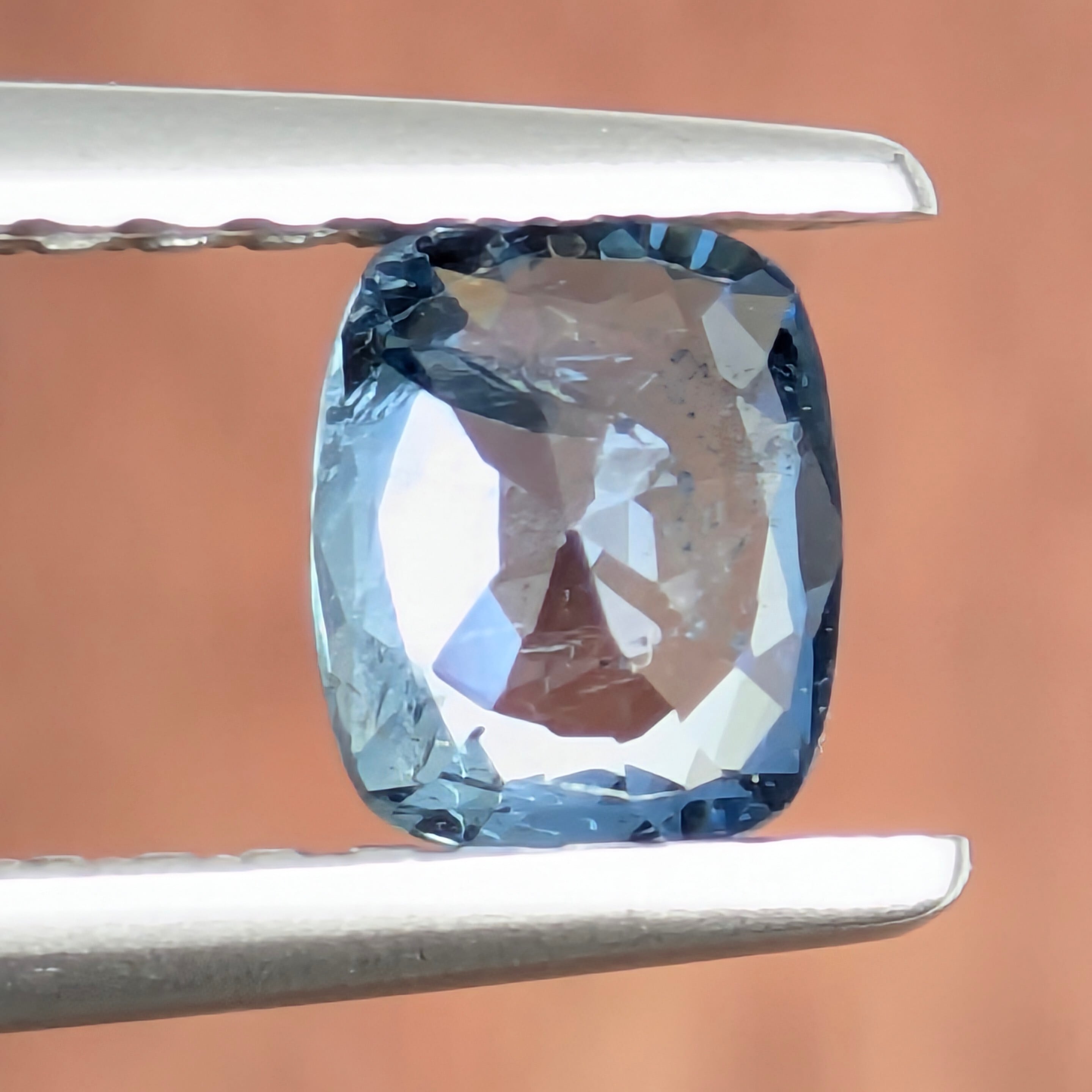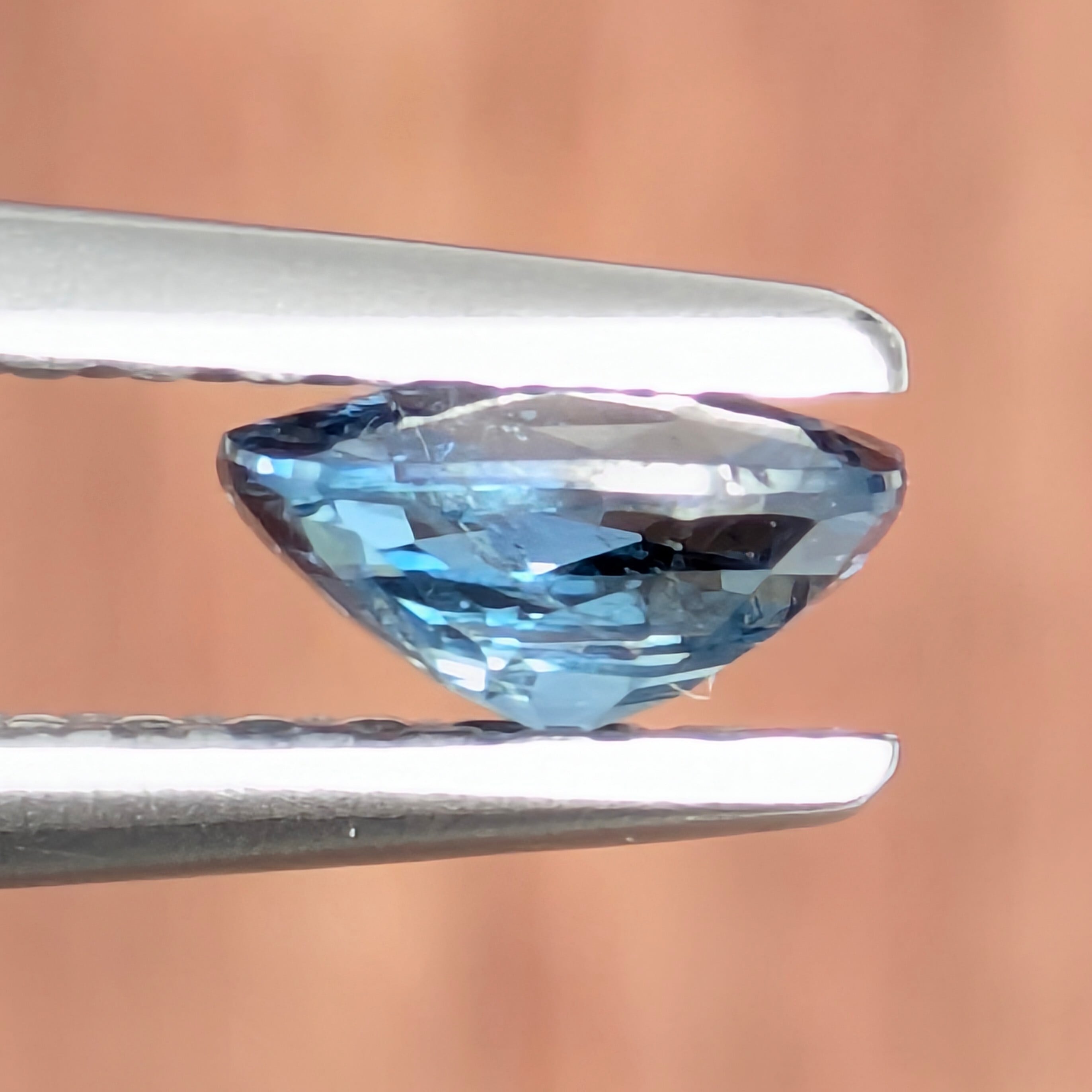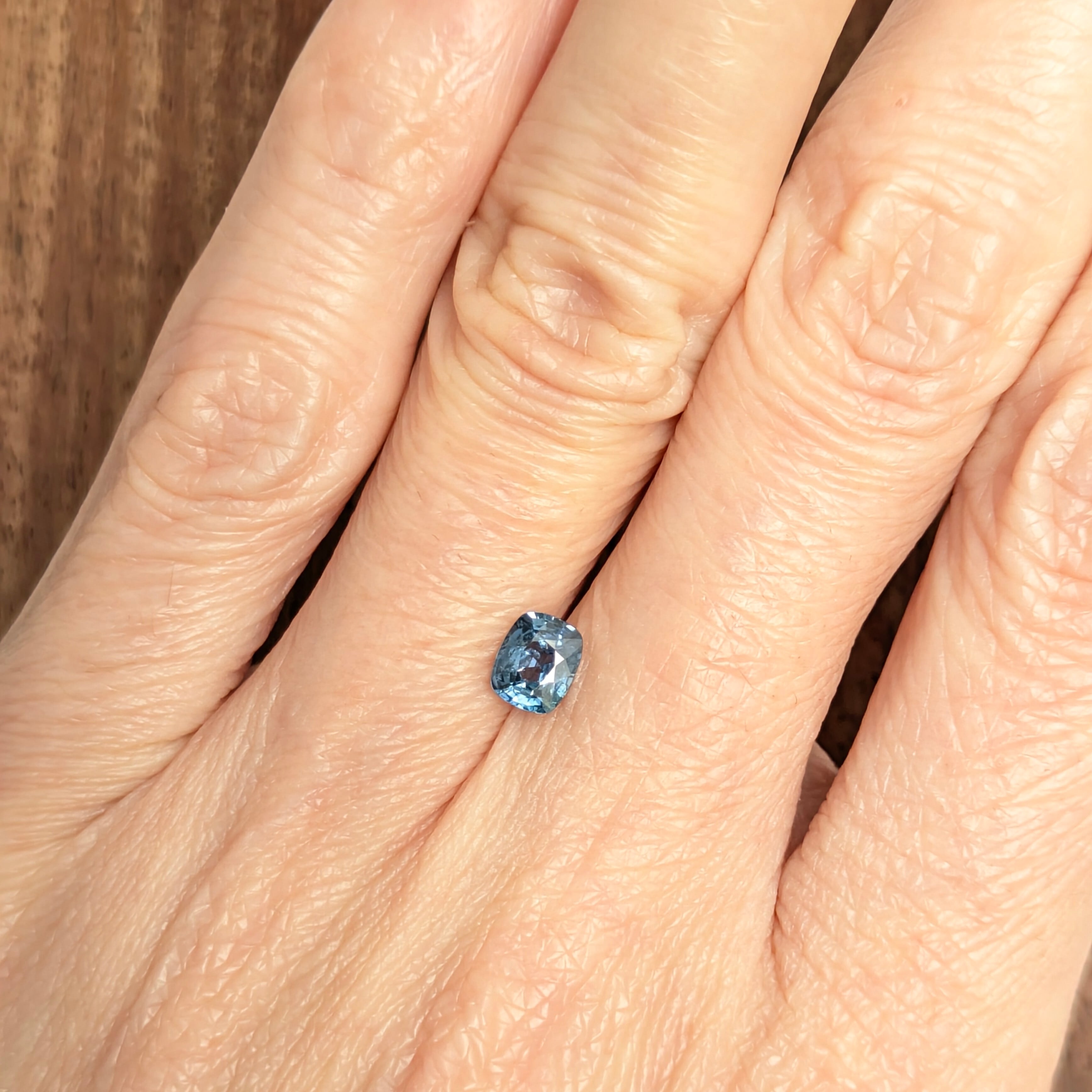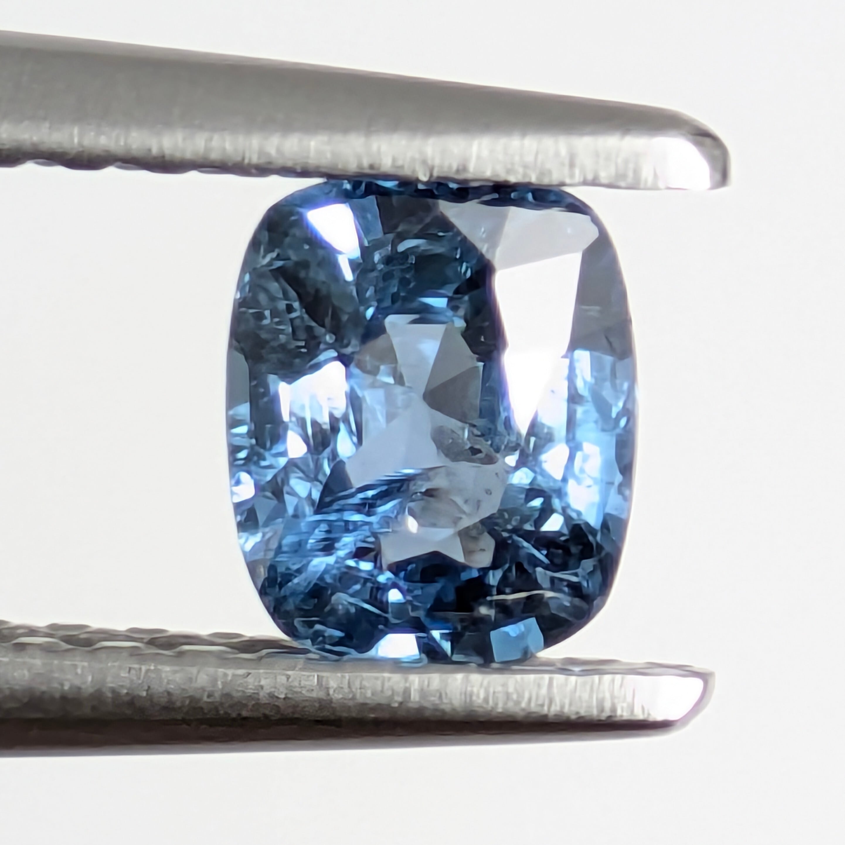 この絶妙な色感が、画像や動画で伝わるでしょうか?カラーは【グリーニッシュブルー】、わずかにグリーン味をかんだブルーのサファイアです。でもそれは、よく例えられる空や海の【青】ではありません。複雑で奥行きのあるこのブルーは、『太古の海』とも例えるべく、芳醇な生命の卵を湛えた青のように感じます。ひとたびルーペで内部を覗けば、そこに存在している大小さまざまな結晶や液体インクルージョンから「コポコポ・・・」と生命の誕生の音が聴こえてきそう。『始まり』を感じる、不思議な美しいサファイアです。