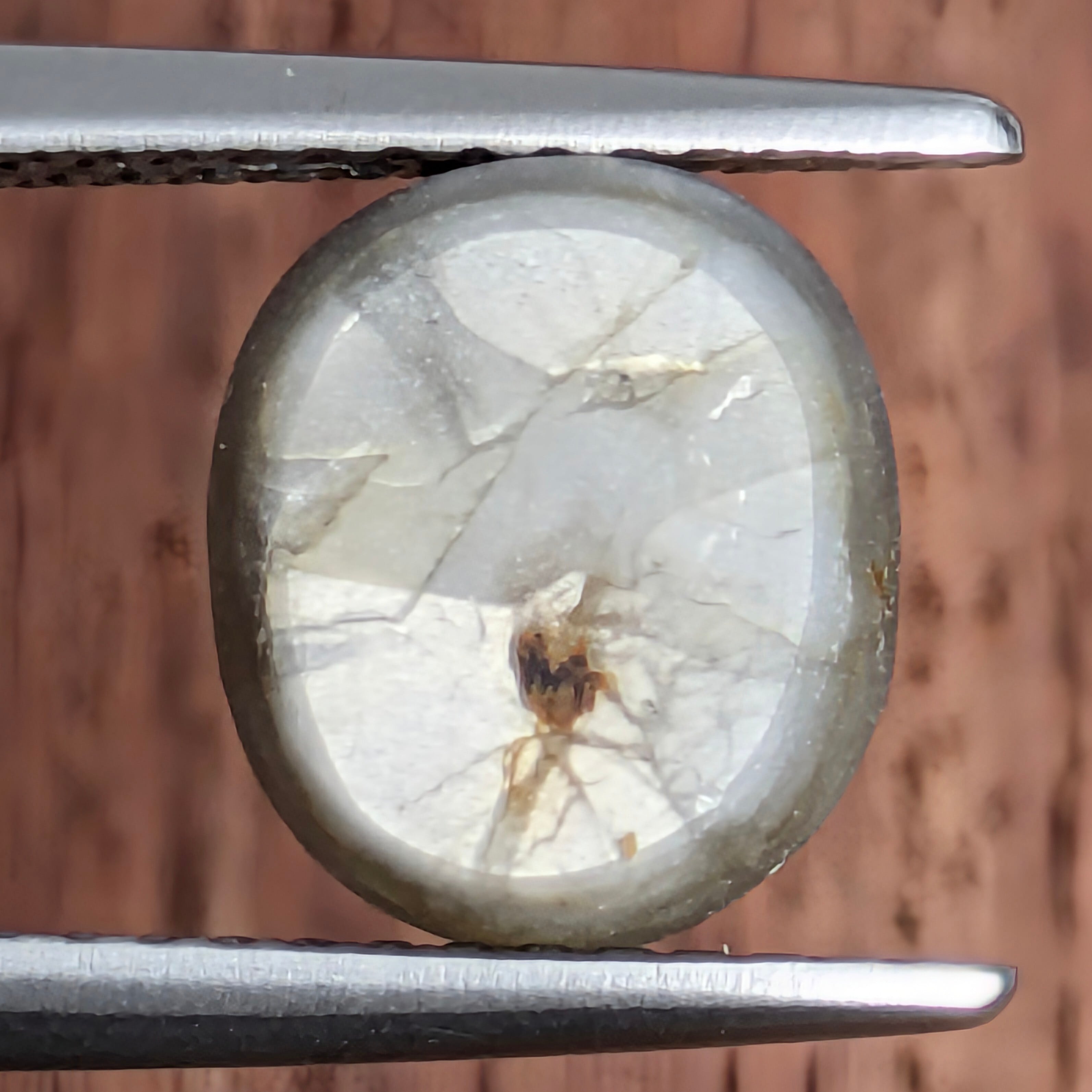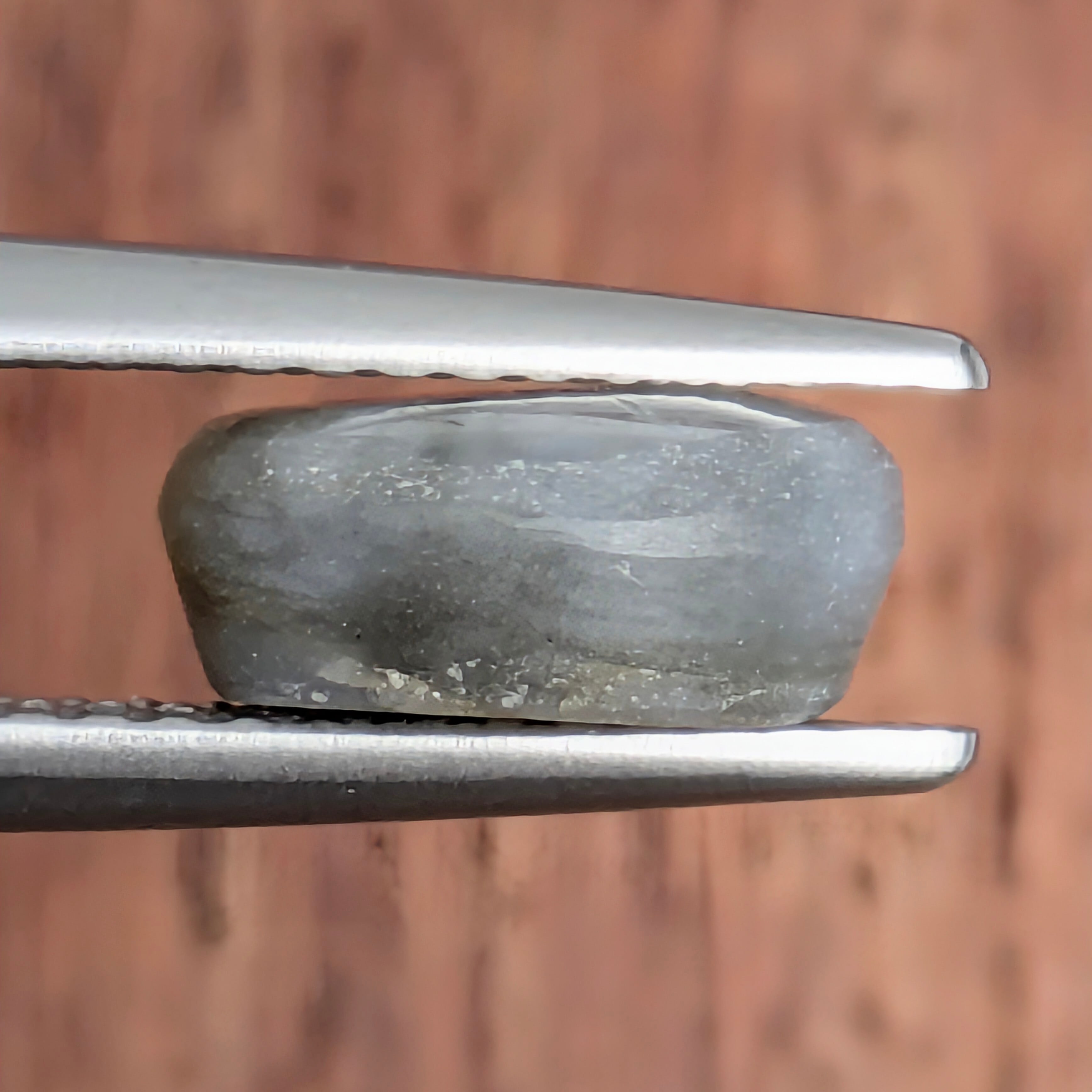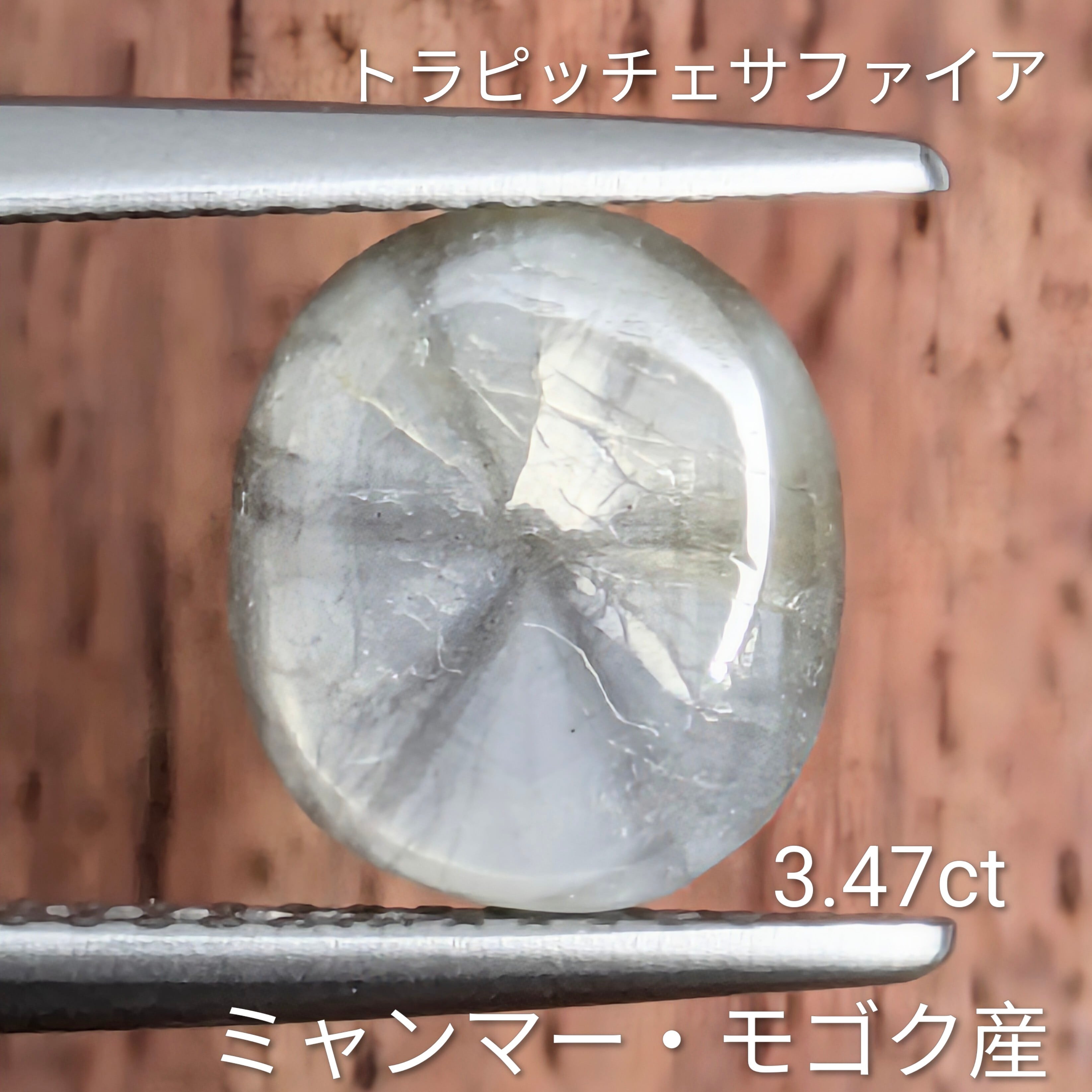 ブラックというよりは、金属光沢感満載の地石に刻まれた美しい6条の模様が印象的なトラピッチェサファイア。シルバーの艶めきがとても美しい1ピースです。この1ピースに関しては、『サトウキビの絞り機』の模様というよりは、『惑星に刻まれた流れ星の痕跡』という宇宙感満載の美しさがあると思います。独特のシルキー感と、美しい艶感のコラボレーションがとても印象的な1ピースです。
