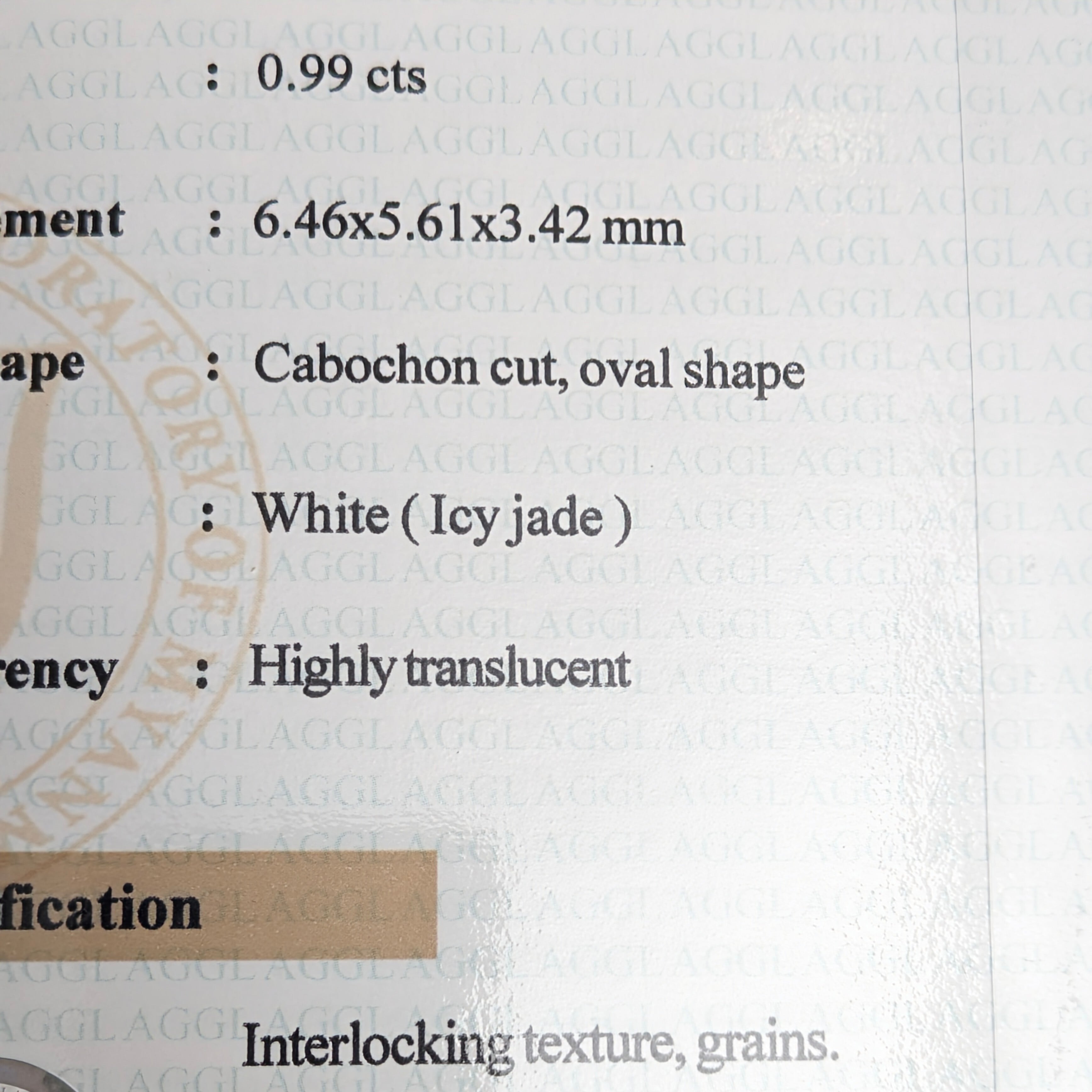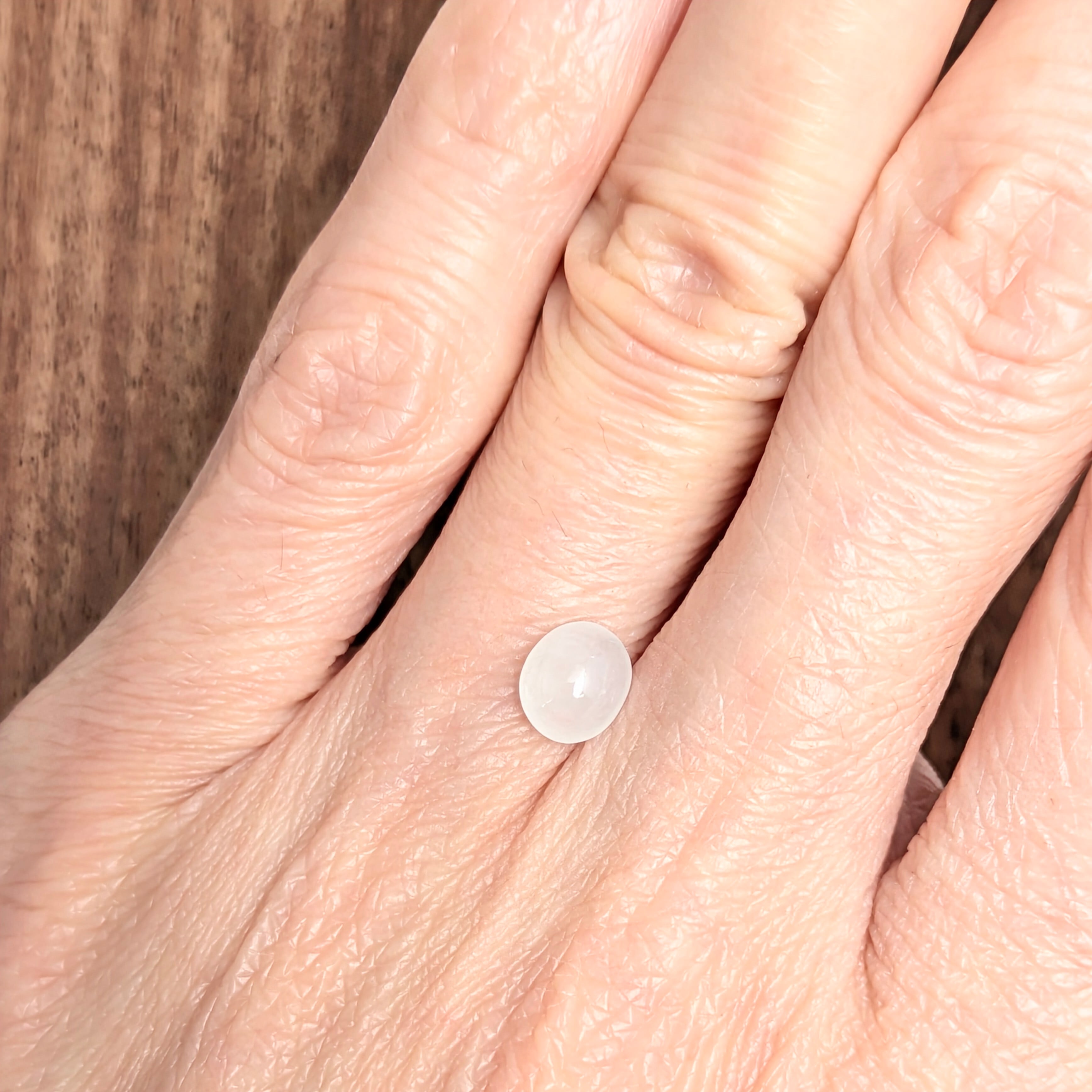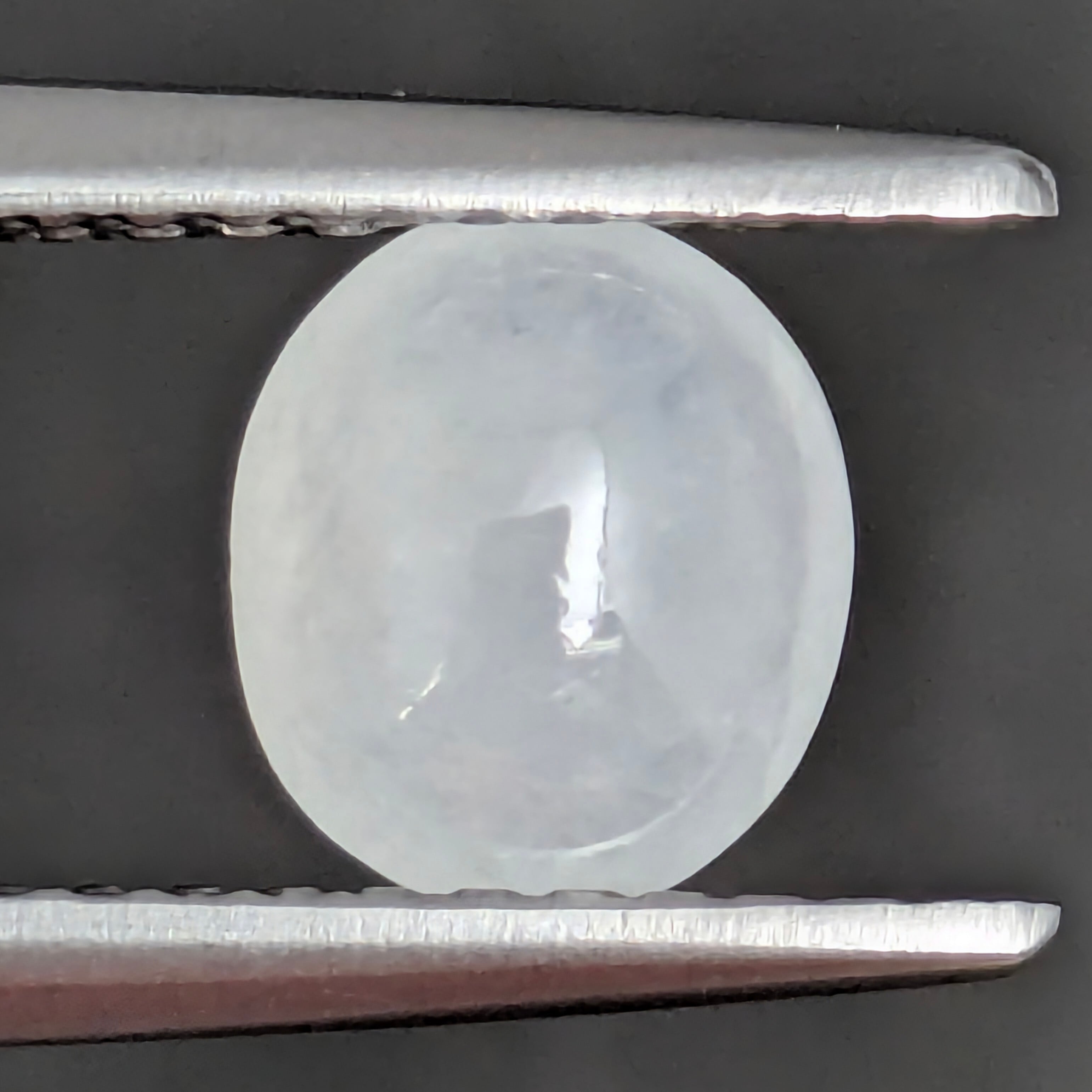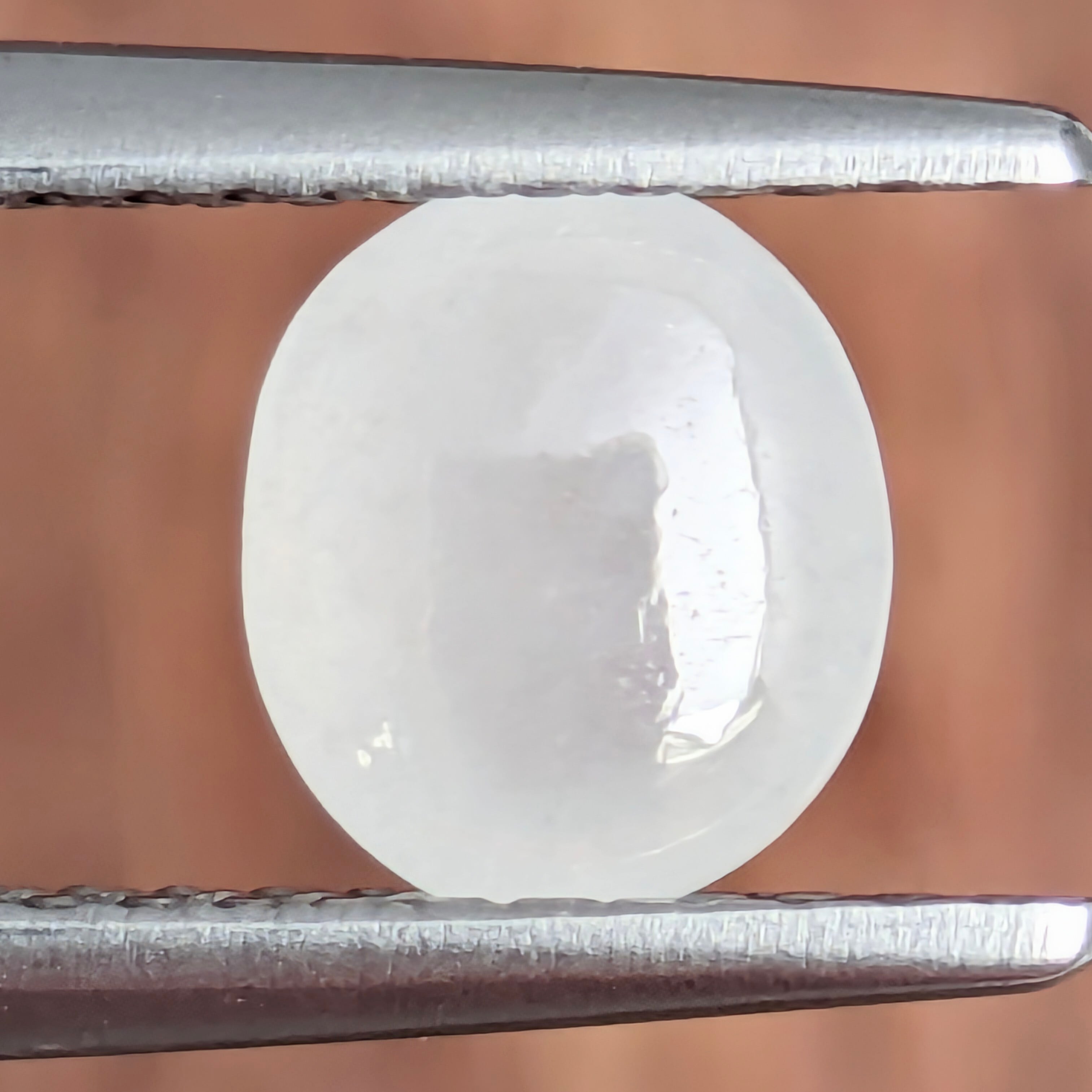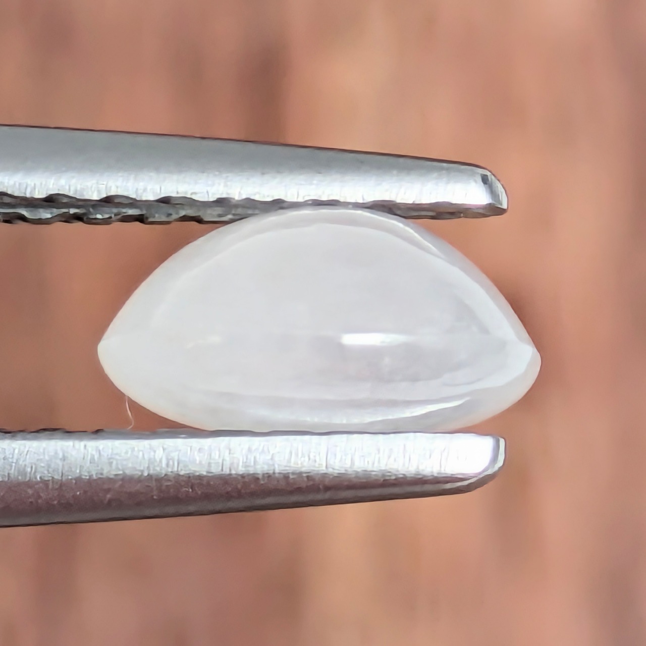裏面もわずかにふっくらコロンとしている、セミ・ダブルカボションとも言える1ピース。美しい純粋無垢な乳白色が魅力的なジェイダイトです。非常に艶やかで透明感もあるその様子は、シロツメクサの花びらに朝霧の水滴がポツリと吸い込まれ、溜まりに溜まった姿で今にも滴り落ちるひとしずくの反映のよう。透明感もありながら、色の『白』の美しさに注目したい1ピース。本当に艶々ぷるんの子です。