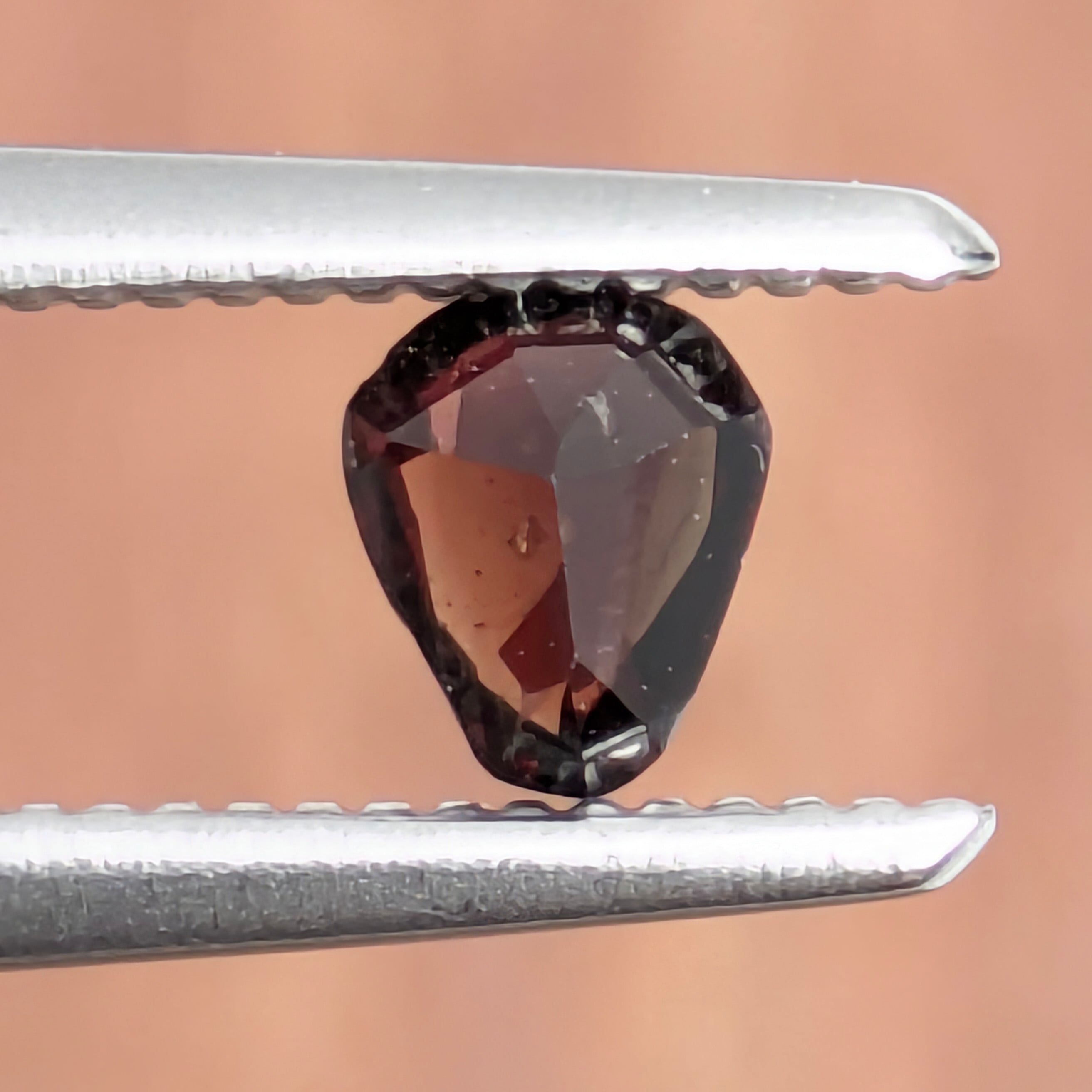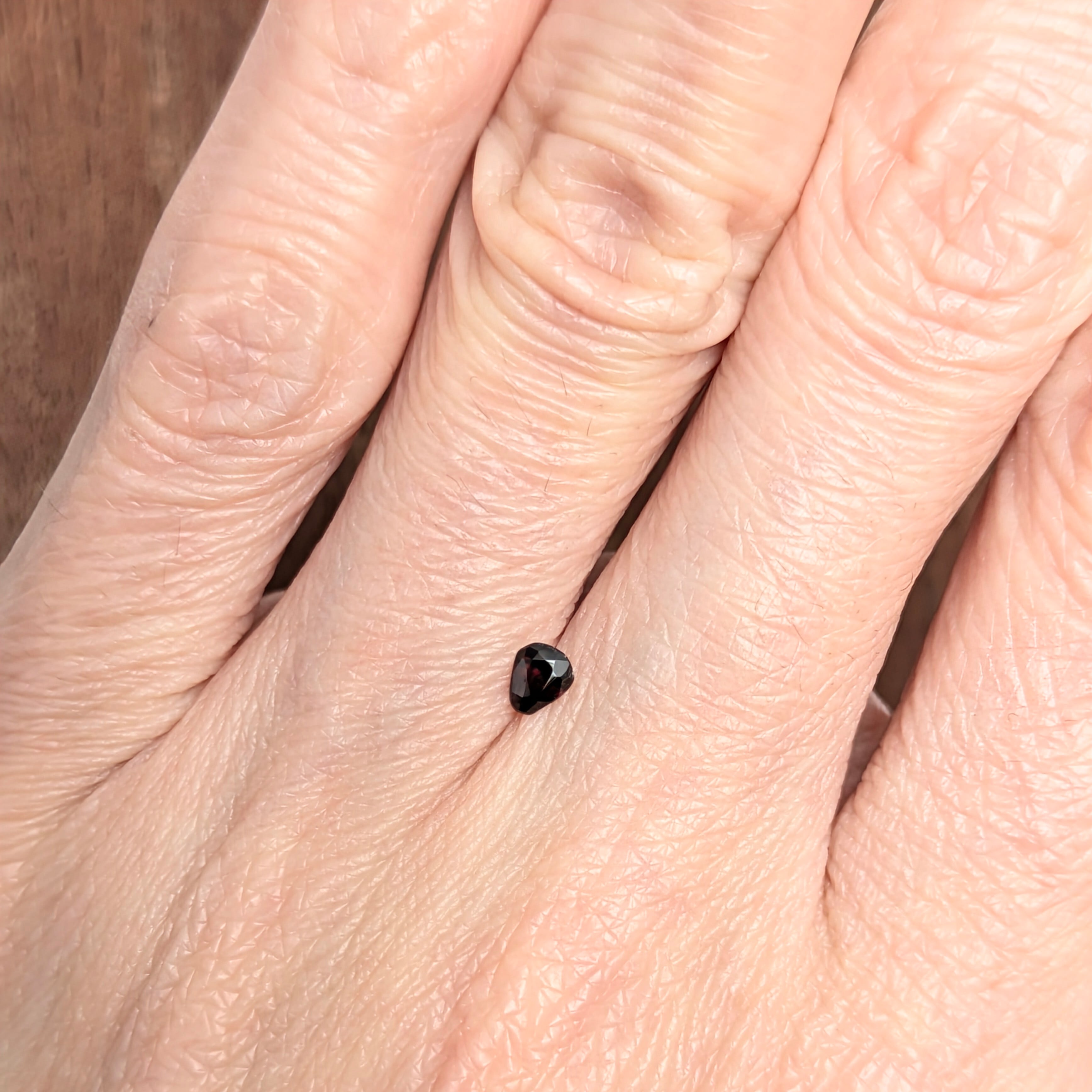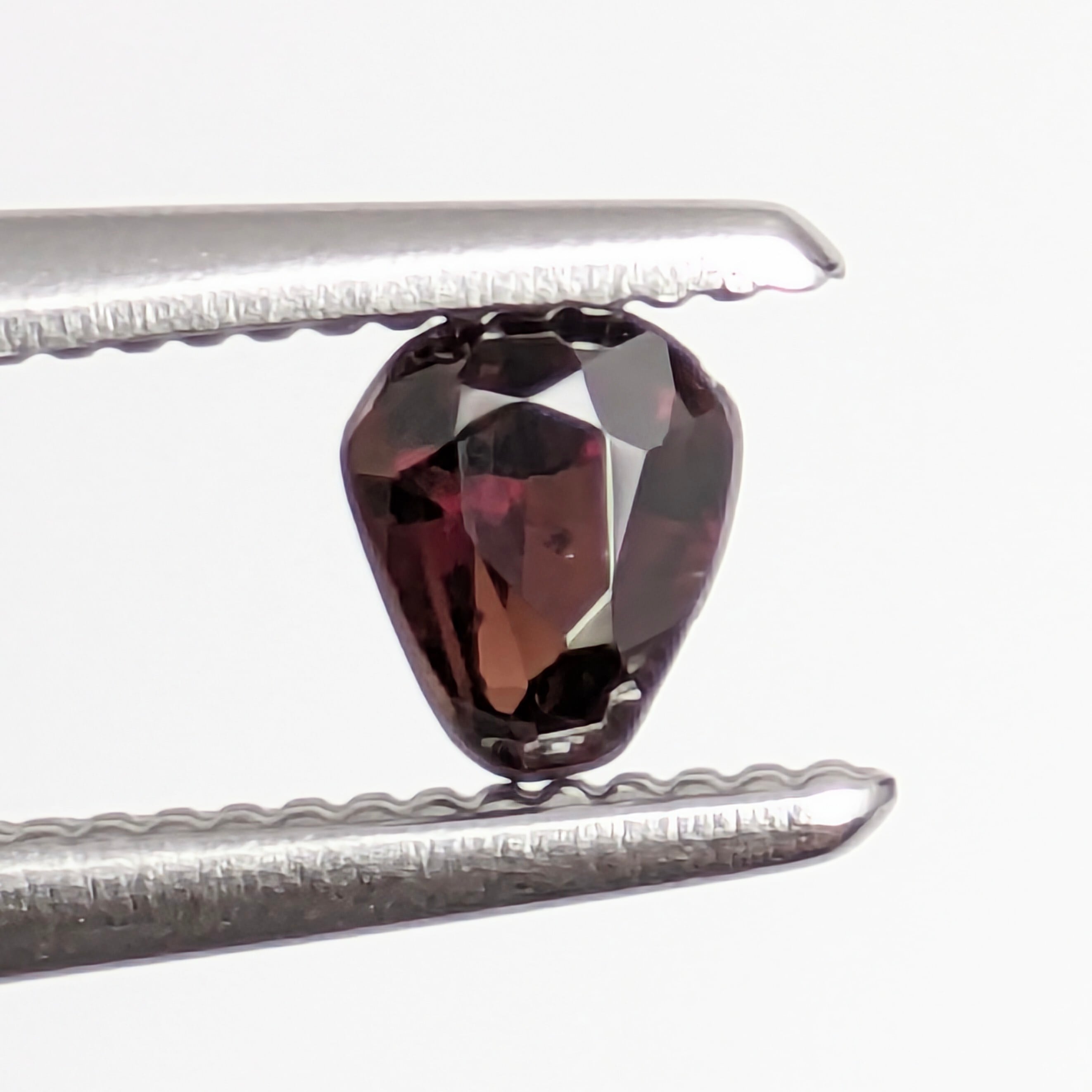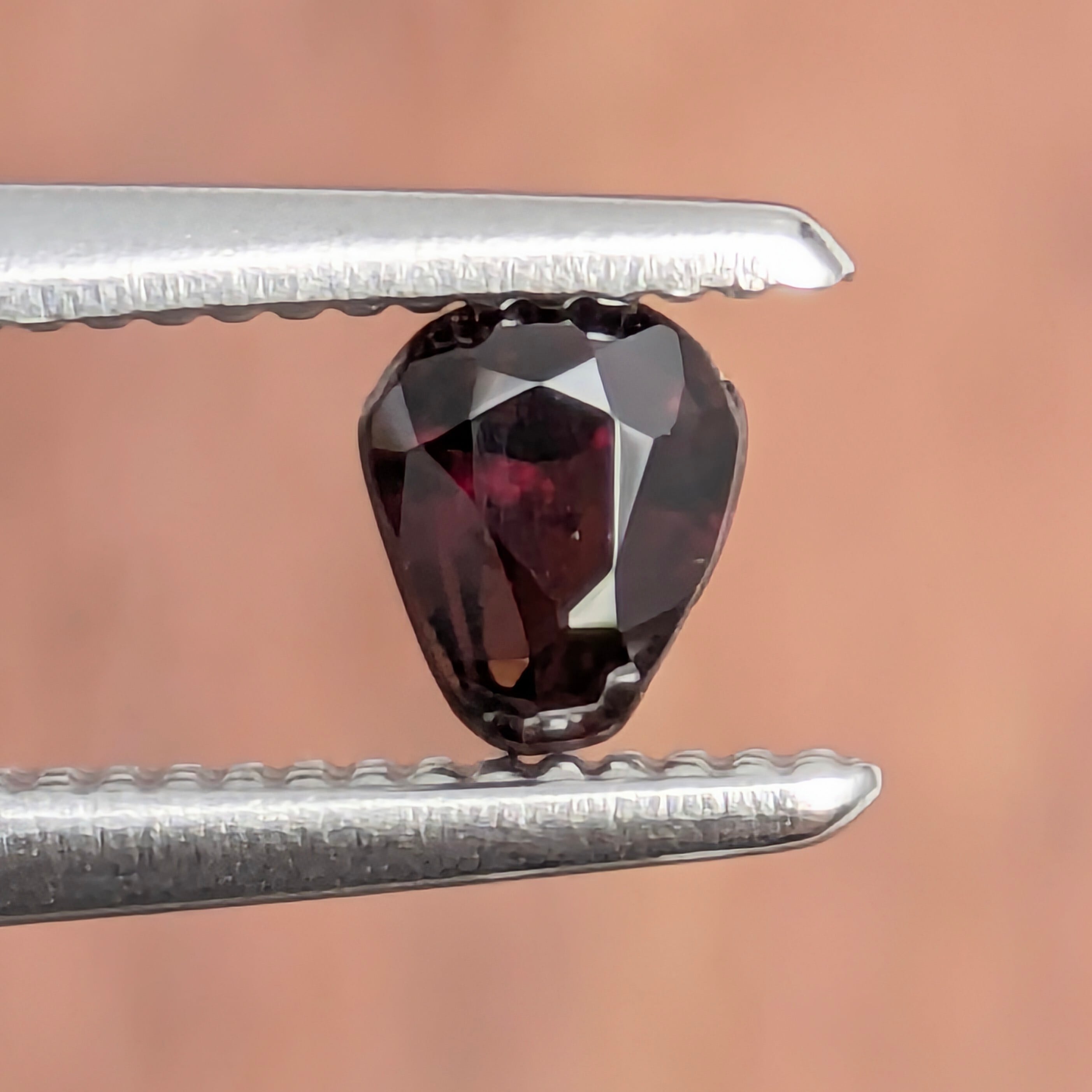 写真だと限りなく黒っぽく映って見えていると思いますが、意外と肉眼での方が深く濃い赤色味を感じられる1粒。ペイナイト自体もミャンマーでしか採れないレアストーンですが、今回はそれに加えて形も個性的で魅力的です。ペアシェイプともちょっと違う、エンブレム型。ひとたびルーペで拡大してみると、光に苦労することなく、深い深い魅惑的な赤色の世界に入ることができます。非常に状態の良い、美しいペイナイトです。