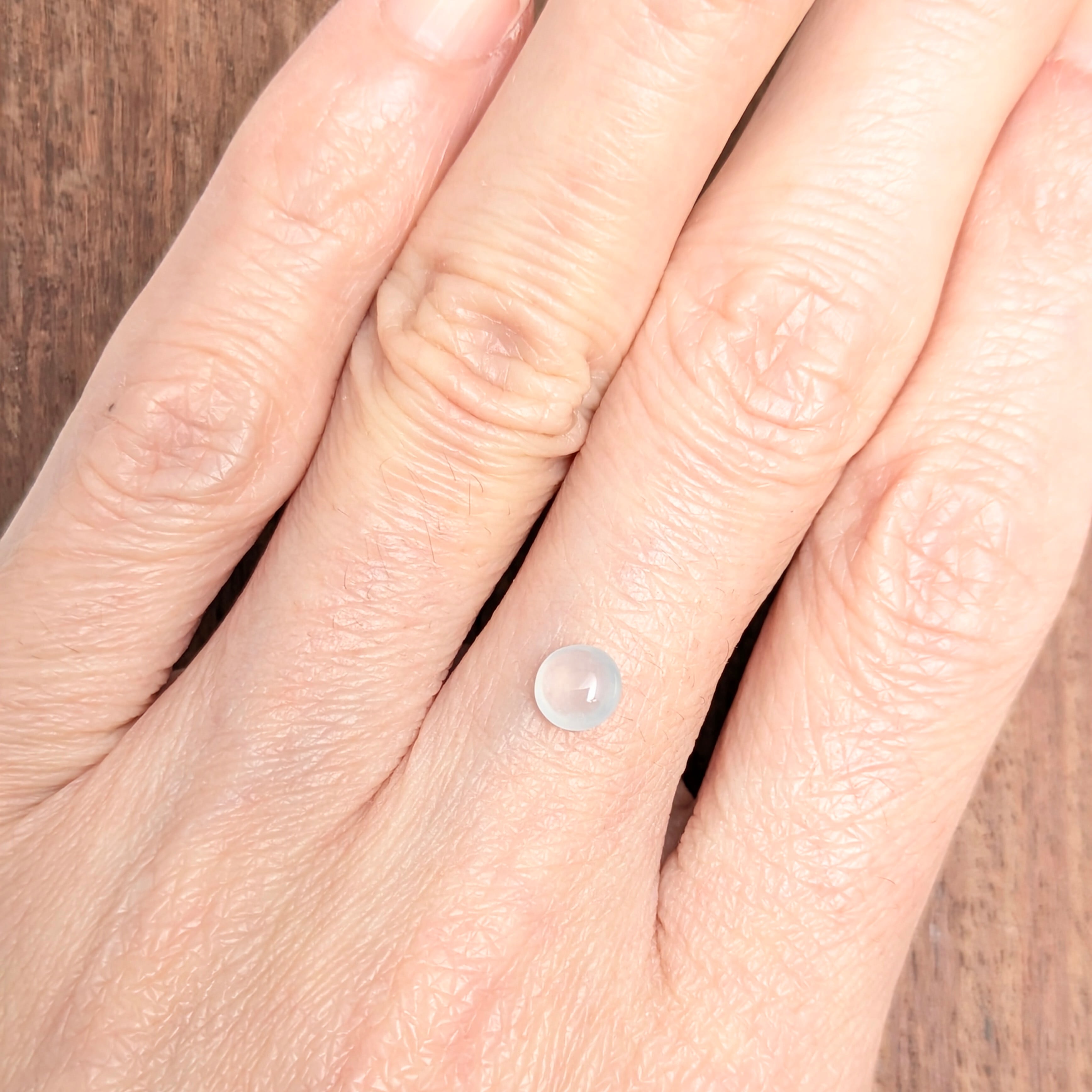 冬の寒い日に、白く漂う天使のため息をそっと宝石にしたような、柔らかなミルキー感と透明感が可愛らしい1ピース。さりげなくダブルカボションになっていながらのこの透明感は、一見の価値ありです。ジェイダイトは小さな結晶の集合体。今の技術が確立するまでは、ミカンの皮のように凸凹した表面状態のものも多くありました。今のこのプルツヤの研磨の仕上がりは、研磨技術の発展のおかげ!とても美しい1ピースです。
