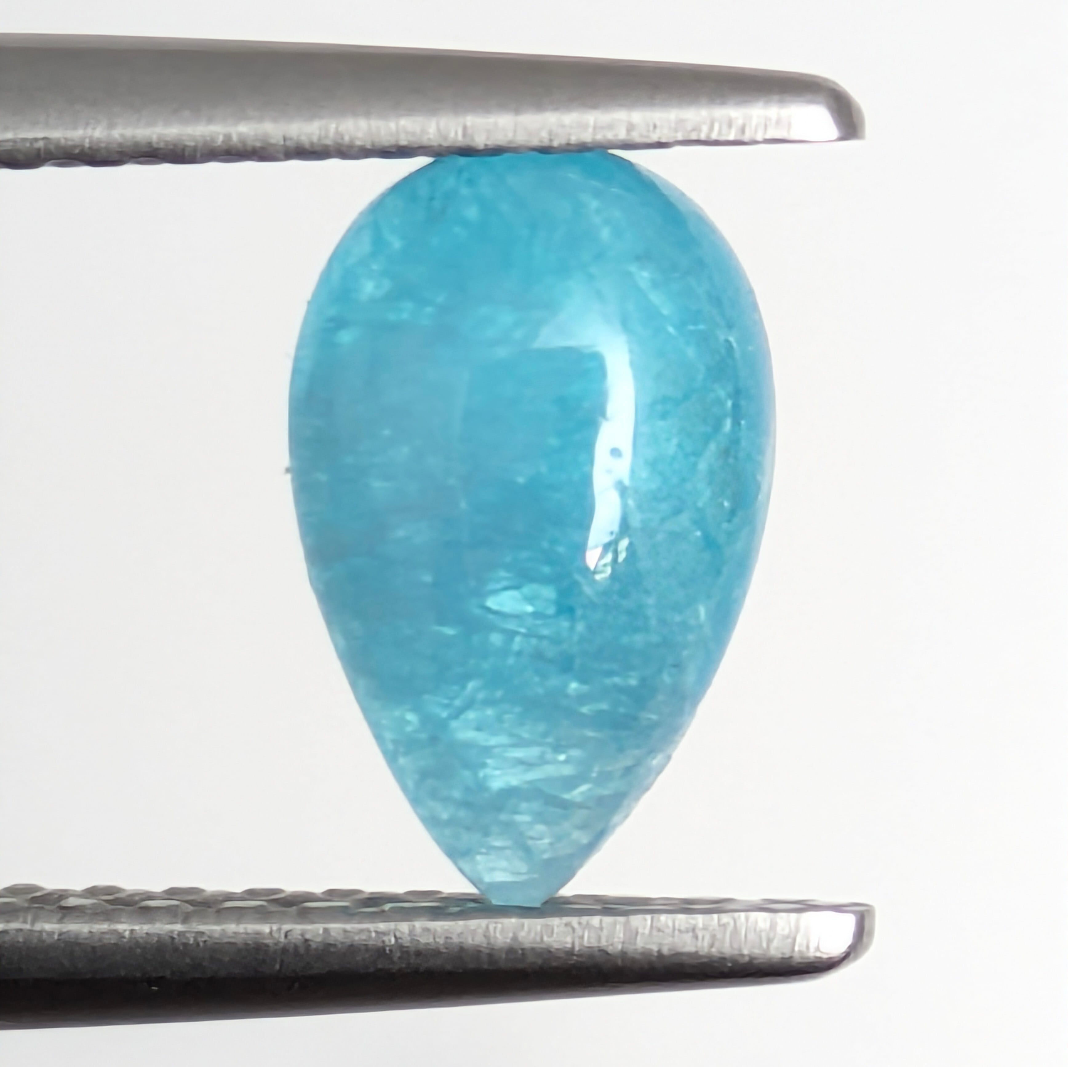 艶々の雫型のパライバトルマリン。カボションカットでのネオンブルーとこのプルプル感は、パライバトルマリンだからこその風合いかもしれません。画像よりも、実物はもう少し色は白っぽさがあります(画像加工はしていませんが・・・。)一様ではないその透明度、わずかな色ムラも、個性として楽しみたい一粒。まさに、まるで入道雲がモクモクと輝くあの夏の日を思い出させるような、懐かしくフレッシュな美しさです。