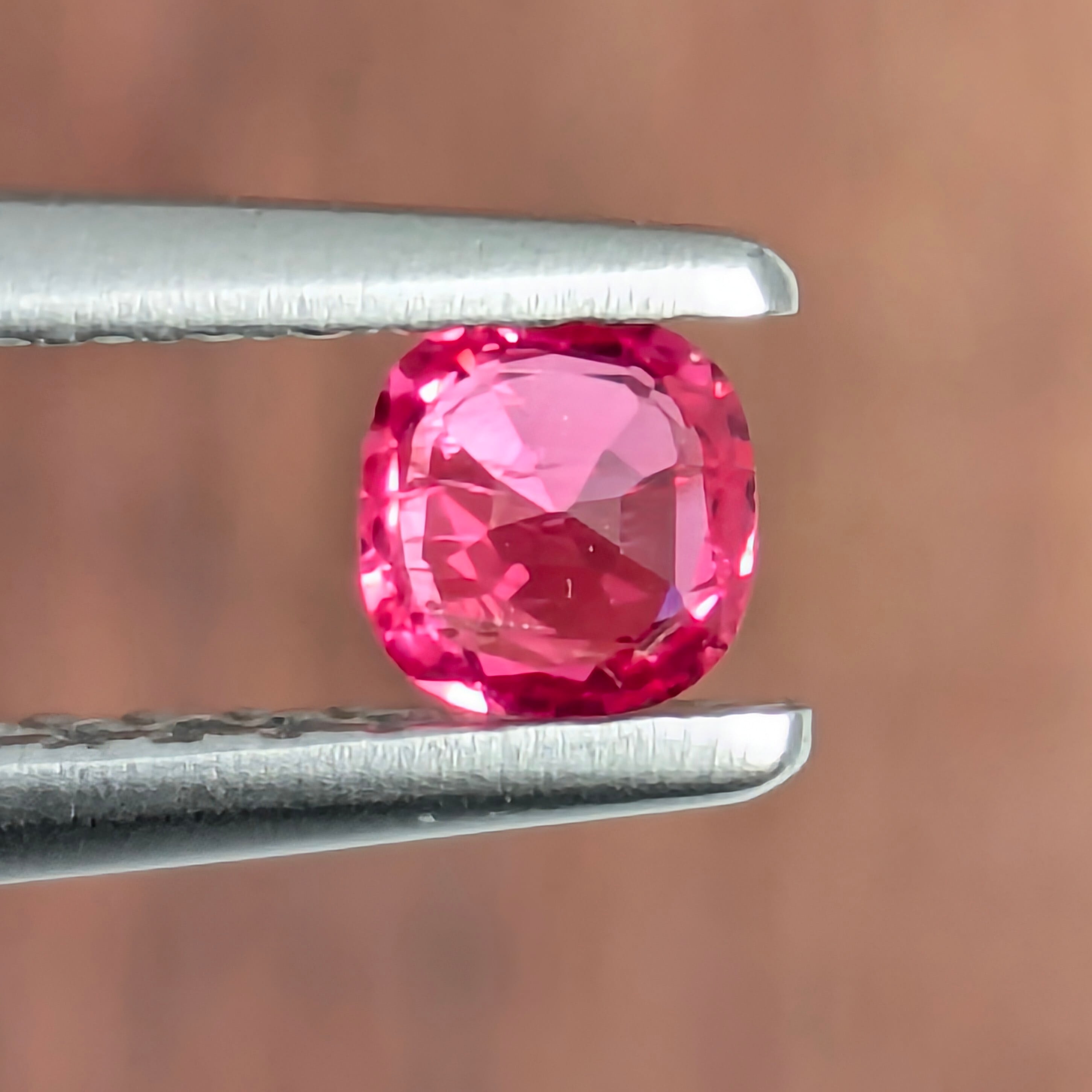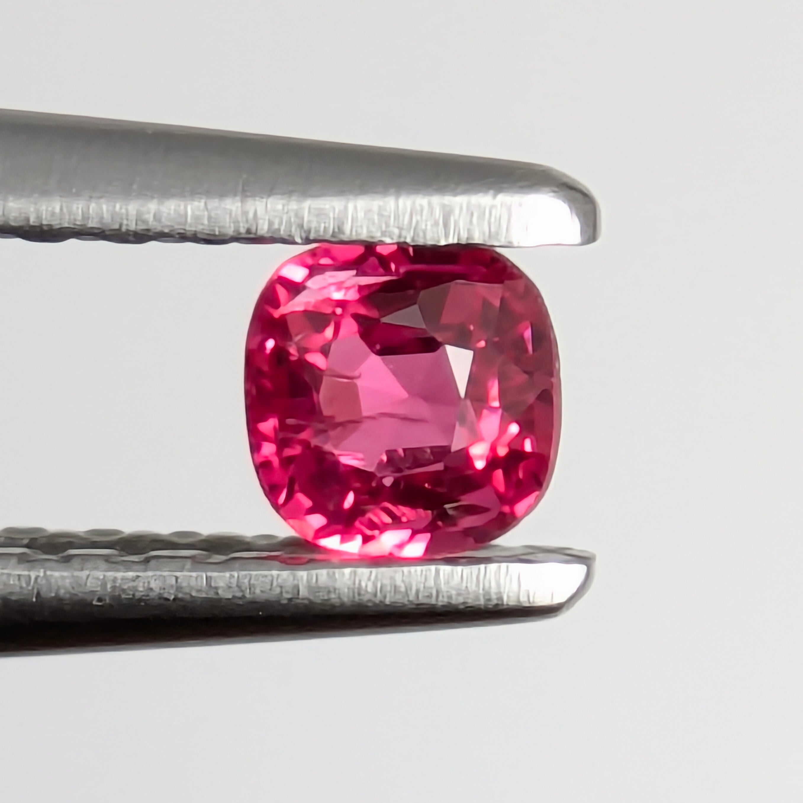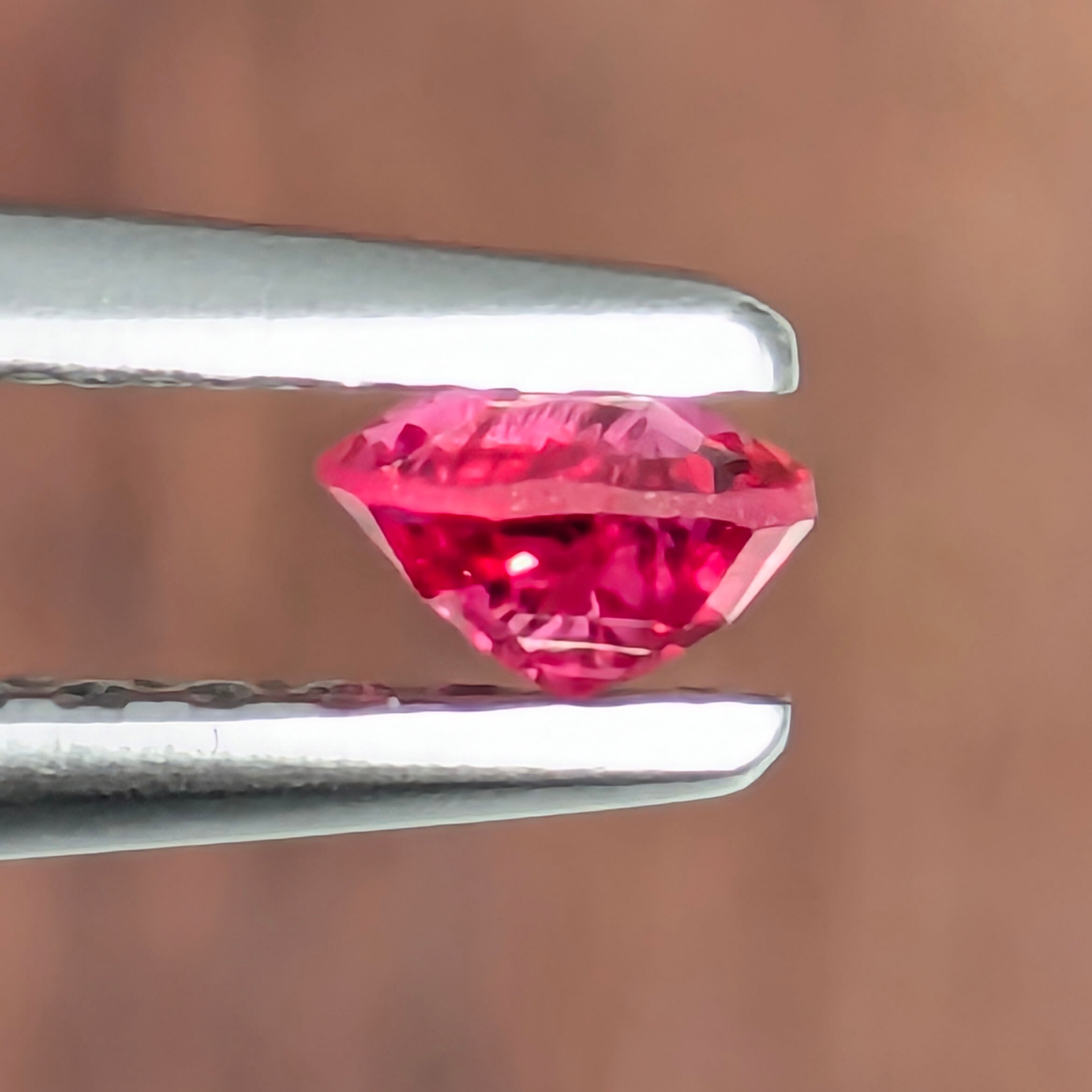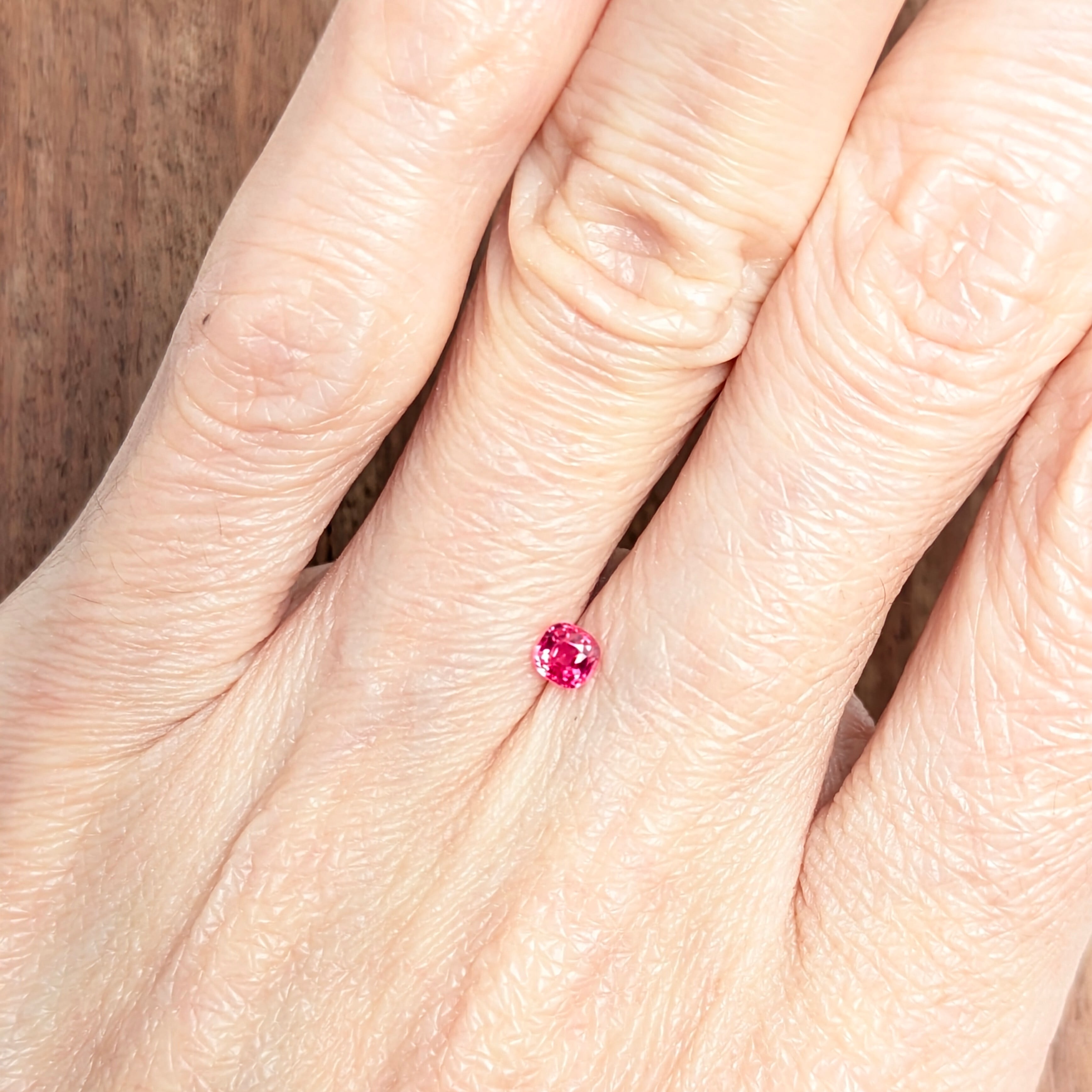 まさしく「ホットピンク」な熱量高めの1ピース。赤みも強いので個人的には「レデュッシュホットピンク」と呼びたくなるほどの色合いです。テーブル下にインクルージョンがありますが、絶妙な角度で入っているので、肉眼ではほとんど分かりません。小粒ながら鮮烈な輝きに目を奪われる1ピースです。