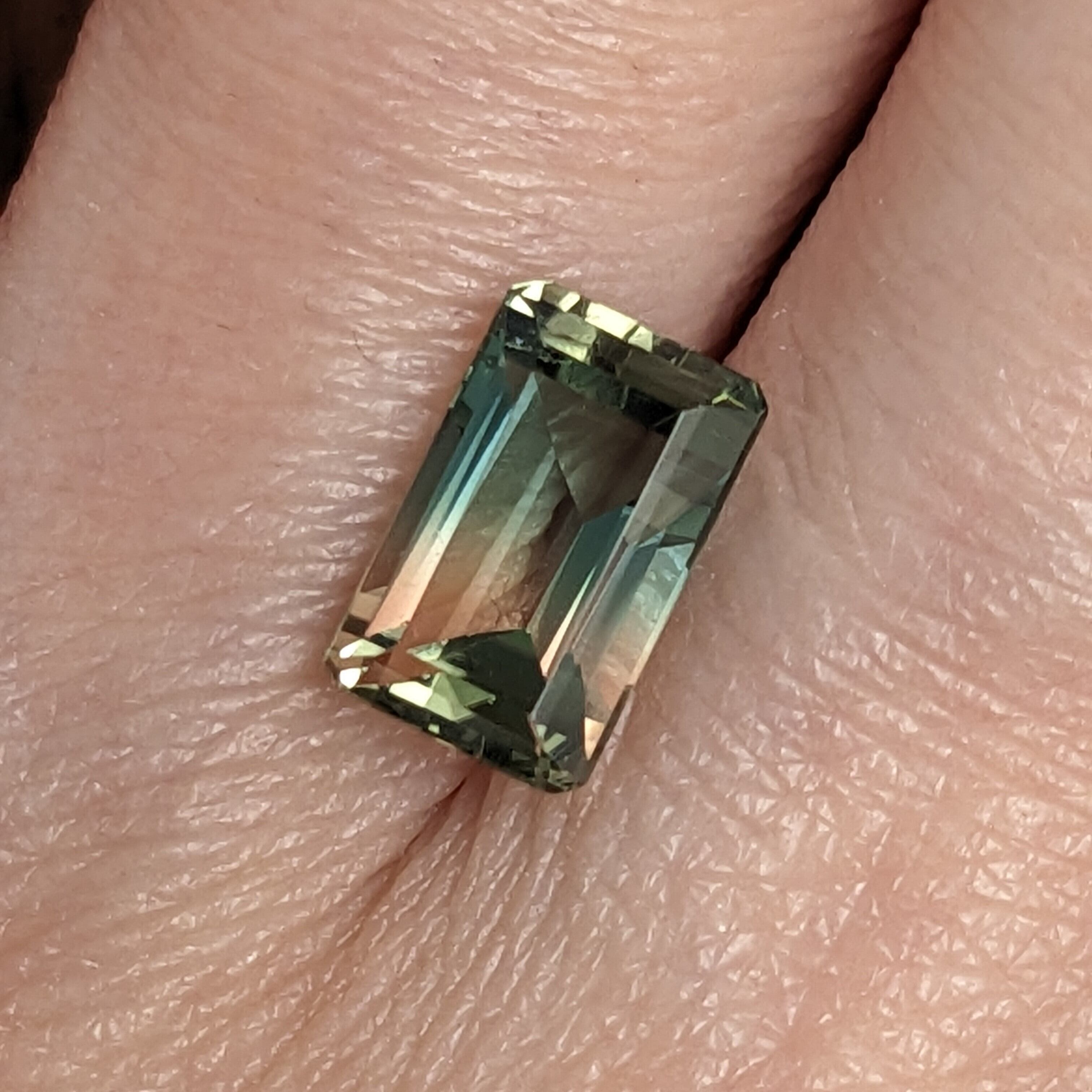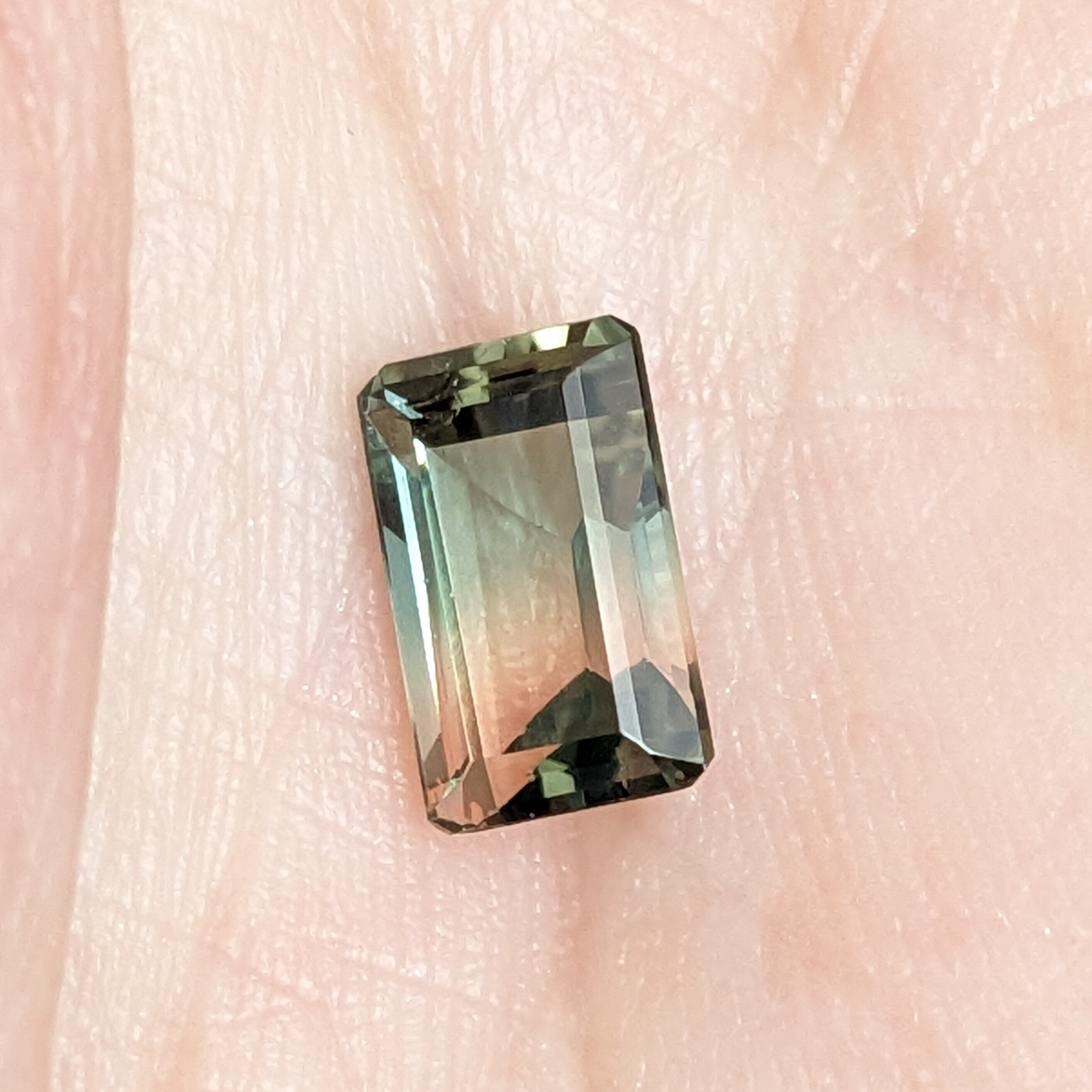 若干丸みを帯びたエメラルドカットにされたパーティカラードトルマリン。その色の移ろいがとても美しい1ピースです。色の連なりは青緑色~イエロー~橙赤色ですが、上面から見ると屈折の関係もあるのか、もう少し色合いが複雑に移ろっているように見えます。トルマリンはインクルージョンが多いことも少なくないのですが、この石は輝きや色合いを妨げるような、肉眼で美しさを損なうものはありません。成長過程において、周りの環境の変化で色が変わるといわれるトルマリン。はてさて、この結晶が成長する過程での地球では、何が起こっていたのでしょうか?