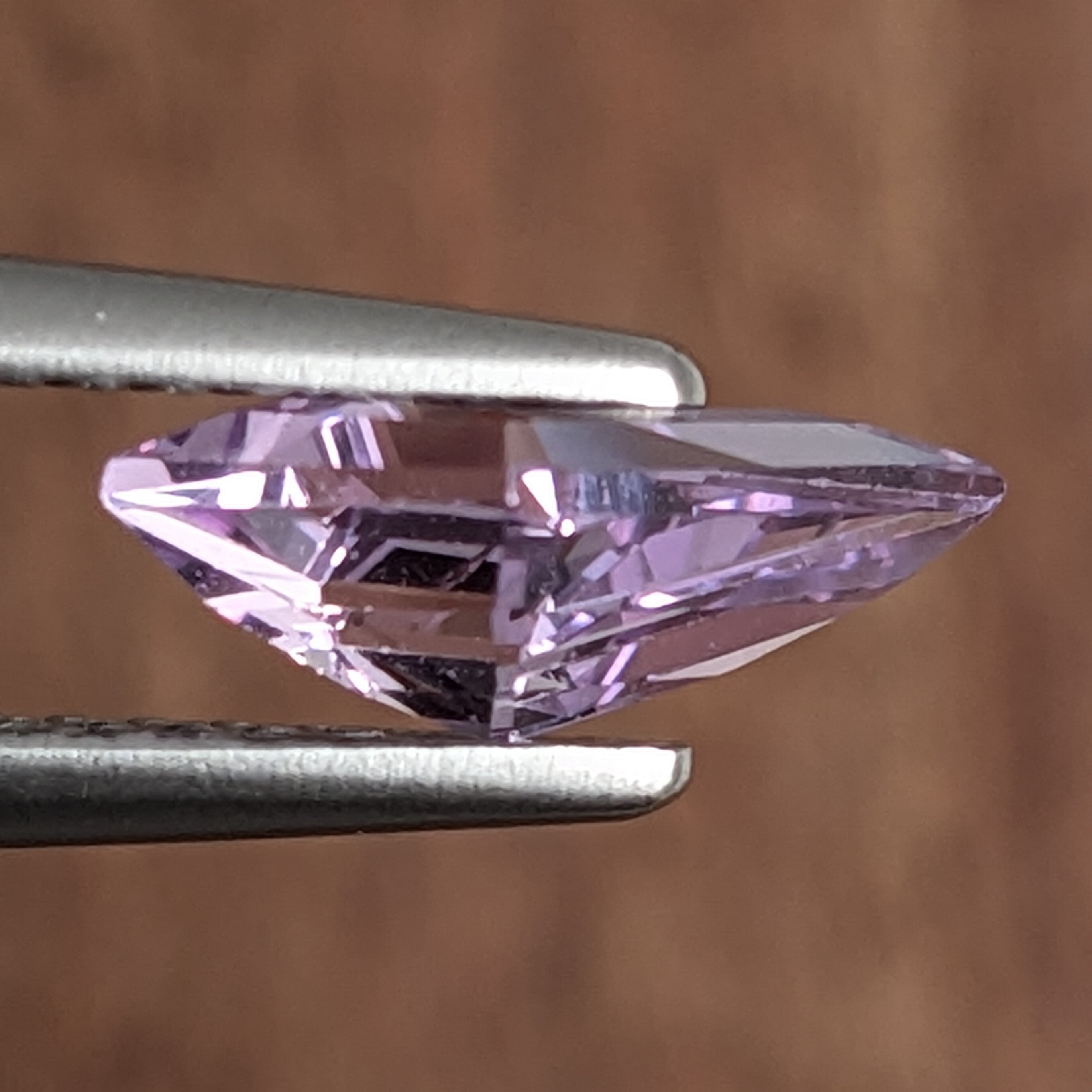 カイト型ですが、何となく十字架を思わせる厳かな美しさ。内部に一か所フェザーがありますが、肉眼では気になりません。パープル味をかんだ高貴な印象のピンク色です。
