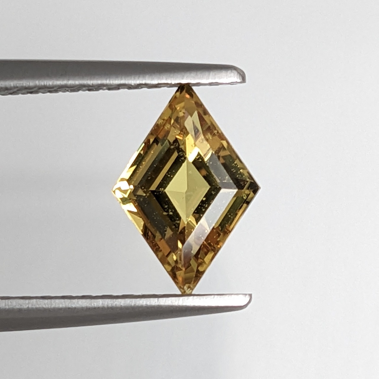 ありそうで意外と出会わない、ひし形のステップカットのイエローサファイアです。マダガスカル産の非加熱のイエローサファイア。「VIVID YELLOW(ビビッド イエロー)」という鮮やかな色合いで、渦を巻くように折り重なった直線からの輝きはまるで吸い込まれそうな美しさです。一切の調色を施さずにこの鮮やかな色合いを持つ個体は、まさに奇跡!ひし形という形の効果も相まって、まるで夕焼けに赤く染まる西の空に現れる一番星のように思わせる美しい輝きです。形も色合いもレアな1粒。いかがでしょうか?