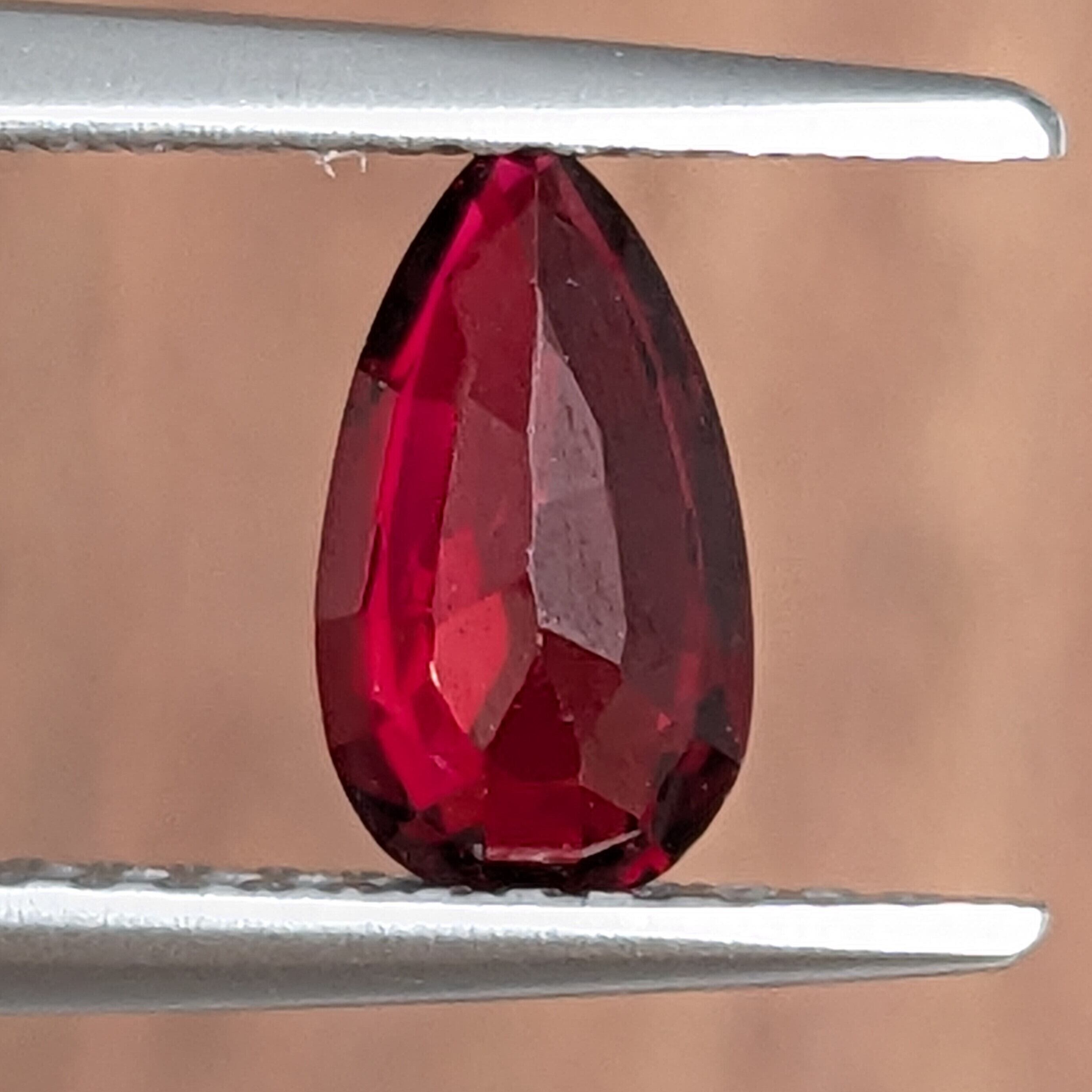 こちらのレッド・スピネルは、蛍光性はないものの「ビビッド・レッド」と評される美しく鮮やかな赤色が魅力的な1粒。肉眼で見ても、ルーペで覗いたらさらに「純然たる赤」という印象です。これ以上の赤色はありません!