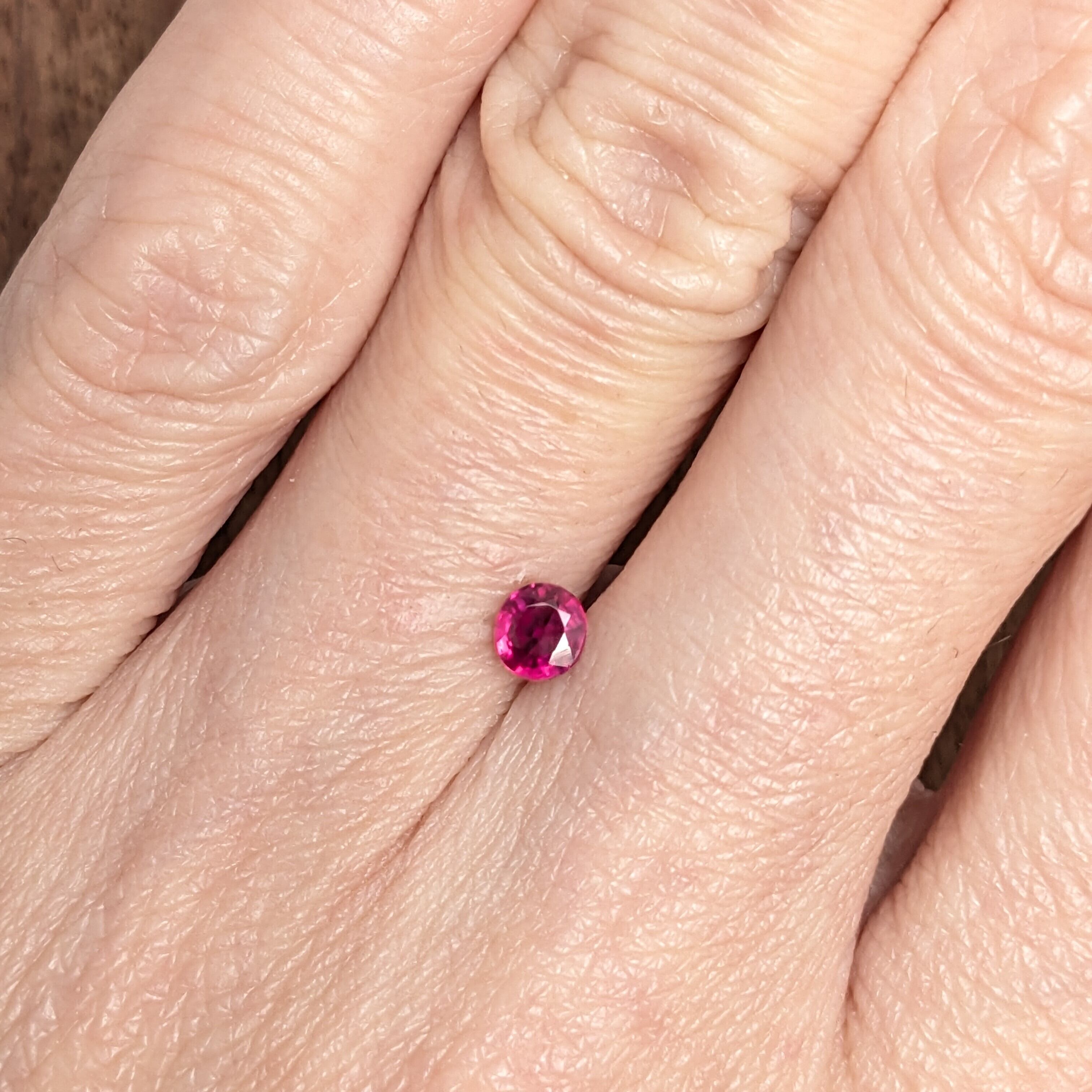 小粒ですが非常にクリアで、発光しているかのように輝くネオンレッドの1粒。鳩の血(ピジョン・ブラッド)と呼ばれる深い色合いよりも彩り豊かな輝きに魅了されるお石です。