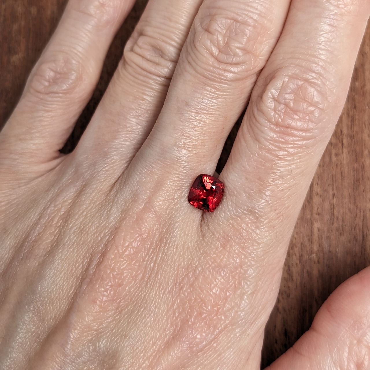 曲線の柔らかなクッションカットのスピネル。色相は「ORANGY RED」と、若干彩度の高い赤色になっています。赤色単色ではなくオレンジ色味をかむことで、より深みのある鮮やかさを感じます。スピネルはルビーと違い「単屈折性」の宝石なのでどの方向からでも安定的に同じ色を楽しむことができ、かつ硬度は「8」と耐久性にも優れているのでリングでもネックレスでも加工しやすいのが特徴。瞬く濃淡の赤色の輝きにウットリとしてしまいます。この石はパビリオン面(裏側)に小さなチップ(欠け)がありますが、これも天然石の醍醐味です。